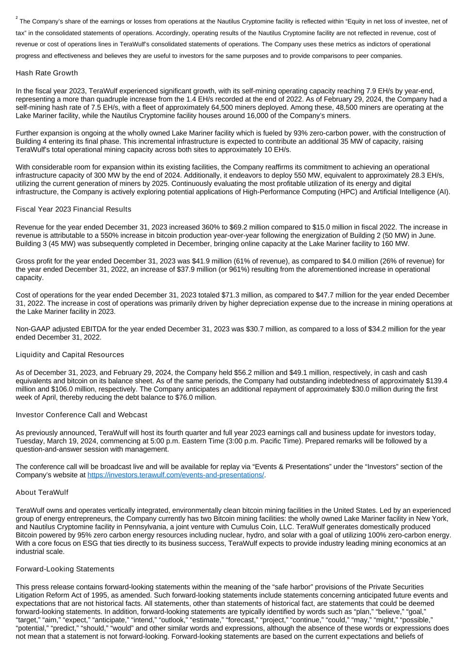 ² The Company’s share of the earnings or losses from operations at the Nautilus Cryptomine facility is reflected within “Equity in net loss of investee, net of tax” in the consolidated statements of operations. Accordingly, operating results of the Nautilus Cryptomine facility are not reflected in revenue, cost of revenue or cost of operations lines in TeraWulf’s consolidated statements of operations. The Company uses these metrics as indictors of operational progress and effectiveness and believes they are useful to investors for the same purposes and to provide comparisons to peer companies. Hash Rate Growth In the fiscal year 2023, TeraWulf experienced significant growth, with its self-mining operating capacity reaching 7.9 EH/s by year-end, representing a more than quadruple increase from the 1.4 EH/s recorded at the end of 2022. As of February 29, 2024, the Company had a self-mining hash rate of 7.5 EH/s, with a fleet of approximately 64,500 miners deployed. Among these, 48,500 miners are operating at the Lake Mariner facility, while the Nautilus Cryptomine facility houses around 16,000 of the Company’s miners. Further expansion is ongoing at the wholly owned Lake Mariner facility which is fueled by 93% zero-carbon power, with the construction of Building 4 entering its final phase. This incremental infrastructure is expected to contribute an additional 35 MW of capacity, raising TeraWulf’s total operational mining capacity across both sites to approximately 10 EH/s. With considerable room for expansion within its existing facilities, the Company reaffirms its commitment to achieving an operational infrastructure capacity of 300 MW by the end of 2024. Additionally, it endeavors to deploy 550 MW, equivalent to approximately 28.3 EH/s, utilizing the current generation of miners by 2025. Continuously evaluating the most profitable utilization of its energy and digital infrastructure, the Company is actively exploring potential applications of High-Performance Computing (HPC) and Artificial Intelligence (AI). Fiscal Year 2023 Financial Results Revenue for the year ended December 31, 2023 increased 360% to $69.2 million compared to $15.0 million in fiscal 2022. The increase in revenue is attributable to a 550% increase in bitcoin production year-over-year following the energization of Building 2 (50 MW) in June. Building 3 (45 MW) was subsequently completed in December, bringing online capacity at the Lake Mariner facility to 160 MW. Gross profit for the year ended December 31, 2023 was $41.9 million (61% of revenue), as compared to $4.0 million (26% of revenue) for the year ended December 31, 2022, an increase of $37.9 million (or 961%) resulting from the aforementioned increase in operational capacity. Cost of operations for the year ended December 31, 2023 totaled $71.3 million, as compared to $47.7 million for the year ended December 31, 2022. The increase in cost of operations was primarily driven by higher depreciation expense due to the increase in mining operations at the Lake Mariner facility in 2023. Non-GAAP adjusted EBITDA for the year ended December 31, 2023 was $30.7 million, as compared to a loss of $34.2 million for the year ended December 31, 2022. Liquidity and Capital Resources As of December 31, 2023, and February 29, 2024, the Company held $56.2 million and $49.1 million, respectively, in cash and cash equivalents and bitcoin on its balance sheet. As of the same periods, the Company had outstanding indebtedness of approximately $139.4 million and $106.0 million, respectively. The Company anticipates an additional repayment of approximately $30.0 million during the first week of April, thereby reducing the debt balance to $76.0 million. Investor Conference Call and Webcast As previously announced, TeraWulf will host its fourth quarter and full year 2023 earnings call and business update for investors today, Tuesday, March 19, 2024, commencing at 5:00 p.m. Eastern Time (3:00 p.m. Pacific Time). Prepared remarks will be followed by a question-and-answer session with management. The conference call will be broadcast live and will be available for replay via “Events & Presentations” under the “Investors” section of the Company’s website at https://investors.terawulf.com/events-and-presentations/. About TeraWulf TeraWulf owns and operates vertically integrated, environmentally clean bitcoin mining facilities in the United States. Led by an experienced group of energy entrepreneurs, the Company currently has two Bitcoin mining facilities: the wholly owned Lake Mariner facility in New York, and Nautilus Cryptomine facility in Pennsylvania, a joint venture with Cumulus Coin, LLC. TeraWulf generates domestically produced Bitcoin powered by 95% zero carbon energy resources including nuclear, hydro, and solar with a goal of utilizing 100% zero-carbon energy. With a core focus on ESG that ties directly to its business success, TeraWulf expects to provide industry leading mining economics at an industrial scale. Forward-Looking Statements This press release contains forward-looking statements within the meaning of the “safe harbor” provisions of the Private Securities Litigation Reform Act of 1995, as amended. Such forward-looking statements include statements concerning anticipated future events and expectations that are not historical facts. All statements, other than statements of historical fact, are statements that could be deemed forward-looking statements. In addition, forward-looking statements are typically identified by words such as “plan,” “believe,” “goal,” “target,” “aim,” “expect,” “anticipate,” “intend,” “outlook,” “estimate,” “forecast,” “project,” “continue,” “could,” “may,” “might,” “possible,” “potential,” “predict,” “should,” “would” and other similar words and expressions, although the absence of these words or expressions does not mean that a statem