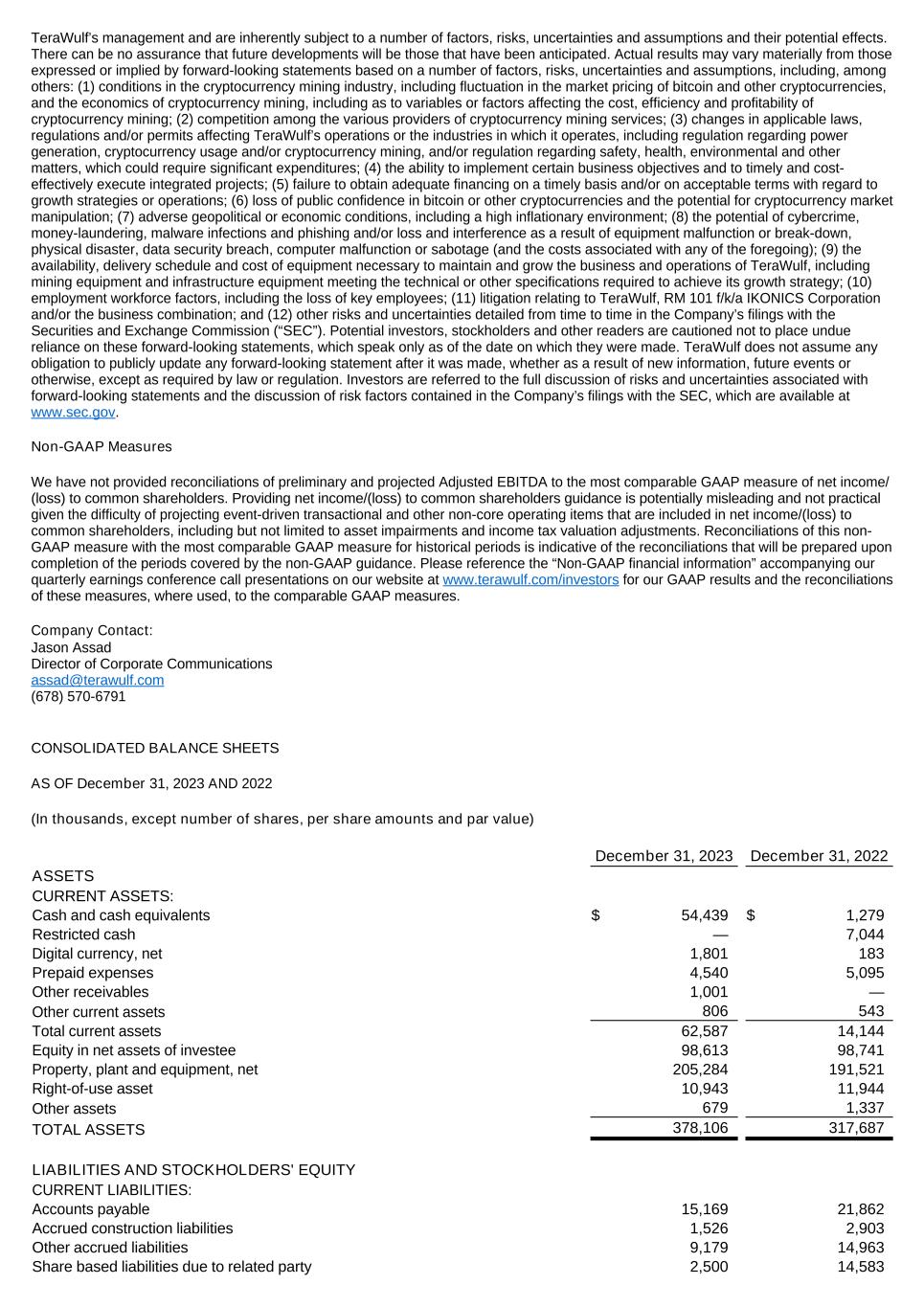 TeraWulf’s management and are inherently subject to a number of factors, risks, uncertainties and assumptions and their potential effects. There can be no assurance that future developments will be those that have been anticipated. Actual results may vary materially from those expressed or implied by forward-looking statements based on a number of factors, risks, uncertainties and assumptions, including, among others: (1) conditions in the cryptocurrency mining industry, including fluctuation in the market pricing of bitcoin and other cryptocurrencies, and the economics of cryptocurrency mining, including as to variables or factors affecting the cost, efficiency and profitability of cryptocurrency mining; (2) competition among the various providers of cryptocurrency mining services; (3) changes in applicable laws, regulations and/or permits affecting TeraWulf’s operations or the industries in which it operates, including regulation regarding power generation, cryptocurrency usage and/or cryptocurrency mining, and/or regulation regarding safety, health, environmental and other matters, which could require significant expenditures; (4) the ability to implement certain business objectives and to timely and cost- effectively execute integrated projects; (5) failure to obtain adequate financing on a timely basis and/or on acceptable terms with regard to growth strategies or operations; (6) loss of public confidence in bitcoin or other cryptocurrencies and the potential for cryptocurrency market manipulation; (7) adverse geopolitical or economic conditions, including a high inflationary environment; (8) the potential of cybercrime, money-laundering, malware infections and phishing and/or loss and interference as a result of equipment malfunction or break-down, physical disaster, data security breach, computer malfunction or sabotage (and the costs associated with any of the foregoing); (9) the availability, delivery schedule and cost of equipment necessary to maintain and grow the business and operations of TeraWulf, including mining equipment and infrastructure equipment meeting the technical or other specifications required to achieve its growth strategy; (10) employment workforce factors, including the loss of key employees; (11) litigation relating to TeraWulf, RM 101 f/k/a IKONICS Corporation and/or the business combination; and (12) other risks and uncertainties detailed from time to time in the Company’s filings with the Securities and Exchange Commission (“SEC”). Potential investors, stockholders and other readers are cautioned not to place undue reliance on these forward-looking statements, which speak only as of the date on which they were made. TeraWulf does not assume any obligation to publicly update any forward-looking statement after it was made, whether as a result of new information, future events or otherwise, except as required by law or regulation. Investors are referred to the full discussion of risks and uncertainties associated with forward-looking statements and the discussion of risk factors contained in the Company’s filings with the SEC, which are available at www.sec.gov. Non-GAAP Measures We have not provided reconciliations of preliminary and projected Adjusted EBITDA to the most comparable GAAP measure of net income/ (loss) to common shareholders. Providing net income/(loss) to common shareholders guidance is potentially misleading and not practical given the difficulty of projecting event-driven transactional and other non-core operating items that are included in net income/(loss) to common shareholders, including but not limited to asset impairments and income tax valuation adjustments. Reconciliations of this non- GAAP measure with the most comparable GAAP measure for historical periods is indicative of the reconciliations that will be prepared upon completion of the periods covered by the non-GAAP guidance. Please reference the “Non-GAAP financial information” accompanying our quarterly earnings conference call presentations on our website at www.terawulf.com/investors for our GAAP results and the reconciliations of these measures, where used, to the comparable GAAP measures. Company Contact: Jason Assad Director of Corporate Communications assad@terawulf.com (678) 570-6791 CONSOLIDATED BALANCE SHEETS AS OF December 31, 2023 AND 2022 (In thousands, except number of shares, per share amounts and par value)     December 31, 2023   December 31, 2022 ASSETS         CURRENT ASSETS:         Cash and cash equivalents   $ 54,439    $ 1,279   Restricted cash     —      7,044   Digital currency, net     1,801       183   Prepaid expenses     4,540       5,095   Other receivables     1,001       —  Other current assets     806       543   Total current assets     62,587       14,144   Equity in net assets of investee     98,613       98,741   Property, plant and equipment, net     205,284       191,521   Right-of-use asset     10,943       11,944   Other assets     679       1,337   TOTAL ASSETS     378,106       317,687             LIABILITIES AND STOCKHOLDERS' EQUITY         CURRENT LIABILITIES:         Accounts payable     15,169       21,862   Accrued construction liabilities     1,526       2,903   Other accrued liabilities     9,179       14,963   Share based liabilities due to related party     2,500       14,583