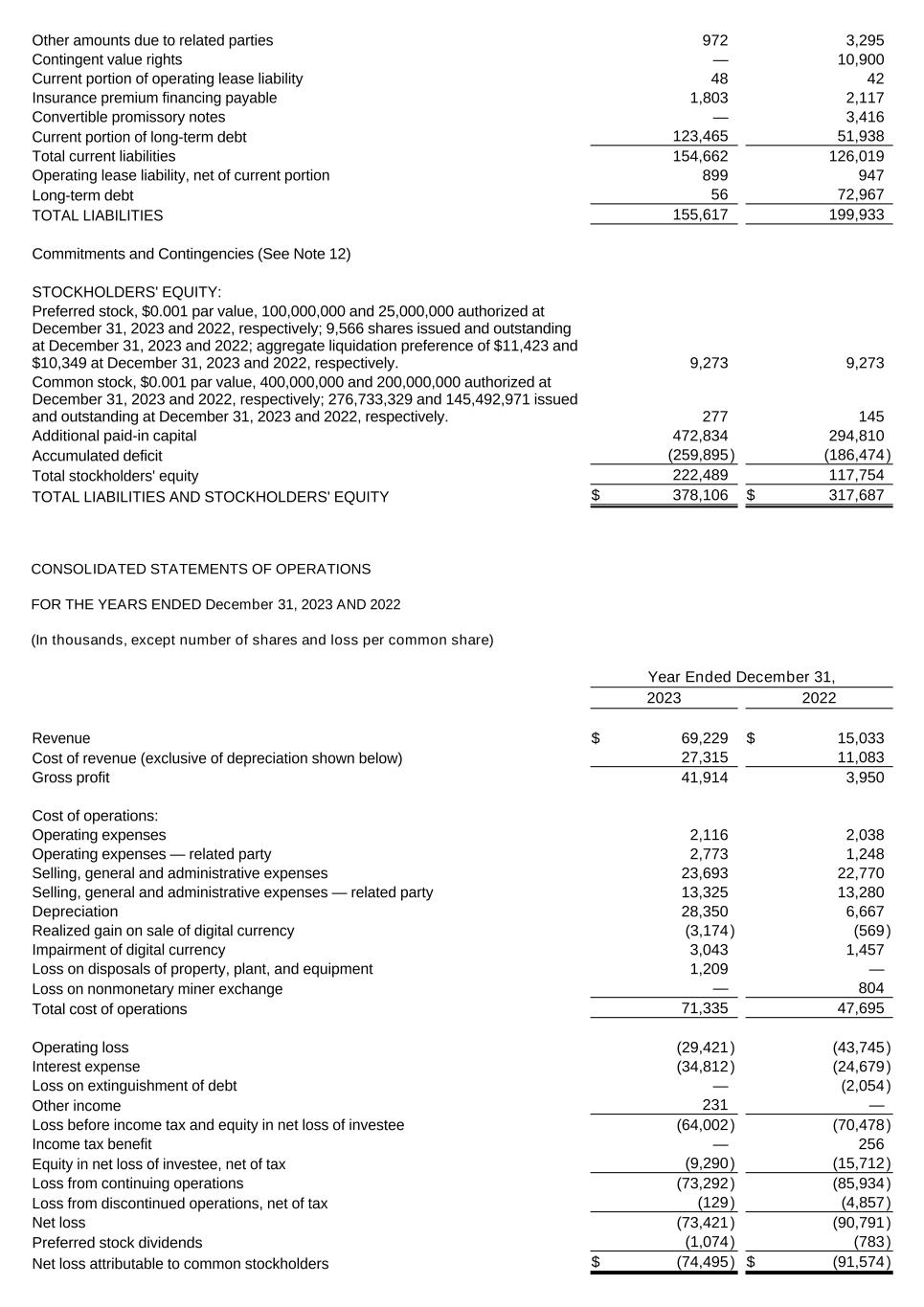 CONSOLIDATED STATEMENTS OF OPERATIONS FOR THE YEARS ENDED December 31, 2023 AND 2022 (In thousands, except number of shares and loss per common share) Other amounts due to related parties     972       3,295   Contingent value rights     —      10,900   Current portion of operating lease liability     48       42   Insurance premium financing payable     1,803       2,117   Convertible promissory notes     —      3,416   Current portion of long-term debt     123,465       51,938   Total current liabilities     154,662       126,019   Operating lease liability, net of current portion     899       947   Long-term debt     56       72,967   TOTAL LIABILITIES     155,617       199,933             Commitments and Contingencies (See Note 12)                   STOCKHOLDERS' EQUITY:         Preferred stock, $0.001 par value, 100,000,000 and 25,000,000 authorized at December 31, 2023 and 2022, respectively; 9,566 shares issued and outstanding at December 31, 2023 and 2022; aggregate liquidation preference of $11,423 and $10,349 at December 31, 2023 and 2022, respectively.     9,273       9,273   Common stock, $0.001 par value, 400,000,000 and 200,000,000 authorized at December 31, 2023 and 2022, respectively; 276,733,329 and 145,492,971 issued and outstanding at December 31, 2023 and 2022, respectively.     277       145   Additional paid-in capital     472,834       294,810   Accumulated deficit     (259,895)     (186,474) Total stockholders' equity     222,489       117,754   TOTAL LIABILITIES AND STOCKHOLDERS' EQUITY   $ 378,106    $ 317,687         Year Ended December 31,     2023   2022           Revenue   $ 69,229    $ 15,033   Cost of revenue (exclusive of depreciation shown below)     27,315       11,083   Gross profit     41,914       3,950             Cost of operations:         Operating expenses     2,116       2,038   Operating expenses — related party     2,773       1,248   Selling, general and administrative expenses     23,693       22,770   Selling, general and administrative expenses — related party     13,325       13,280   Depreciation     28,350       6,667   Realized gain on sale of digital currency     (3,174)     (569) Impairment of digital currency     3,043       1,457   Loss on disposals of property, plant, and equipment     1,209       —  Loss on nonmonetary miner exchange     —      804   Total cost of operations     71,335       47,695             Operating loss     (29,421)     (43,745) Interest expense     (34,812)     (24,679) Loss on extinguishment of debt     —      (2,054) Other income     231       —  Loss before income tax and equity in net loss of investee     (64,002)     (70,478) Income tax benefit     —      256   Equity in net loss of investee, net of tax     (9,290)     (15,712) Loss from continuing operations     (73,292)     (85,934) Loss from discontinued operations, net of tax     (129)     (4,857) Net loss     (73,421)     (90,791) Preferred stock dividends     (1,074)     (783) Net loss attributable to common stockholders   $ (74,495)  $ (91,574)