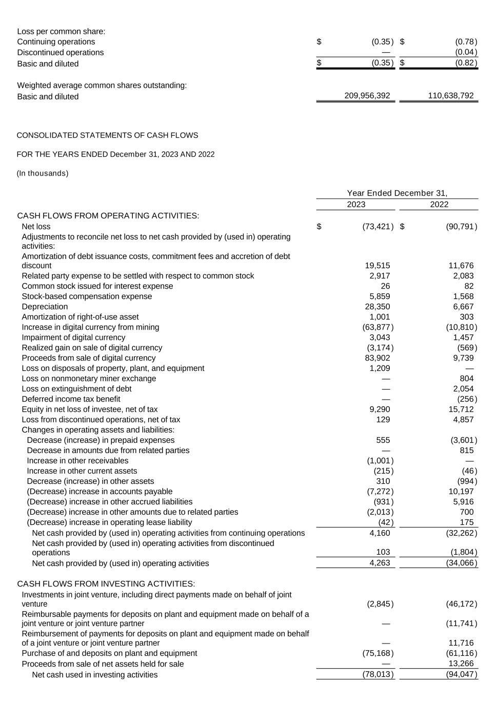 CONSOLIDATED STATEMENTS OF CASH FLOWS FOR THE YEARS ENDED December 31, 2023 AND 2022 (In thousands)           Loss per common share:         Continuing operations   $ (0.35)  $ (0.78) Discontinued operations     —      (0.04 ) Basic and diluted   $ (0.35)  $ (0.82)           Weighted average common shares outstanding:         Basic and diluted     209,956,392       110,638,792         Year Ended December 31,       2023       2022   CASH FLOWS FROM OPERATING ACTIVITIES:         Net loss   $ (73,421)   $ (90,791) Adjustments to reconcile net loss to net cash provided by (used in) operating activities:         Amortization of debt issuance costs, commitment fees and accretion of debt discount     19,515       11,676   Related party expense to be settled with respect to common stock     2,917       2,083   Common stock issued for interest expense     26       82   Stock-based compensation expense     5,859       1,568   Depreciation     28,350       6,667   Amortization of right-of-use asset     1,001       303   Increase in digital currency from mining     (63,877)     (10,810) Impairment of digital currency     3,043       1,457   Realized gain on sale of digital currency     (3,174)     (569) Proceeds from sale of digital currency     83,902       9,739   Loss on disposals of property, plant, and equipment     1,209       —  Loss on nonmonetary miner exchange     —      804   Loss on extinguishment of debt     —      2,054   Deferred income tax benefit     —      (256 ) Equity in net loss of investee, net of tax     9,290       15,712   Loss from discontinued operations, net of tax     129       4,857   Changes in operating assets and liabilities:         Decrease (increase) in prepaid expenses     555       (3,601) Decrease in amounts due from related parties     —      815   Increase in other receivables     (1,001)     —  Increase in other current assets     (215)     (46 ) Decrease (increase) in other assets     310       (994) (Decrease) increase in accounts payable     (7,272)     10,197   (Decrease) increase in other accrued liabilities     (931)     5,916   (Decrease) increase in other amounts due to related parties     (2,013)     700   (Decrease) increase in operating lease liability     (42 )     175   Net cash provided by (used in) operating activities from continuing operations     4,160       (32,262) Net cash provided by (used in) operating activities from discontinued operations     103       (1,804) Net cash provided by (used in) operating activities     4,263       (34,066)           CASH FLOWS FROM INVESTING ACTIVITIES:         Investments in joint venture, including direct payments made on behalf of joint venture     (2,845)     (46,172) Reimbursable payments for deposits on plant and equipment made on behalf of a joint venture or joint venture partner     —      (11,741) Reimbursement of payments for deposits on plant and equipment made on behalf of a joint venture or joint venture partner     —      11,716   Purchase of and deposits on plant and equipment     (75,168)     (61,116) Proceeds from sale of net assets held for sale     —      13,266   Net cash used in investing activities     (78,013)     (94,047)