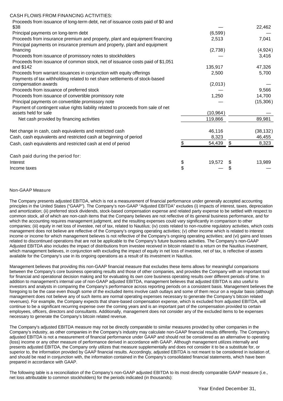 Non-GAAP Measure The Company presents adjusted EBITDA, which is not a measurement of financial performance under generally accepted accounting principles in the United States (“GAAP”). The Company’s non-GAAP “Adjusted EBITDA” excludes (i) impacts of interest, taxes, depreciation and amortization; (ii) preferred stock dividends, stock-based compensation expense and related party expense to be settled with respect to common stock, all of which are non-cash items that the Company believes are not reflective of its general business performance, and for which the accounting requires management judgment, and the resulting expenses could vary significantly in comparison to other companies; (iii) equity in net loss of investee, net of tax, related to Nautilus; (iv) costs related to non-routine regulatory activities, which costs management does not believe are reflective of the Company’s ongoing operating activities; (v) other income which is related to interest income or income for which management believes is not reflective of the Company’s ongoing operating activities; and (vi) gains and losses related to discontinued operations that are not be applicable to the Company’s future business activities. The Company’s non-GAAP Adjusted EBITDA also includes the impact of distributions from investee received in bitcoin related to a return on the Nautilus investment, which management believes, in conjunction with excluding the impact of equity in net loss of investee, net of tax, is reflective of assets available for the Company’s use in its ongoing operations as a result of its investment in Nautilus. Management believes that providing this non-GAAP financial measure that excludes these items allows for meaningful comparisons between the Company's core business operating results and those of other companies, and provides the Company with an important tool for financial and operational decision making and for evaluating its own core business operating results over different periods of time. In addition to management's internal use of non-GAAP adjusted EBITDA, management believes that adjusted EBITDA is also useful to investors and analysts in comparing the Company’s performance across reporting periods on a consistent basis. Management believes the foregoing to be the case even though some of the excluded items involve cash outlays and some of them recur on a regular basis (although management does not believe any of such items are normal operating expenses necessary to generate the Company’s bitcoin related revenues). For example, the Company expects that share-based compensation expense, which is excluded from adjusted EBITDA, will continue to be a significant recurring expense over the coming years and is an important part of the compensation provided to certain employees, officers, directors and consultants. Additionally, management does not consider any of the excluded items to be expenses necessary to generate the Company’s bitcoin related revenue. The Company's adjusted EBITDA measure may not be directly comparable to similar measures provided by other companies in the Company’s industry, as other companies in the Company’s industry may calculate non-GAAP financial results differently. The Company's adjusted EBITDA is not a measurement of financial performance under GAAP and should not be considered as an alternative to operating (loss) income or any other measure of performance derived in accordance with GAAP. Although management utilizes internally and presents adjusted EBITDA, the Company only utilizes that measure supplementally and does not consider it to be a substitute for, or superior to, the information provided by GAAP financial results. Accordingly, adjusted EBITDA is not meant to be considered in isolation of, and should be read in conjunction with, the information contained in the Company’s consolidated financial statements, which have been prepared in accordance with GAAP. The following table is a reconciliation of the Company’s non-GAAP adjusted EBITDA to its most directly comparable GAAP measure (i.e., net loss attributable to common stockholders) for the periods indicated (in thousands):           CASH FLOWS FROM FINANCING ACTIVITIES:         Proceeds from issuance of long-term debt, net of issuance costs paid of $0 and $38     —      22,462   Principal payments on long-term debt     (6,599)     —  Proceeds from insurance premium and property, plant and equipment financing     2,513       7,041   Principal payments on insurance premium and property, plant and equipment financing     (2,738)     (4,924) Proceeds from issuance of promissory notes to stockholders     —      3,416   Proceeds from issuance of common stock, net of issuance costs paid of $1,051 and $142     135,917       47,326   Proceeds from warrant issuances in conjunction with equity offerings     2,500       5,700   Payments of tax withholding related to net share settlements of stock-based compensation awards     (2,013)     —  Proceeds from issuance of preferred stock     —      9,566   Proceeds from issuance of convertible promissory note     1,250       14,700   Principal payments on convertible promissory note     —      (15,306) Payment of contingent value rights liability related to proceeds from sale of net assets held for sale     (10,964)     —  Net cash provided by financing activities     119,866       89,981             Net change in cash, cash equivalents and restricted cash     46,116       (38,132) Cash, cash equivalents and restricted cash at beginning of period     8,323       46,455   Cash, cash equivalents and restricted cash at end of period   $ 54,439     $ 8,323             Cash paid during the period for:         Interest   $ 19,572     $ 13,989   Income taxes   $ —    $ —        Year Ended December 31,