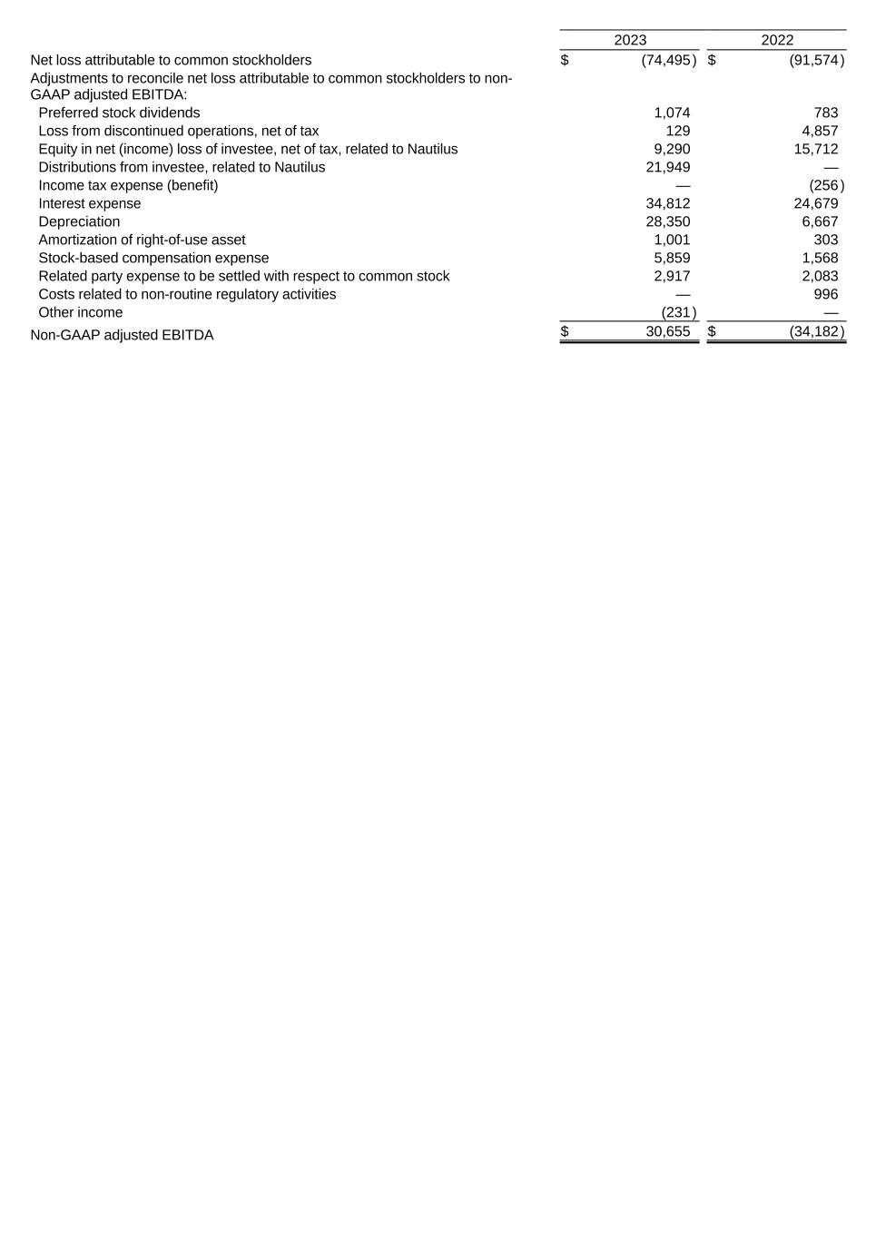 2023       2022   Net loss attributable to common stockholders   $ (74,495)   $ (91,574) Adjustments to reconcile net loss attributable to common stockholders to non- GAAP adjusted EBITDA:         Preferred stock dividends     1,074       783   Loss from discontinued operations, net of tax     129       4,857   Equity in net (income) loss of investee, net of tax, related to Nautilus     9,290       15,712   Distributions from investee, related to Nautilus     21,949       —  Income tax expense (benefit)     —      (256 ) Interest expense     34,812       24,679   Depreciation     28,350       6,667   Amortization of right-of-use asset     1,001       303   Stock-based compensation expense     5,859       1,568   Related party expense to be settled with respect to common stock     2,917       2,083   Costs related to non-routine regulatory activities     —      996   Other income     (231)     —  Non-GAAP adjusted EBITDA   $ 30,655     $ (34,182)