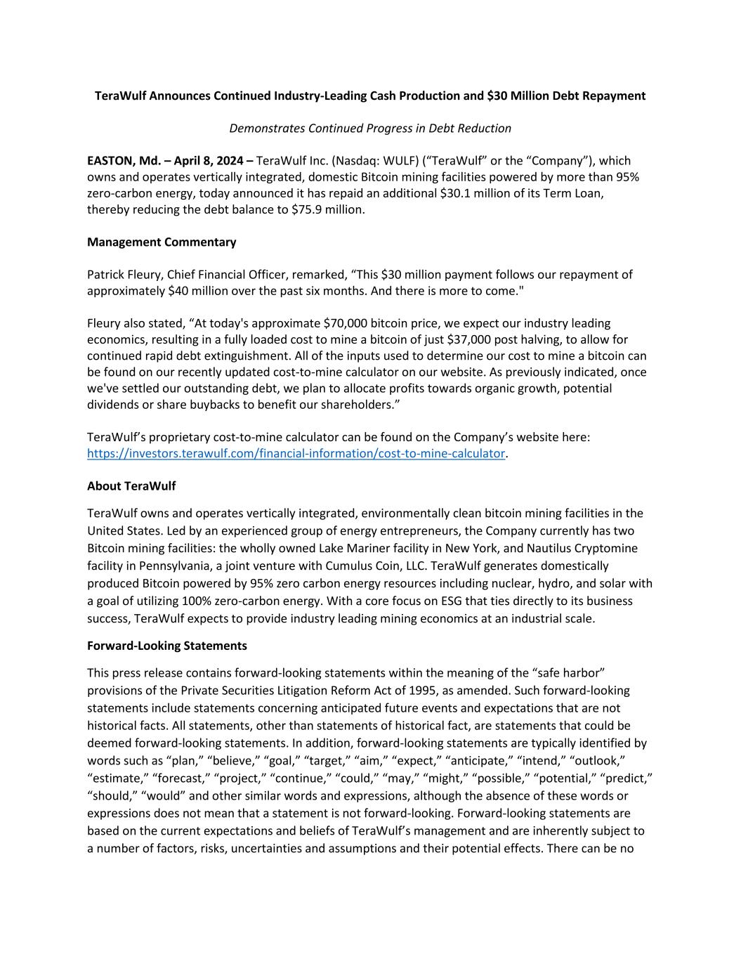 TeraWulf Announces Continued Industry-Leading Cash Production and $30 Million Debt Repayment Demonstrates Continued Progress in Debt Reduction EASTON, Md. – April 8, 2024 – TeraWulf Inc. (Nasdaq: WULF) (“TeraWulf” or the “Company”), which owns and operates vertically integrated, domestic Bitcoin mining facilities powered by more than 95% zero-carbon energy, today announced it has repaid an additional $30.1 million of its Term Loan, thereby reducing the debt balance to $75.9 million. Management Commentary Patrick Fleury, Chief Financial Officer, remarked, “This $30 million payment follows our repayment of approximately $40 million over the past six months. And there is more to come." Fleury also stated, “At today's approximate $70,000 bitcoin price, we expect our industry leading economics, resulting in a fully loaded cost to mine a bitcoin of just $37,000 post halving, to allow for continued rapid debt extinguishment. All of the inputs used to determine our cost to mine a bitcoin can be found on our recently updated cost-to-mine calculator on our website. As previously indicated, once we've settled our outstanding debt, we plan to allocate profits towards organic growth, potential dividends or share buybacks to benefit our shareholders.” TeraWulf’s proprietary cost-to-mine calculator can be found on the Company’s website here: https://investors.terawulf.com/financial-information/cost-to-mine-calculator. About TeraWulf TeraWulf owns and operates vertically integrated, environmentally clean bitcoin mining facilities in the United States. Led by an experienced group of energy entrepreneurs, the Company currently has two Bitcoin mining facilities: the wholly owned Lake Mariner facility in New York, and Nautilus Cryptomine facility in Pennsylvania, a joint venture with Cumulus Coin, LLC. TeraWulf generates domestically produced Bitcoin powered by 95% zero carbon energy resources including nuclear, hydro, and solar with a goal of utilizing 100% zero-carbon energy. With a core focus on ESG that ties directly to its business success, TeraWulf expects to provide industry leading mining economics at an industrial scale. Forward-Looking Statements This press release contains forward-looking statements within the meaning of the “safe harbor” provisions of the Private Securities Litigation Reform Act of 1995, as amended. Such forward-looking statements include statements concerning anticipated future events and expectations that are not historical facts. All statements, other than statements of historical fact, are statements that could be deemed forward-looking statements. In addition, forward-looking statements are typically identified by words such as “plan,” “believe,” “goal,” “target,” “aim,” “expect,” “anticipate,” “intend,” “outlook,” “estimate,” “forecast,” “project,” “continue,” “could,” “may,” “might,” “possible,” “potential,” “predict,” “should,” “would” and other similar words and expressions, although the absence of these words or expressions does not mean that a statement is not forward-looking. Forward-looking statements are based on the current expectations and beliefs of TeraWulf’s management and are inherently subject to a number of factors, risks, uncertainties and assumptions and their potential effects. There can be no