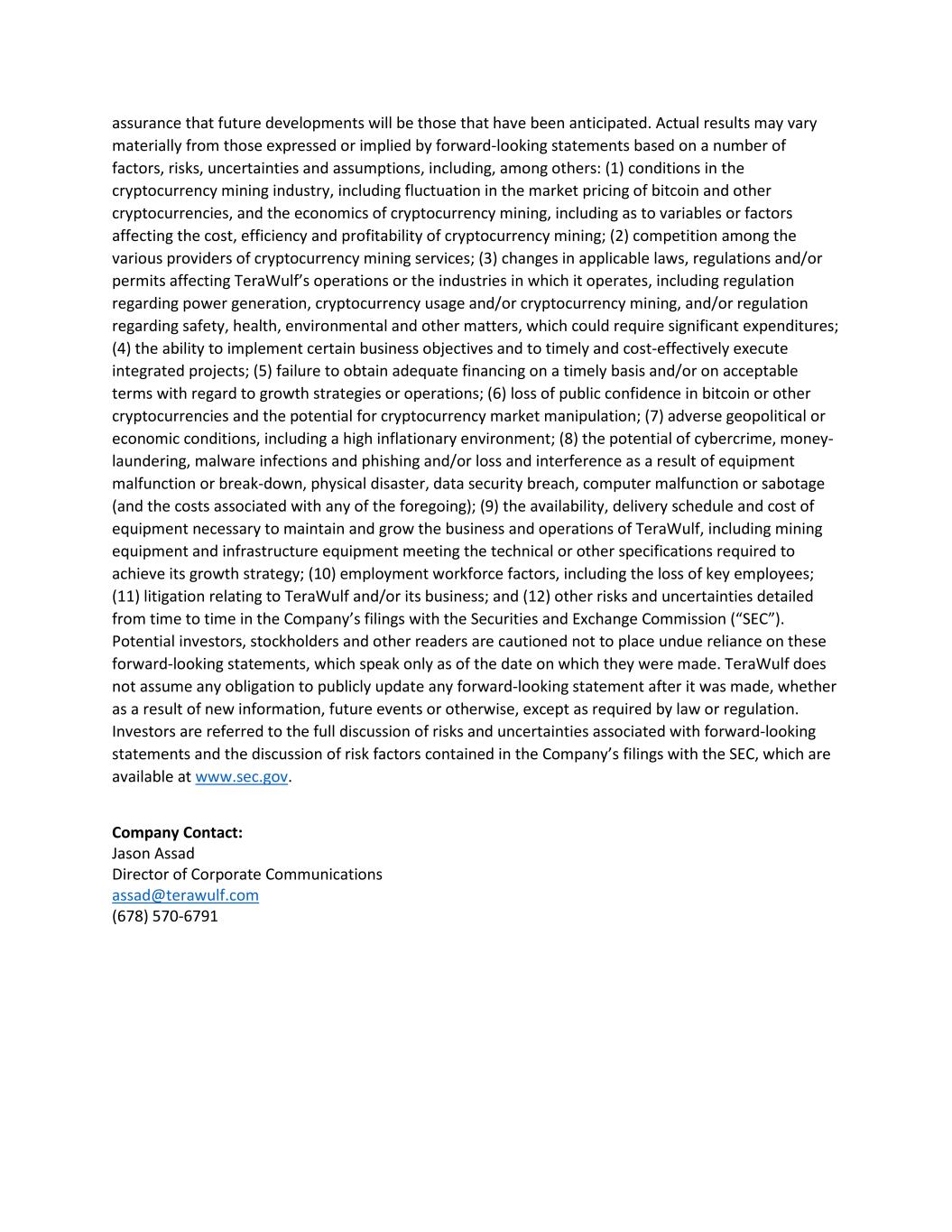 assurance that future developments will be those that have been anticipated. Actual results may vary materially from those expressed or implied by forward-looking statements based on a number of factors, risks, uncertainties and assumptions, including, among others: (1) conditions in the cryptocurrency mining industry, including fluctuation in the market pricing of bitcoin and other cryptocurrencies, and the economics of cryptocurrency mining, including as to variables or factors affecting the cost, efficiency and profitability of cryptocurrency mining; (2) competition among the various providers of cryptocurrency mining services; (3) changes in applicable laws, regulations and/or permits affecting TeraWulf’s operations or the industries in which it operates, including regulation regarding power generation, cryptocurrency usage and/or cryptocurrency mining, and/or regulation regarding safety, health, environmental and other matters, which could require significant expenditures; (4) the ability to implement certain business objectives and to timely and cost-effectively execute integrated projects; (5) failure to obtain adequate financing on a timely basis and/or on acceptable terms with regard to growth strategies or operations; (6) loss of public confidence in bitcoin or other cryptocurrencies and the potential for cryptocurrency market manipulation; (7) adverse geopolitical or economic conditions, including a high inflationary environment; (8) the potential of cybercrime, money- laundering, malware infections and phishing and/or loss and interference as a result of equipment malfunction or break-down, physical disaster, data security breach, computer malfunction or sabotage (and the costs associated with any of the foregoing); (9) the availability, delivery schedule and cost of equipment necessary to maintain and grow the business and operations of TeraWulf, including mining equipment and infrastructure equipment meeting the technical or other specifications required to achieve its growth strategy; (10) employment workforce factors, including the loss of key employees; (11) litigation relating to TeraWulf and/or its business; and (12) other risks and uncertainties detailed from time to time in the Company’s filings with the Securities and Exchange Commission (“SEC”). Potential investors, stockholders and other readers are cautioned not to place undue reliance on these forward-looking statements, which speak only as of the date on which they were made. TeraWulf does not assume any obligation to publicly update any forward-looking statement after it was made, whether as a result of new information, future events or otherwise, except as required by law or regulation. Investors are referred to the full discussion of risks and uncertainties associated with forward-looking statements and the discussion of risk factors contained in the Company’s filings with the SEC, which are available at www.sec.gov. Company Contact: Jason Assad Director of Corporate Communications assad@terawulf.com (678) 570-6791