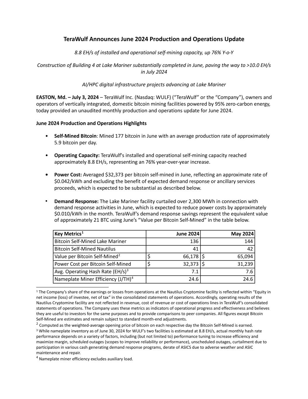 TeraWulf Announces June 2024 Production and Operations Update 8.8 EH/s of installed and operational self-mining capacity, up 76% Y-o-Y Construction of Building 4 at Lake Mariner substantially completed in June, paving the way to >10.0 EH/s in July 2024 AI/HPC digital infrastructure projects advancing at Lake Mariner EASTON, Md. – July 3, 2024 – TeraWulf Inc. (Nasdaq: WULF) (“TeraWulf” or the “Company”), owners and operators of vertically integrated, domestic bitcoin mining facilities powered by 95% zero-carbon energy, today provided an unaudited monthly production and operations update for June 2024. June 2024 Production and Operations Highlights • Self-Mined Bitcoin: Mined 177 bitcoin in June with an average production rate of approximately 5.9 bitcoin per day. • Operating Capacity: TeraWulf's installed and operational self-mining capacity reached approximately 8.8 EH/s, representing an 76% year-over-year increase. • Power Cost: Averaged $32,373 per bitcoin self-mined in June, reflecting an approximate rate of $0.042/kWh and excluding the benefit of expected demand response or ancillary services proceeds, which is expected to be substantial as described below. • Demand Response: The Lake Mariner facility curtailed over 2,300 MWh in connection with demand response activities in June, which is expected to reduce power costs by approximately $0.010/kWh in the month. TeraWulf’s demand response savings represent the equivalent value of approximately 21 BTC using June’s “Value per Bitcoin Self-Mined” in the table below. Key Metrics1 June 2024 May 2024 Bitcoin Self-Mined Lake Mariner 136 144 Bitcoin Self-Mined Nautilus 41 42 Value per Bitcoin Self-Mined2 $ 66,178 $ 65,094 Power Cost per Bitcoin Self-Mined $ 32,373 $ 31,239 Avg. Operating Hash Rate (EH/s)3 7.1 7.6 Nameplate Miner Efficiency (J/TH)4 24.6 24.6 1 The Company’s share of the earnings or losses from operations at the Nautilus Cryptomine facility is reflected within “Equity in net income (loss) of investee, net of tax” in the consolidated statements of operations. Accordingly, operating results of the Nautilus Cryptomine facility are not reflected in revenue, cost of revenue or cost of operations lines in TeraWulf’s consolidated statements of operations. The Company uses these metrics as indicators of operational progress and effectiveness and believes they are useful to investors for the same purposes and to provide comparisons to peer companies. All figures except Bitcoin Self-Mined are estimates and remain subject to standard month-end adjustments. 2 Computed as the weighted-average opening price of bitcoin on each respective day the Bitcoin Self-Mined is earned. 3 While nameplate inventory as of June 30, 2024 for WULF’s two facilities is estimated at 8.8 EH/s, actual monthly hash rate performance depends on a variety of factors, including (but not limited to) performance tuning to increase efficiency and maximize margin, scheduled outages (scopes to improve reliability or performance), unscheduled outages, curtailment due to participation in various cash generating demand response programs, derate of ASICS due to adverse weather and ASIC maintenance and repair. 4 Nameplate miner efficiency excludes auxiliary load.