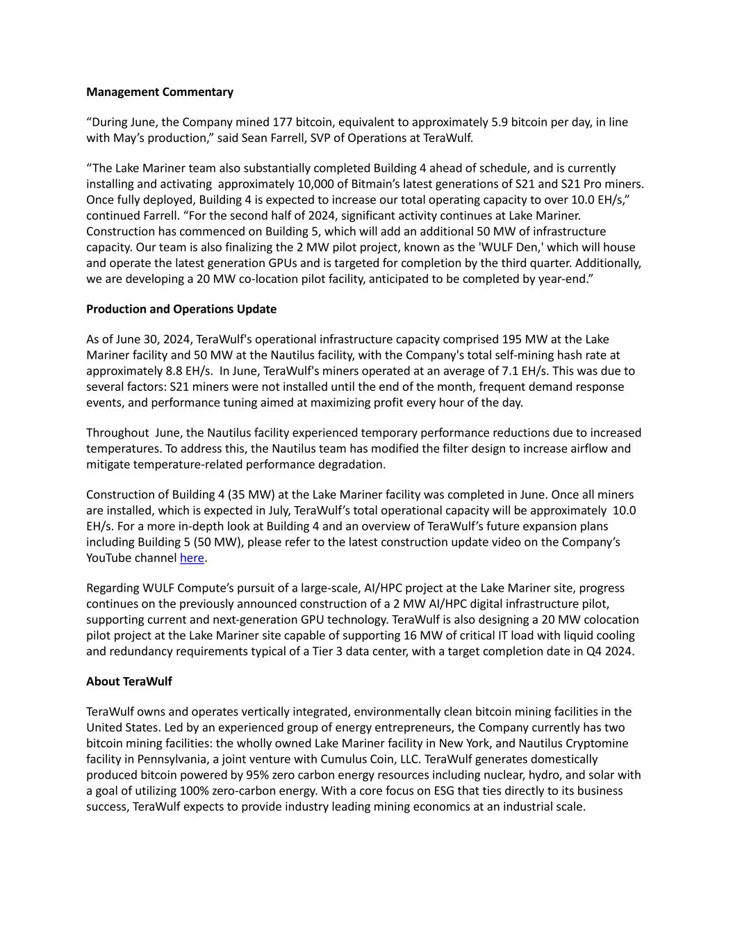 Management Commentary “During June, the Company mined 177 bitcoin, equivalent to approximately 5.9 bitcoin per day, in line with May’s production,” said Sean Farrell, SVP of Operations at TeraWulf. “The Lake Mariner team also substantially completed Building 4 ahead of schedule, and is currently installing and activating approximately 10,000 of Bitmain’s latest generations of S21 and S21 Pro miners. Once fully deployed, Building 4 is expected to increase our total operating capacity to over 10.0 EH/s,” continued Farrell. “For the second half of 2024, significant activity continues at Lake Mariner. Construction has commenced on Building 5, which will add an additional 50 MW of infrastructure capacity. Our team is also finalizing the 2 MW pilot project, known as the 'WULF Den,' which will house and operate the latest generation GPUs and is targeted for completion by the third quarter. Additionally, we are developing a 20 MW co-location pilot facility, anticipated to be completed by year-end.” Production and Operations Update As of June 30, 2024, TeraWulf's operational infrastructure capacity comprised 195 MW at the Lake Mariner facility and 50 MW at the Nautilus facility, with the Company's total self-mining hash rate at approximately 8.8 EH/s. In June, TeraWulf's miners operated at an average of 7.1 EH/s. This was due to several factors: S21 miners were not installed until the end of the month, frequent demand response events, and performance tuning aimed at maximizing profit every hour of the day. Throughout June, the Nautilus facility experienced temporary performance reductions due to increased temperatures. To address this, the Nautilus team has modified the filter design to increase airflow and mitigate temperature-related performance degradation. Construction of Building 4 (35 MW) at the Lake Mariner facility was completed in June. Once all miners are installed, which is expected in July, TeraWulf’s total operational capacity will be approximately 10.0 EH/s. For a more in-depth look at Building 4 and an overview of TeraWulf’s future expansion plans including Building 5 (50 MW), please refer to the latest construction update video on the Company’s YouTube channel here. Regarding WULF Compute’s pursuit of a large-scale, AI/HPC project at the Lake Mariner site, progress continues on the previously announced construction of a 2 MW AI/HPC digital infrastructure pilot, supporting current and next-generation GPU technology. TeraWulf is also designing a 20 MW colocation pilot project at the Lake Mariner site capable of supporting 16 MW of critical IT load with liquid cooling and redundancy requirements typical of a Tier 3 data center, with a target completion date in Q4 2024. About TeraWulf TeraWulf owns and operates vertically integrated, environmentally clean bitcoin mining facilities in the United States. Led by an experienced group of energy entrepreneurs, the Company currently has two bitcoin mining facilities: the wholly owned Lake Mariner facility in New York, and Nautilus Cryptomine facility in Pennsylvania, a joint venture with Cumulus Coin, LLC. TeraWulf generates domestically produced bitcoin powered by 95% zero carbon energy resources including nuclear, hydro, and solar with a goal of utilizing 100% zero-carbon energy. With a core focus on ESG that ties directly to its business success, TeraWulf expects to provide industry leading mining economics at an industrial scale.