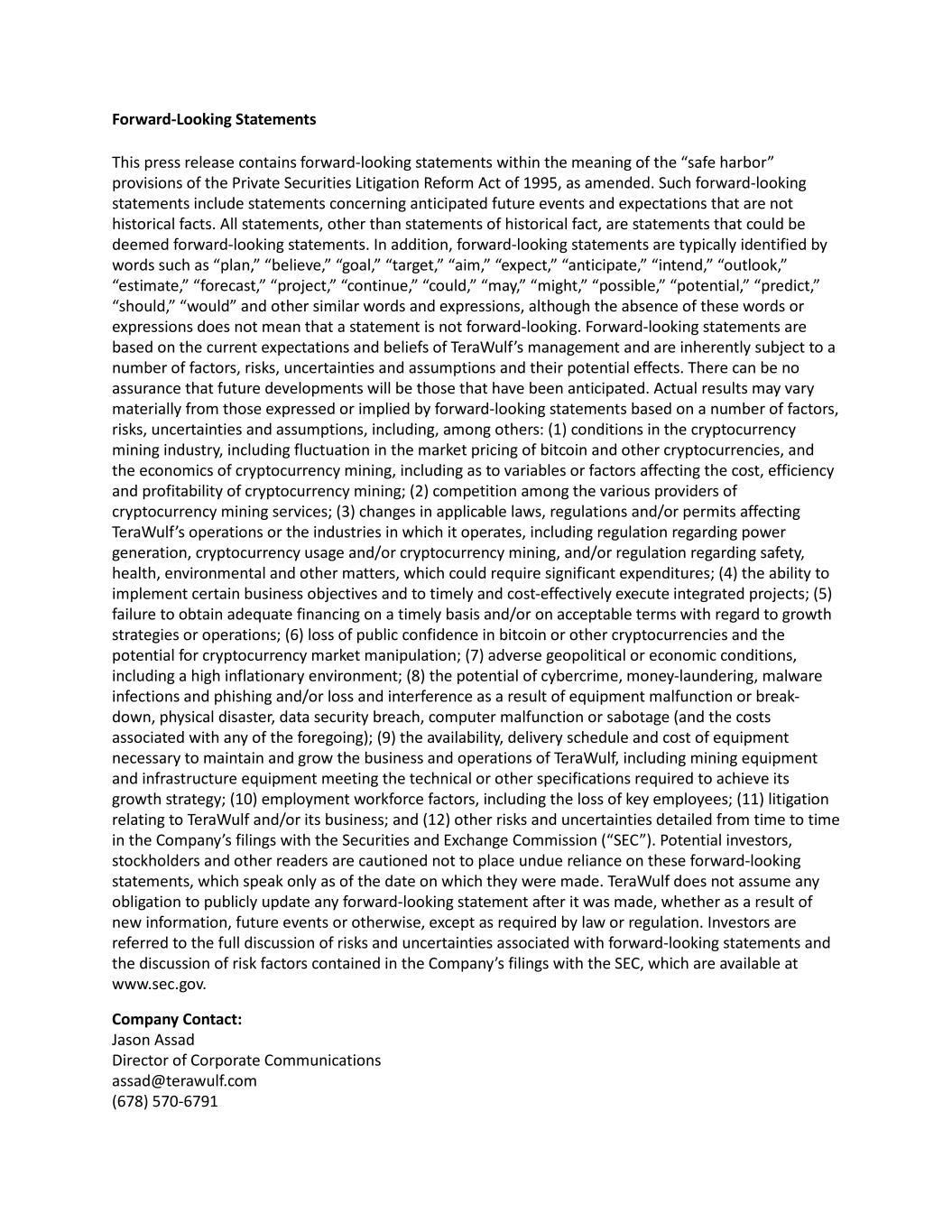 Forward-Looking Statements This press release contains forward-looking statements within the meaning of the “safe harbor” provisions of the Private Securities Litigation Reform Act of 1995, as amended. Such forward-looking statements include statements concerning anticipated future events and expectations that are not historical facts. All statements, other than statements of historical fact, are statements that could be deemed forward-looking statements. In addition, forward-looking statements are typically identified by words such as “plan,” “believe,” “goal,” “target,” “aim,” “expect,” “anticipate,” “intend,” “outlook,” “estimate,” “forecast,” “project,” “continue,” “could,” “may,” “might,” “possible,” “potential,” “predict,” “should,” “would” and other similar words and expressions, although the absence of these words or expressions does not mean that a statement is not forward-looking. Forward-looking statements are based on the current expectations and beliefs of TeraWulf’s management and are inherently subject to a number of factors, risks, uncertainties and assumptions and their potential effects. There can be no assurance that future developments will be those that have been anticipated. Actual results may vary materially from those expressed or implied by forward-looking statements based on a number of factors, risks, uncertainties and assumptions, including, among others: (1) conditions in the cryptocurrency mining industry, including fluctuation in the market pricing of bitcoin and other cryptocurrencies, and the economics of cryptocurrency mining, including as to variables or factors affecting the cost, efficiency and profitability of cryptocurrency mining; (2) competition among the various providers of cryptocurrency mining services; (3) changes in applicable laws, regulations and/or permits affecting TeraWulf’s operations or the industries in which it operates, including regulation regarding power generation, cryptocurrency usage and/or cryptocurrency mining, and/or regulation regarding safety, health, environmental and other matters, which could require significant expenditures; (4) the ability to implement certain business objectives and to timely and cost-effectively execute integrated projects; (5) failure to obtain adequate financing on a timely basis and/or on acceptable terms with regard to growth strategies or operations; (6) loss of public confidence in bitcoin or other cryptocurrencies and the potential for cryptocurrency market manipulation; (7) adverse geopolitical or economic conditions, including a high inflationary environment; (8) the potential of cybercrime, money-laundering, malware infections and phishing and/or loss and interference as a result of equipment malfunction or break- down, physical disaster, data security breach, computer malfunction or sabotage (and the costs associated with any of the foregoing); (9) the availability, delivery schedule and cost of equipment necessary to maintain and grow the business and operations of TeraWulf, including mining equipment and infrastructure equipment meeting the technical or other specifications required to achieve its growth strategy; (10) employment workforce factors, including the loss of key employees; (11) litigation relating to TeraWulf and/or its business; and (12) other risks and uncertainties detailed from time to time in the Company’s filings with the Securities and Exchange Commission (“SEC”). Potential investors, stockholders and other readers are cautioned not to place undue reliance on these forward-looking statements, which speak only as of the date on which they were made. TeraWulf does not assume any obligation to publicly update any forward-looking statement after it was made, whether as a result of new information, future events or otherwise, except as required by law or regulation. Investors are referred to the full discussion of risks and uncertainties associated with forward-looking statements and the discussion of risk factors contained in the Company’s filings with the SEC, which are available at www.sec.gov. Company Contact: Jason Assad Director of Corporate Communications assad@terawulf.com (678) 570-6791