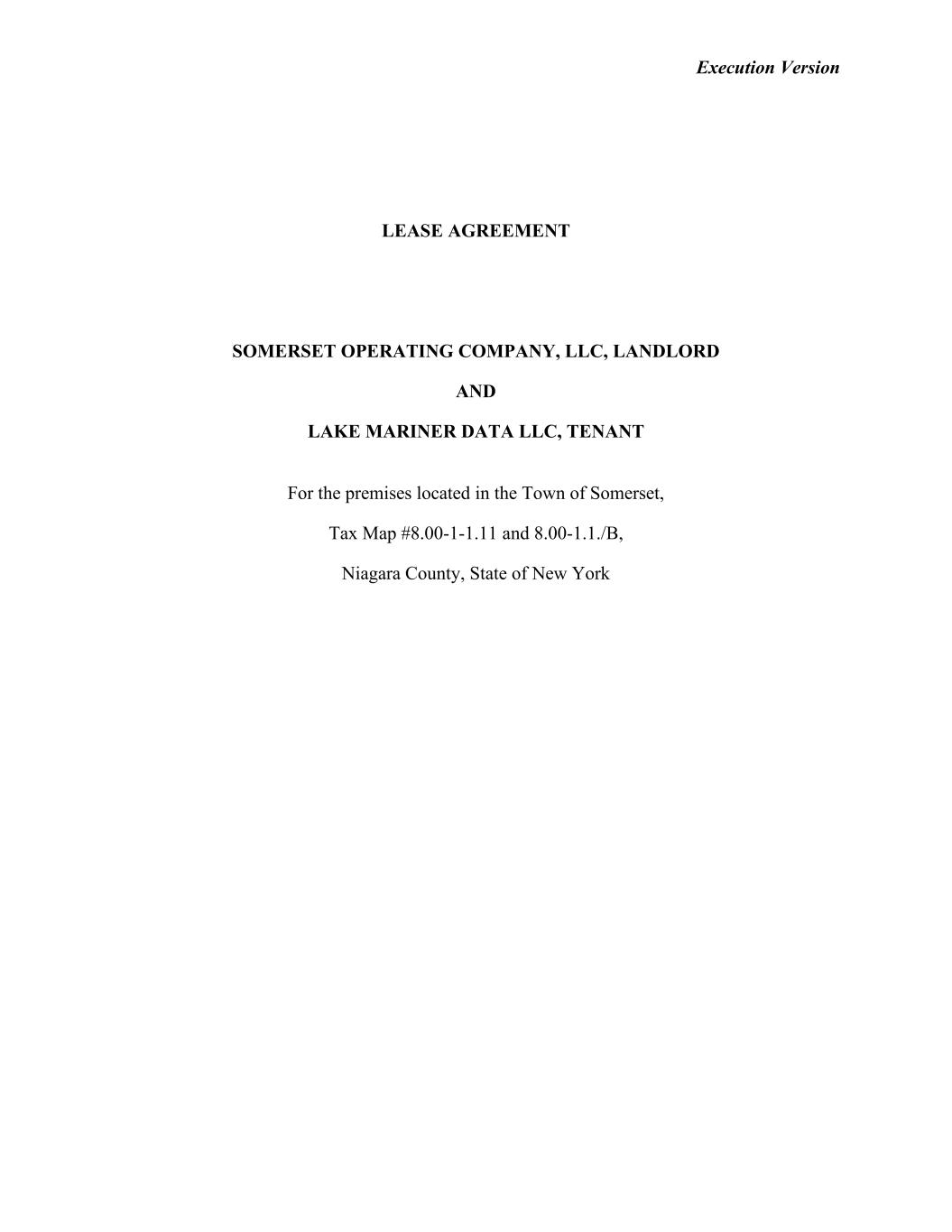 Execution Version LEASE AGREEMENT SOMERSET OPERATING COMPANY, LLC, LANDLORD AND LAKE MARINER DATA LLC, TENANT For the premises located in the Town of Somerset, Tax Map #8.00-1-1.11 and 8.00-1.1./B, Niagara County, State of New York