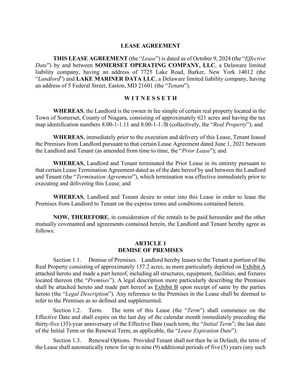 LEASE AGREEMENT THIS LEASE AGREEMENT (the “Lease”) is dated as of October 9, 2024 (the “Effective Date”) by and between SOMERSET OPERATING COMPANY, LLC, a Delaware limited liability company, having an address of 7725 Lake Road, Barker, New York 14012 (the “Landlord”) and LAKE MARINER DATA LLC, a Delaware limited liability company, having an address of 5 Federal Street, Easton, MD 21601 (the “Tenant”). W I T N E S S E T H WHEREAS, the Landlord is the owner in fee simple of certain real property located in the Town of Somerset, County of Niagara, consisting of approximately 621 acres and having the tax map identification numbers 8.00-1-1.11 and 8.00-1-1./B (collectively, the “Real Property”); and WHEREAS, immediately prior to the execution and delivery of this Lease, Tenant leased the Premises from Landlord pursuant to that certain Lease Agreement dated June 1, 2021 between the Landlord and Tenant (as amended from time to time, the “Prior Lease”); and WHEREAS, Landlord and Tenant terminated the Prior Lease in its entirety pursuant to that certain Lease Termination Agreement dated as of the date hereof by and between the Landlord and Tenant (the “Termination Agreement”), which termination was effective immediately prior to executing and delivering this Lease; and WHEREAS, Landlord and Tenant desire to enter into this Lease in order to lease the Premises from Landlord to Tenant on the express terms and conditions contained herein. NOW, THEREFORE, in consideration of the rentals to be paid hereunder and the other mutually covenanted and agreements contained herein, the Landlord and Tenant hereby agree as follows: ARTICLE 1 DEMISE OF PREMISES Section 1.1. Demise of Premises. Landlord hereby leases to the Tenant a portion of the Real Property consisting of approximately 157.2 acres, as more particularly depicted on Exhibit A attached hereto and made a part hereof, including all structures, equipment, facilities, and fixtures located thereon (the “Premises”). A legal description more particularly describing the Premises shall be attached hereto and made part hereof as Exhibit B upon receipt of same by the parties hereto (the “Legal Description”). Any reference to the Premises in the Lease shall be deemed to refer to the Premises as so defined and supplemented. Section 1.2. Term. The term of this Lease (the “Term”) shall commence on the Effective Date and shall expire on the last day of the calendar month immediately preceding the thirty-five (35)-year anniversary of the Effective Date (such term, the “Initial Term”; the last date of the Initial Term or the Renewal Term, as applicable, the “Lease Expiration Date”). Section 1.3. Renewal Options. Provided Tenant shall not then be in Default, the term of the Lease shall automatically renew for up to nine (9) additional periods of five (5) years (any such