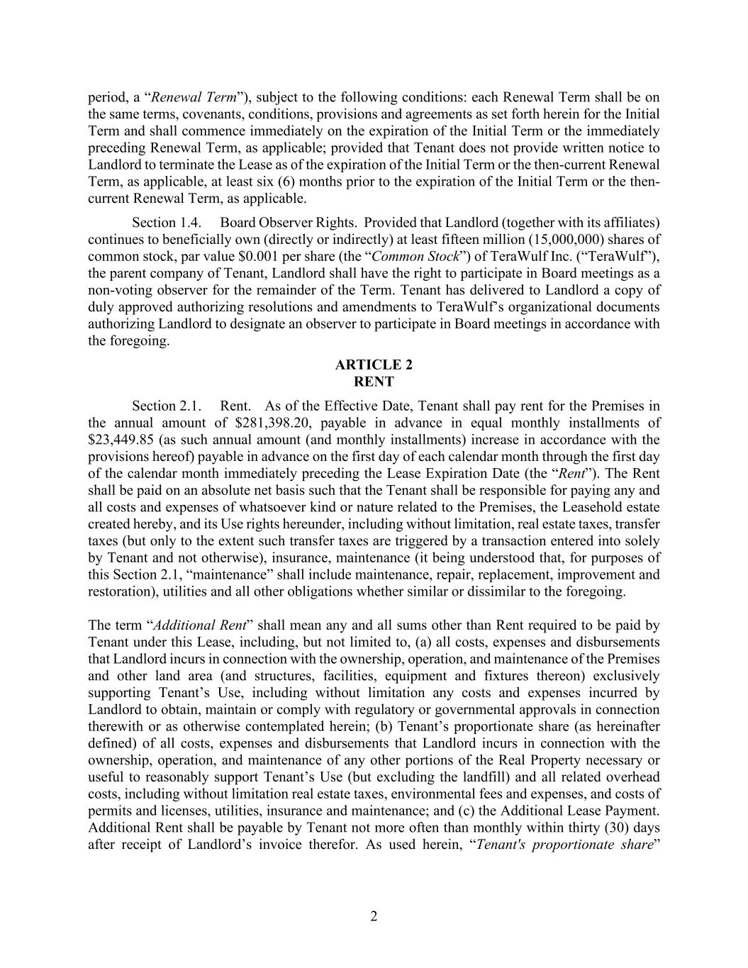 2 period, a “Renewal Term”), subject to the following conditions: each Renewal Term shall be on the same terms, covenants, conditions, provisions and agreements as set forth herein for the Initial Term and shall commence immediately on the expiration of the Initial Term or the immediately preceding Renewal Term, as applicable; provided that Tenant does not provide written notice to Landlord to terminate the Lease as of the expiration of the Initial Term or the then-current Renewal Term, as applicable, at least six (6) months prior to the expiration of the Initial Term or the then- current Renewal Term, as applicable. Section 1.4. Board Observer Rights. Provided that Landlord (together with its affiliates) continues to beneficially own (directly or indirectly) at least fifteen million (15,000,000) shares of common stock, par value $0.001 per share (the “Common Stock”) of TeraWulf Inc. (“TeraWulf”), the parent company of Tenant, Landlord shall have the right to participate in Board meetings as a non-voting observer for the remainder of the Term. Tenant has delivered to Landlord a copy of duly approved authorizing resolutions and amendments to TeraWulf’s organizational documents authorizing Landlord to designate an observer to participate in Board meetings in accordance with the foregoing. ARTICLE 2 RENT Section 2.1. Rent. As of the Effective Date, Tenant shall pay rent for the Premises in the annual amount of $281,398.20, payable in advance in equal monthly installments of $23,449.85 (as such annual amount (and monthly installments) increase in accordance with the provisions hereof) payable in advance on the first day of each calendar month through the first day of the calendar month immediately preceding the Lease Expiration Date (the “Rent”). The Rent shall be paid on an absolute net basis such that the Tenant shall be responsible for paying any and all costs and expenses of whatsoever kind or nature related to the Premises, the Leasehold estate created hereby, and its Use rights hereunder, including without limitation, real estate taxes, transfer taxes (but only to the extent such transfer taxes are triggered by a transaction entered into solely by Tenant and not otherwise), insurance, maintenance (it being understood that, for purposes of this Section 2.1, “maintenance” shall include maintenance, repair, replacement, improvement and restoration), utilities and all other obligations whether similar or dissimilar to the foregoing. The term “Additional Rent” shall mean any and all sums other than Rent required to be paid by Tenant under this Lease, including, but not limited to, (a) all costs, expenses and disbursements that Landlord incurs in connection with the ownership, operation, and maintenance of the Premises and other land area (and structures, facilities, equipment and fixtures thereon) exclusively supporting Tenant’s Use, including without limitation any costs and expenses incurred by Landlord to obtain, maintain or comply with regulatory or governmental approvals in connection therewith or as otherwise contemplated herein; (b) Tenant’s proportionate share (as hereinafter defined) of all costs, expenses and disbursements that Landlord incurs in connection with the ownership, operation, and maintenance of any other portions of the Real Property necessary or useful to reasonably support Tenant’s Use (but excluding the landfill) and all related overhead costs, including without limitation real estate taxes, environmental fees and expenses, and costs of permits and licenses, utilities, insurance and maintenance; and (c) the Additional Lease Payment. Additional Rent shall be payable by Tenant not more often than monthly within thirty (30) days after receipt of Landlord’s invoice therefor. As used herein, “Tenant's proportionate share”
