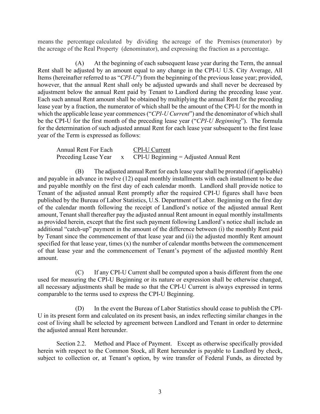 3 means the percentage calculated by dividing the acreage of the Premises (numerator) by the acreage of the Real Property (denominator), and expressing the fraction as a percentage. (A) At the beginning of each subsequent lease year during the Term, the annual Rent shall be adjusted by an amount equal to any change in the CPI-U U.S. City Average, All Items (hereinafter referred to as “CPI-U”) from the beginning of the previous lease year; provided, however, that the annual Rent shall only be adjusted upwards and shall never be decreased by adjustment below the annual Rent paid by Tenant to Landlord during the preceding lease year. Each such annual Rent amount shall be obtained by multiplying the annual Rent for the preceding lease year by a fraction, the numerator of which shall be the amount of the CPI-U for the month in which the applicable lease year commences (“CPI-U Current”) and the denominator of which shall be the CPI-U for the first month of the preceding lease year (“CPI-U Beginning”). The formula for the determination of such adjusted annual Rent for each lease year subsequent to the first lease year of the Term is expressed as follows: Annual Rent For Each CPI-U Current Preceding Lease Year x CPI-U Beginning = Adjusted Annual Rent (B) The adjusted annual Rent for each lease year shall be prorated (if applicable) and payable in advance in twelve (12) equal monthly installments with each installment to be due and payable monthly on the first day of each calendar month. Landlord shall provide notice to Tenant of the adjusted annual Rent promptly after the required CPI-U figures shall have been published by the Bureau of Labor Statistics, U.S. Department of Labor. Beginning on the first day of the calendar month following the receipt of Landlord’s notice of the adjusted annual Rent amount, Tenant shall thereafter pay the adjusted annual Rent amount in equal monthly installments as provided herein, except that the first such payment following Landlord’s notice shall include an additional “catch-up” payment in the amount of the difference between (i) the monthly Rent paid by Tenant since the commencement of that lease year and (ii) the adjusted monthly Rent amount specified for that lease year, times (x) the number of calendar months between the commencement of that lease year and the commencement of Tenant’s payment of the adjusted monthly Rent amount. (C) If any CPI-U Current shall be computed upon a basis different from the one used for measuring the CPI-U Beginning or its nature or expression shall be otherwise changed, all necessary adjustments shall be made so that the CPI-U Current is always expressed in terms comparable to the terms used to express the CPI-U Beginning. (D) In the event the Bureau of Labor Statistics should cease to publish the CPI- U in its present form and calculated on its present basis, an index reflecting similar changes in the cost of living shall be selected by agreement between Landlord and Tenant in order to determine the adjusted annual Rent hereunder. Section 2.2. Method and Place of Payment. Except as otherwise specifically provided herein with respect to the Common Stock, all Rent hereunder is payable to Landlord by check, subject to collection or, at Tenant’s option, by wire transfer of Federal Funds, as directed by