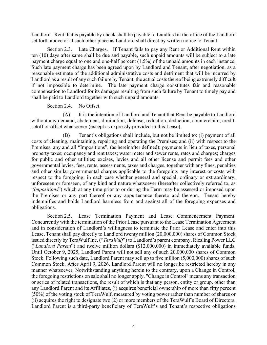4 Landlord. Rent that is payable by check shall be payable to Landlord at the office of the Landlord set forth above or at such other place as Landlord shall direct by written notice to Tenant. Section 2.3. Late Charges. If Tenant fails to pay any Rent or Additional Rent within ten (10) days after same shall be due and payable, such unpaid amounts will be subject to a late payment charge equal to one and one-half percent (1.5%) of the unpaid amounts in each instance. Such late payment charge has been agreed upon by Landlord and Tenant, after negotiation, as a reasonable estimate of the additional administrative costs and detriment that will be incurred by Landlord as a result of any such failure by Tenant, the actual costs thereof being extremely difficult if not impossible to determine. The late payment charge constitutes fair and reasonable compensation to Landlord for its damages resulting from such failure by Tenant to timely pay and shall be paid to Landlord together with such unpaid amounts. Section 2.4. No Offset. (A) It is the intention of Landlord and Tenant that Rent be payable to Landlord without any demand, abatement, diminution, defense, reduction, deduction, counterclaim, credit, setoff or offset whatsoever (except as expressly provided in this Lease). (B) Tenant’s obligations shall include, but not be limited to: (i) payment of all costs of cleaning, maintaining, repairing and operating the Premises; and (ii) with respect to the Premises, any and all “Impositions”, (as hereinafter defined); payments in lieu of taxes, personal property taxes; occupancy and rent taxes; water meter and sewer rents, rates and charges; charges for public and other utilities; excises, levies and all other license and permit fees and other governmental levies, fees, rents, assessments, taxes and charges, together with any fines, penalties and other similar governmental charges applicable to the foregoing; any interest or costs with respect to the foregoing; in each case whether general and special, ordinary or extraordinary, unforeseen or foreseen, of any kind and nature whatsoever (hereafter collectively referred to, as “Impositions”) which at any time prior to or during the Term may be assessed or imposed upon the Premises or any part thereof or any appurtenance thereto and thereon. Tenant hereby indemnifies and holds Landlord harmless from and against all of the foregoing expenses and obligations. Section 2.5. Lease Termination Payment and Lease Commencement Payment. Concurrently with the termination of the Prior Lease pursuant to the Lease Termination Agreement and in consideration of Landlord’s willingness to terminate the Prior Lease and enter into this Lease, Tenant shall pay directly to Landlord twenty million (20,000,000) shares of Common Stock issued directly by TeraWulf Inc. (“TeraWulf”) to Landlord’s parent company, Riesling Power LLC (“Landlord Parent”) and twelve million dollars ($12,000,000) in immediately available funds. Until October 9, 2025, Landlord Parent will not sell any of such 20,000,000 shares of Common Stock. Following such date, Landlord Parent may sell up to five million (5,000,000) shares of such Common Stock. After April 9, 2026, Landlord Parent will no longer be restricted hereby in any manner whatsoever. Notwithstanding anything herein to the contrary, upon a Change in Control, the foregoing restrictions on sale shall no longer apply. "Change in Control" means any transaction or series of related transactions, the result of which is that any person, entity or group, other than any Landlord Parent and its Affiliates, (i) acquires beneficial ownership of more than fifty percent (50%) of the voting stock of TeraWulf, measured by voting power rather than number of shares or (ii) acquires the right to designate two (2) or more members of the TeraWulf’s Board of Directors. Landlord Parent is a third-party beneficiary of TeraWulf’s and Tenant’s respective obligations