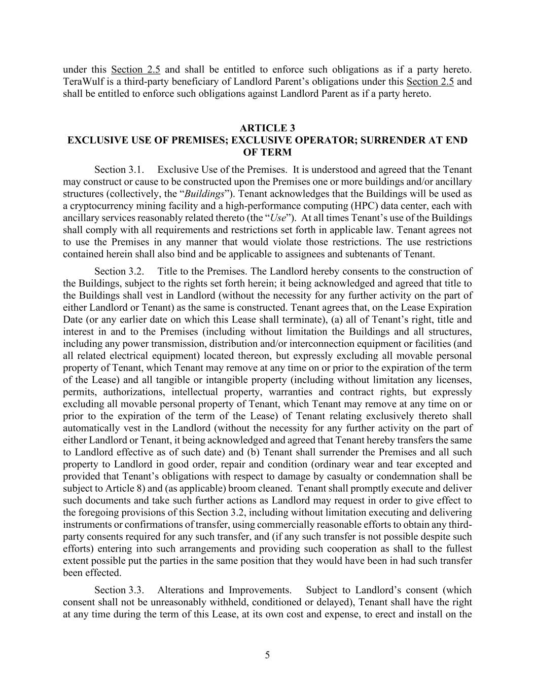 5 under this Section 2.5 and shall be entitled to enforce such obligations as if a party hereto. TeraWulf is a third-party beneficiary of Landlord Parent’s obligations under this Section 2.5 and shall be entitled to enforce such obligations against Landlord Parent as if a party hereto. ARTICLE 3 EXCLUSIVE USE OF PREMISES; EXCLUSIVE OPERATOR; SURRENDER AT END OF TERM Section 3.1. Exclusive Use of the Premises. It is understood and agreed that the Tenant may construct or cause to be constructed upon the Premises one or more buildings and/or ancillary structures (collectively, the “Buildings”). Tenant acknowledges that the Buildings will be used as a cryptocurrency mining facility and a high-performance computing (HPC) data center, each with ancillary services reasonably related thereto (the “Use”). At all times Tenant’s use of the Buildings shall comply with all requirements and restrictions set forth in applicable law. Tenant agrees not to use the Premises in any manner that would violate those restrictions. The use restrictions contained herein shall also bind and be applicable to assignees and subtenants of Tenant. Section 3.2. Title to the Premises. The Landlord hereby consents to the construction of the Buildings, subject to the rights set forth herein; it being acknowledged and agreed that title to the Buildings shall vest in Landlord (without the necessity for any further activity on the part of either Landlord or Tenant) as the same is constructed. Tenant agrees that, on the Lease Expiration Date (or any earlier date on which this Lease shall terminate), (a) all of Tenant’s right, title and interest in and to the Premises (including without limitation the Buildings and all structures, including any power transmission, distribution and/or interconnection equipment or facilities (and all related electrical equipment) located thereon, but expressly excluding all movable personal property of Tenant, which Tenant may remove at any time on or prior to the expiration of the term of the Lease) and all tangible or intangible property (including without limitation any licenses, permits, authorizations, intellectual property, warranties and contract rights, but expressly excluding all movable personal property of Tenant, which Tenant may remove at any time on or prior to the expiration of the term of the Lease) of Tenant relating exclusively thereto shall automatically vest in the Landlord (without the necessity for any further activity on the part of either Landlord or Tenant, it being acknowledged and agreed that Tenant hereby transfers the same to Landlord effective as of such date) and (b) Tenant shall surrender the Premises and all such property to Landlord in good order, repair and condition (ordinary wear and tear excepted and provided that Tenant’s obligations with respect to damage by casualty or condemnation shall be subject to Article 8) and (as applicable) broom cleaned. Tenant shall promptly execute and deliver such documents and take such further actions as Landlord may request in order to give effect to the foregoing provisions of this Section 3.2, including without limitation executing and delivering instruments or confirmations of transfer, using commercially reasonable efforts to obtain any third- party consents required for any such transfer, and (if any such transfer is not possible despite such efforts) entering into such arrangements and providing such cooperation as shall to the fullest extent possible put the parties in the same position that they would have been in had such transfer been effected. Section 3.3. Alterations and Improvements. Subject to Landlord’s consent (which consent shall not be unreasonably withheld, conditioned or delayed), Tenant shall have the right at any time during the term of this Lease, at its own cost and expense, to erect and install on the