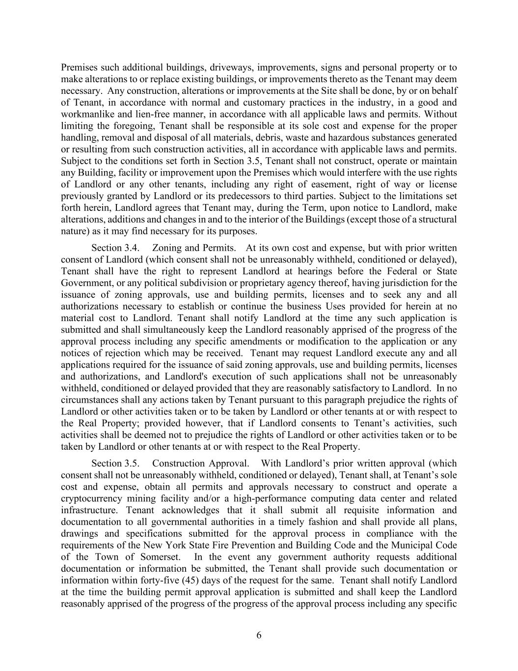 6 Premises such additional buildings, driveways, improvements, signs and personal property or to make alterations to or replace existing buildings, or improvements thereto as the Tenant may deem necessary. Any construction, alterations or improvements at the Site shall be done, by or on behalf of Tenant, in accordance with normal and customary practices in the industry, in a good and workmanlike and lien-free manner, in accordance with all applicable laws and permits. Without limiting the foregoing, Tenant shall be responsible at its sole cost and expense for the proper handling, removal and disposal of all materials, debris, waste and hazardous substances generated or resulting from such construction activities, all in accordance with applicable laws and permits. Subject to the conditions set forth in Section 3.5, Tenant shall not construct, operate or maintain any Building, facility or improvement upon the Premises which would interfere with the use rights of Landlord or any other tenants, including any right of easement, right of way or license previously granted by Landlord or its predecessors to third parties. Subject to the limitations set forth herein, Landlord agrees that Tenant may, during the Term, upon notice to Landlord, make alterations, additions and changes in and to the interior of the Buildings (except those of a structural nature) as it may find necessary for its purposes. Section 3.4. Zoning and Permits. At its own cost and expense, but with prior written consent of Landlord (which consent shall not be unreasonably withheld, conditioned or delayed), Tenant shall have the right to represent Landlord at hearings before the Federal or State Government, or any political subdivision or proprietary agency thereof, having jurisdiction for the issuance of zoning approvals, use and building permits, licenses and to seek any and all authorizations necessary to establish or continue the business Uses provided for herein at no material cost to Landlord. Tenant shall notify Landlord at the time any such application is submitted and shall simultaneously keep the Landlord reasonably apprised of the progress of the approval process including any specific amendments or modification to the application or any notices of rejection which may be received. Tenant may request Landlord execute any and all applications required for the issuance of said zoning approvals, use and building permits, licenses and authorizations, and Landlord's execution of such applications shall not be unreasonably withheld, conditioned or delayed provided that they are reasonably satisfactory to Landlord. In no circumstances shall any actions taken by Tenant pursuant to this paragraph prejudice the rights of Landlord or other activities taken or to be taken by Landlord or other tenants at or with respect to the Real Property; provided however, that if Landlord consents to Tenant’s activities, such activities shall be deemed not to prejudice the rights of Landlord or other activities taken or to be taken by Landlord or other tenants at or with respect to the Real Property. Section 3.5. Construction Approval. With Landlord’s prior written approval (which consent shall not be unreasonably withheld, conditioned or delayed), Tenant shall, at Tenant’s sole cost and expense, obtain all permits and approvals necessary to construct and operate a cryptocurrency mining facility and/or a high-performance computing data center and related infrastructure. Tenant acknowledges that it shall submit all requisite information and documentation to all governmental authorities in a timely fashion and shall provide all plans, drawings and specifications submitted for the approval process in compliance with the requirements of the New York State Fire Prevention and Building Code and the Municipal Code of the Town of Somerset. In the event any government authority requests additional documentation or information be submitted, the Tenant shall provide such documentation or information within forty-five (45) days of the request for the same. Tenant shall notify Landlord at the time the building permit approval application is submitted and shall keep the Landlord reasonably apprised of the progress of the progress of the approval process including any specific
