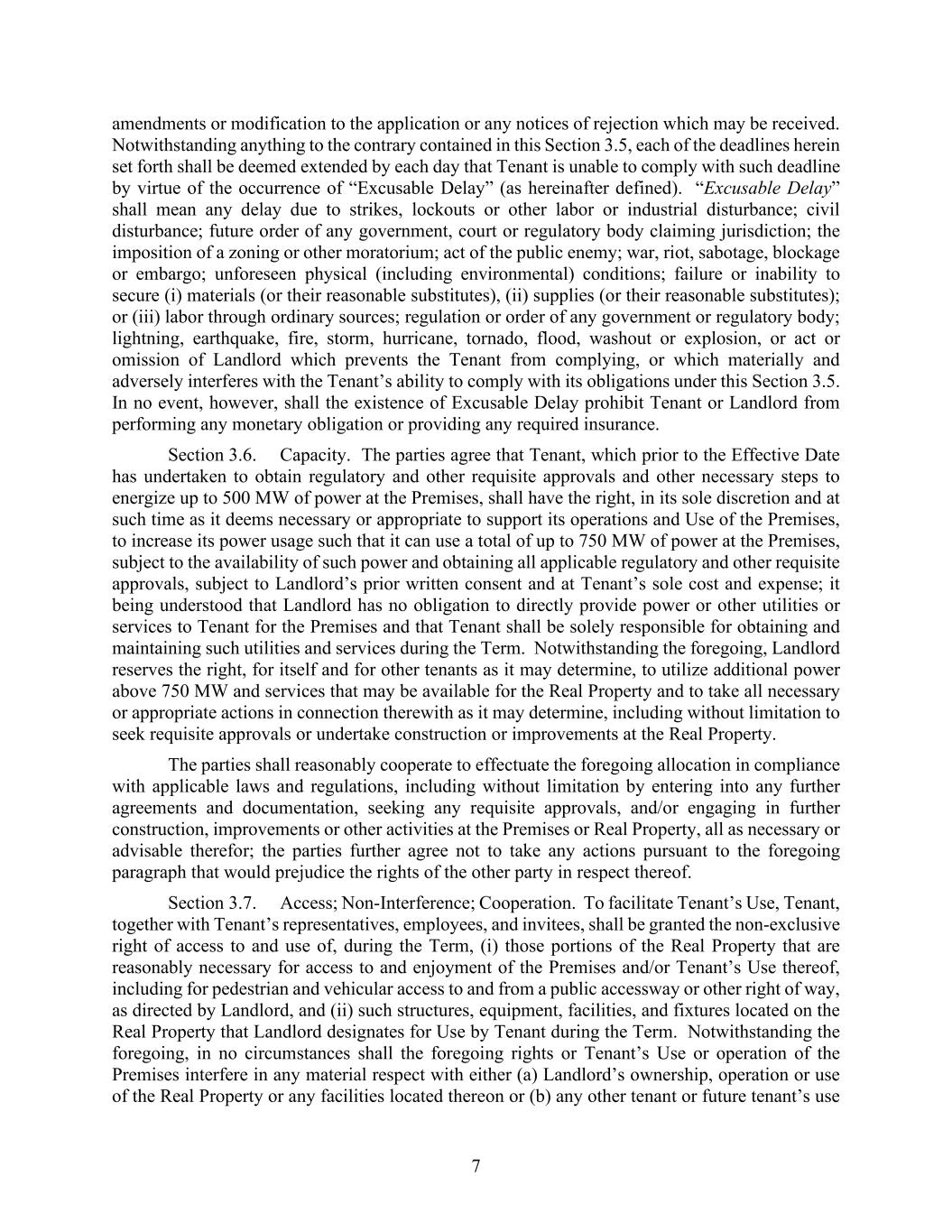 7 amendments or modification to the application or any notices of rejection which may be received. Notwithstanding anything to the contrary contained in this Section 3.5, each of the deadlines herein set forth shall be deemed extended by each day that Tenant is unable to comply with such deadline by virtue of the occurrence of “Excusable Delay” (as hereinafter defined). “Excusable Delay” shall mean any delay due to strikes, lockouts or other labor or industrial disturbance; civil disturbance; future order of any government, court or regulatory body claiming jurisdiction; the imposition of a zoning or other moratorium; act of the public enemy; war, riot, sabotage, blockage or embargo; unforeseen physical (including environmental) conditions; failure or inability to secure (i) materials (or their reasonable substitutes), (ii) supplies (or their reasonable substitutes); or (iii) labor through ordinary sources; regulation or order of any government or regulatory body; lightning, earthquake, fire, storm, hurricane, tornado, flood, washout or explosion, or act or omission of Landlord which prevents the Tenant from complying, or which materially and adversely interferes with the Tenant’s ability to comply with its obligations under this Section 3.5. In no event, however, shall the existence of Excusable Delay prohibit Tenant or Landlord from performing any monetary obligation or providing any required insurance. Section 3.6. Capacity. The parties agree that Tenant, which prior to the Effective Date has undertaken to obtain regulatory and other requisite approvals and other necessary steps to energize up to 500 MW of power at the Premises, shall have the right, in its sole discretion and at such time as it deems necessary or appropriate to support its operations and Use of the Premises, to increase its power usage such that it can use a total of up to 750 MW of power at the Premises, subject to the availability of such power and obtaining all applicable regulatory and other requisite approvals, subject to Landlord’s prior written consent and at Tenant’s sole cost and expense; it being understood that Landlord has no obligation to directly provide power or other utilities or services to Tenant for the Premises and that Tenant shall be solely responsible for obtaining and maintaining such utilities and services during the Term. Notwithstanding the foregoing, Landlord reserves the right, for itself and for other tenants as it may determine, to utilize additional power above 750 MW and services that may be available for the Real Property and to take all necessary or appropriate actions in connection therewith as it may determine, including without limitation to seek requisite approvals or undertake construction or improvements at the Real Property. The parties shall reasonably cooperate to effectuate the foregoing allocation in compliance with applicable laws and regulations, including without limitation by entering into any further agreements and documentation, seeking any requisite approvals, and/or engaging in further construction, improvements or other activities at the Premises or Real Property, all as necessary or advisable therefor; the parties further agree not to take any actions pursuant to the foregoing paragraph that would prejudice the rights of the other party in respect thereof. Section 3.7. Access; Non-Interference; Cooperation. To facilitate Tenant’s Use, Tenant, together with Tenant’s representatives, employees, and invitees, shall be granted the non-exclusive right of access to and use of, during the Term, (i) those portions of the Real Property that are reasonably necessary for access to and enjoyment of the Premises and/or Tenant’s Use thereof, including for pedestrian and vehicular access to and from a public accessway or other right of way, as directed by Landlord, and (ii) such structures, equipment, facilities, and fixtures located on the Real Property that Landlord designates for Use by Tenant during the Term. Notwithstanding the foregoing, in no circumstances shall the foregoing rights or Tenant’s Use or operation of the Premises interfere in any material respect with either (a) Landlord’s ownership, operation or use of the Real Property or any facilities located thereon or (b) any other tenant or future tenant’s use