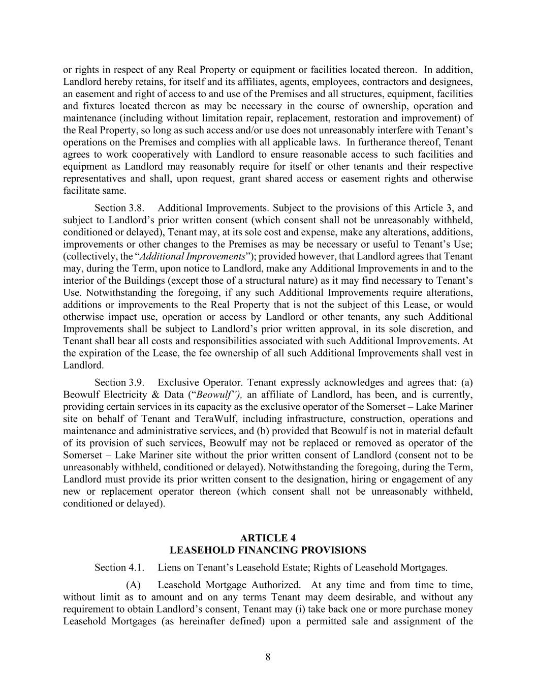 8 or rights in respect of any Real Property or equipment or facilities located thereon. In addition, Landlord hereby retains, for itself and its affiliates, agents, employees, contractors and designees, an easement and right of access to and use of the Premises and all structures, equipment, facilities and fixtures located thereon as may be necessary in the course of ownership, operation and maintenance (including without limitation repair, replacement, restoration and improvement) of the Real Property, so long as such access and/or use does not unreasonably interfere with Tenant’s operations on the Premises and complies with all applicable laws. In furtherance thereof, Tenant agrees to work cooperatively with Landlord to ensure reasonable access to such facilities and equipment as Landlord may reasonably require for itself or other tenants and their respective representatives and shall, upon request, grant shared access or easement rights and otherwise facilitate same. Section 3.8. Additional Improvements. Subject to the provisions of this Article 3, and subject to Landlord’s prior written consent (which consent shall not be unreasonably withheld, conditioned or delayed), Tenant may, at its sole cost and expense, make any alterations, additions, improvements or other changes to the Premises as may be necessary or useful to Tenant’s Use; (collectively, the “Additional Improvements”); provided however, that Landlord agrees that Tenant may, during the Term, upon notice to Landlord, make any Additional Improvements in and to the interior of the Buildings (except those of a structural nature) as it may find necessary to Tenant’s Use. Notwithstanding the foregoing, if any such Additional Improvements require alterations, additions or improvements to the Real Property that is not the subject of this Lease, or would otherwise impact use, operation or access by Landlord or other tenants, any such Additional Improvements shall be subject to Landlord’s prior written approval, in its sole discretion, and Tenant shall bear all costs and responsibilities associated with such Additional Improvements. At the expiration of the Lease, the fee ownership of all such Additional Improvements shall vest in Landlord. Section 3.9. Exclusive Operator. Tenant expressly acknowledges and agrees that: (a) Beowulf Electricity & Data (“Beowulf”), an affiliate of Landlord, has been, and is currently, providing certain services in its capacity as the exclusive operator of the Somerset – Lake Mariner site on behalf of Tenant and TeraWulf, including infrastructure, construction, operations and maintenance and administrative services, and (b) provided that Beowulf is not in material default of its provision of such services, Beowulf may not be replaced or removed as operator of the Somerset – Lake Mariner site without the prior written consent of Landlord (consent not to be unreasonably withheld, conditioned or delayed). Notwithstanding the foregoing, during the Term, Landlord must provide its prior written consent to the designation, hiring or engagement of any new or replacement operator thereon (which consent shall not be unreasonably withheld, conditioned or delayed). ARTICLE 4 LEASEHOLD FINANCING PROVISIONS Section 4.1. Liens on Tenant’s Leasehold Estate; Rights of Leasehold Mortgages. (A) Leasehold Mortgage Authorized. At any time and from time to time, without limit as to amount and on any terms Tenant may deem desirable, and without any requirement to obtain Landlord’s consent, Tenant may (i) take back one or more purchase money Leasehold Mortgages (as hereinafter defined) upon a permitted sale and assignment of the