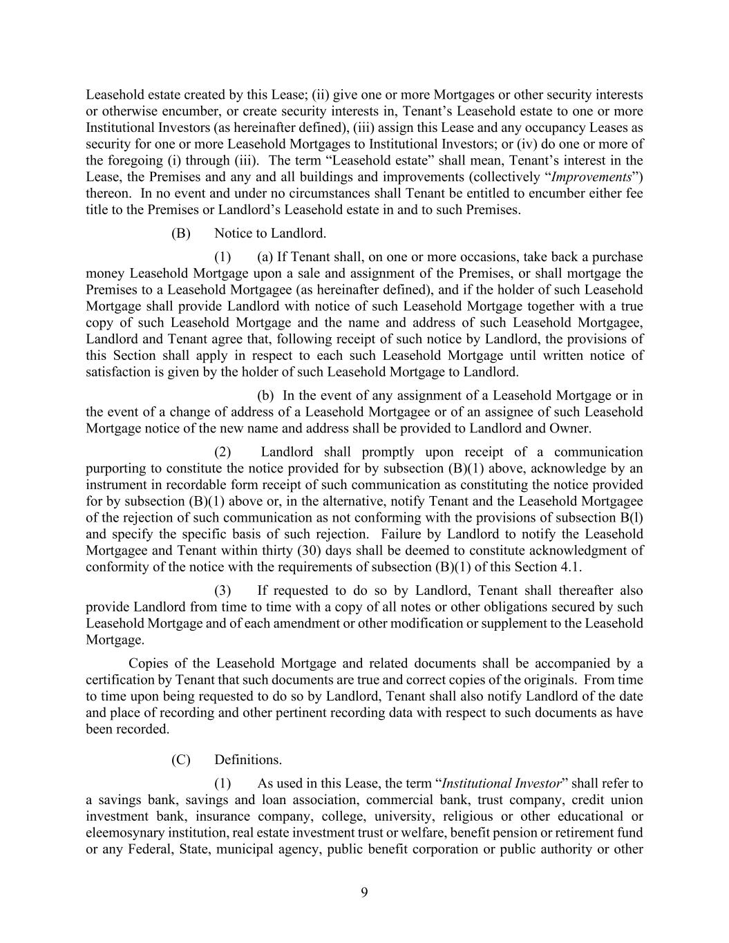 9 Leasehold estate created by this Lease; (ii) give one or more Mortgages or other security interests or otherwise encumber, or create security interests in, Tenant’s Leasehold estate to one or more Institutional Investors (as hereinafter defined), (iii) assign this Lease and any occupancy Leases as security for one or more Leasehold Mortgages to Institutional Investors; or (iv) do one or more of the foregoing (i) through (iii). The term “Leasehold estate” shall mean, Tenant’s interest in the Lease, the Premises and any and all buildings and improvements (collectively “Improvements”) thereon. In no event and under no circumstances shall Tenant be entitled to encumber either fee title to the Premises or Landlord’s Leasehold estate in and to such Premises. (B) Notice to Landlord. (1) (a) If Tenant shall, on one or more occasions, take back a purchase money Leasehold Mortgage upon a sale and assignment of the Premises, or shall mortgage the Premises to a Leasehold Mortgagee (as hereinafter defined), and if the holder of such Leasehold Mortgage shall provide Landlord with notice of such Leasehold Mortgage together with a true copy of such Leasehold Mortgage and the name and address of such Leasehold Mortgagee, Landlord and Tenant agree that, following receipt of such notice by Landlord, the provisions of this Section shall apply in respect to each such Leasehold Mortgage until written notice of satisfaction is given by the holder of such Leasehold Mortgage to Landlord. (b) In the event of any assignment of a Leasehold Mortgage or in the event of a change of address of a Leasehold Mortgagee or of an assignee of such Leasehold Mortgage notice of the new name and address shall be provided to Landlord and Owner. (2) Landlord shall promptly upon receipt of a communication purporting to constitute the notice provided for by subsection (B)(1) above, acknowledge by an instrument in recordable form receipt of such communication as constituting the notice provided for by subsection (B)(1) above or, in the alternative, notify Tenant and the Leasehold Mortgagee of the rejection of such communication as not conforming with the provisions of subsection B(l) and specify the specific basis of such rejection. Failure by Landlord to notify the Leasehold Mortgagee and Tenant within thirty (30) days shall be deemed to constitute acknowledgment of conformity of the notice with the requirements of subsection (B)(1) of this Section 4.1. (3) If requested to do so by Landlord, Tenant shall thereafter also provide Landlord from time to time with a copy of all notes or other obligations secured by such Leasehold Mortgage and of each amendment or other modification or supplement to the Leasehold Mortgage. Copies of the Leasehold Mortgage and related documents shall be accompanied by a certification by Tenant that such documents are true and correct copies of the originals. From time to time upon being requested to do so by Landlord, Tenant shall also notify Landlord of the date and place of recording and other pertinent recording data with respect to such documents as have been recorded. (C) Definitions. (1) As used in this Lease, the term “Institutional Investor” shall refer to a savings bank, savings and loan association, commercial bank, trust company, credit union investment bank, insurance company, college, university, religious or other educational or eleemosynary institution, real estate investment trust or welfare, benefit pension or retirement fund or any Federal, State, municipal agency, public benefit corporation or public authority or other