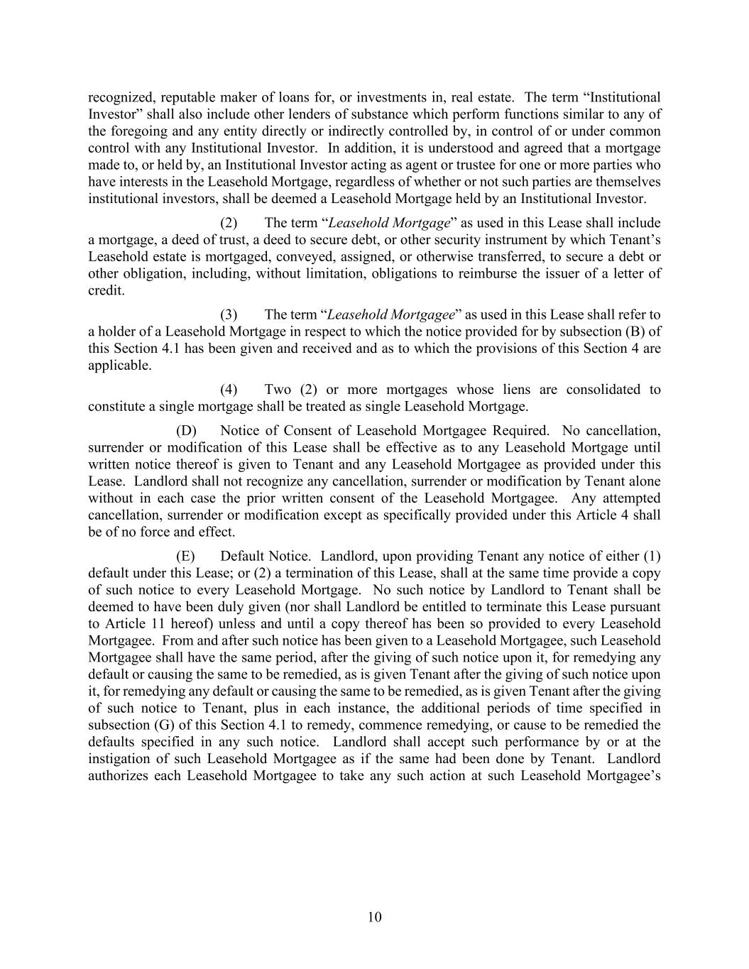 10 recognized, reputable maker of loans for, or investments in, real estate. The term “Institutional Investor” shall also include other lenders of substance which perform functions similar to any of the foregoing and any entity directly or indirectly controlled by, in control of or under common control with any Institutional Investor. In addition, it is understood and agreed that a mortgage made to, or held by, an Institutional Investor acting as agent or trustee for one or more parties who have interests in the Leasehold Mortgage, regardless of whether or not such parties are themselves institutional investors, shall be deemed a Leasehold Mortgage held by an Institutional Investor. (2) The term “Leasehold Mortgage” as used in this Lease shall include a mortgage, a deed of trust, a deed to secure debt, or other security instrument by which Tenant’s Leasehold estate is mortgaged, conveyed, assigned, or otherwise transferred, to secure a debt or other obligation, including, without limitation, obligations to reimburse the issuer of a letter of credit. (3) The term “Leasehold Mortgagee” as used in this Lease shall refer to a holder of a Leasehold Mortgage in respect to which the notice provided for by subsection (B) of this Section 4.1 has been given and received and as to which the provisions of this Section 4 are applicable. (4) Two (2) or more mortgages whose liens are consolidated to constitute a single mortgage shall be treated as single Leasehold Mortgage. (D) Notice of Consent of Leasehold Mortgagee Required. No cancellation, surrender or modification of this Lease shall be effective as to any Leasehold Mortgage until written notice thereof is given to Tenant and any Leasehold Mortgagee as provided under this Lease. Landlord shall not recognize any cancellation, surrender or modification by Tenant alone without in each case the prior written consent of the Leasehold Mortgagee. Any attempted cancellation, surrender or modification except as specifically provided under this Article 4 shall be of no force and effect. (E) Default Notice. Landlord, upon providing Tenant any notice of either (1) default under this Lease; or (2) a termination of this Lease, shall at the same time provide a copy of such notice to every Leasehold Mortgage. No such notice by Landlord to Tenant shall be deemed to have been duly given (nor shall Landlord be entitled to terminate this Lease pursuant to Article 11 hereof) unless and until a copy thereof has been so provided to every Leasehold Mortgagee. From and after such notice has been given to a Leasehold Mortgagee, such Leasehold Mortgagee shall have the same period, after the giving of such notice upon it, for remedying any default or causing the same to be remedied, as is given Tenant after the giving of such notice upon it, for remedying any default or causing the same to be remedied, as is given Tenant after the giving of such notice to Tenant, plus in each instance, the additional periods of time specified in subsection (G) of this Section 4.1 to remedy, commence remedying, or cause to be remedied the defaults specified in any such notice. Landlord shall accept such performance by or at the instigation of such Leasehold Mortgagee as if the same had been done by Tenant. Landlord authorizes each Leasehold Mortgagee to take any such action at such Leasehold Mortgagee’s