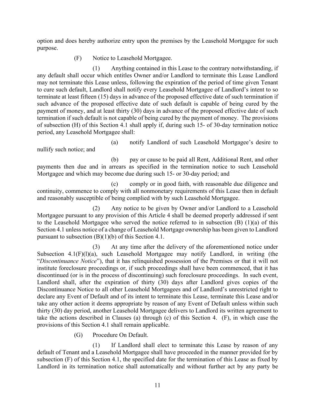 11 option and does hereby authorize entry upon the premises by the Leasehold Mortgagee for such purpose. (F) Notice to Leasehold Mortgagee. (1) Anything contained in this Lease to the contrary notwithstanding, if any default shall occur which entitles Owner and/or Landlord to terminate this Lease Landlord may not terminate this Lease unless, following the expiration of the period of time given Tenant to cure such default, Landlord shall notify every Leasehold Mortgagee of Landlord’s intent to so terminate at least fifteen (15) days in advance of the proposed effective date of such termination if such advance of the proposed effective date of such default is capable of being cured by the payment of money, and at least thirty (30) days in advance of the proposed effective date of such termination if such default is not capable of being cured by the payment of money. The provisions of subsection (H) of this Section 4.1 shall apply if, during such 15- of 30-day termination notice period, any Leasehold Mortgagee shall: (a) notify Landlord of such Leasehold Mortgagee’s desire to nullify such notice; and (b) pay or cause to be paid all Rent, Additional Rent, and other payments then due and in arrears as specified in the termination notice to such Leasehold Mortgagee and which may become due during such 15- or 30-day period; and (c) comply or in good faith, with reasonable due diligence and continuity, commence to comply with all nonmonetary requirements of this Lease then in default and reasonably susceptible of being complied with by such Leasehold Mortgagee. (2) Any notice to be given by Owner and/or Landlord to a Leasehold Mortgagee pursuant to any provision of this Article 4 shall be deemed properly addressed if sent to the Leasehold Mortgagee who served the notice referred to in subsection (B) (1)(a) of this Section 4.1 unless notice of a change of Leasehold Mortgage ownership has been given to Landlord pursuant to subsection (B)(1)(b) of this Section 4.1. (3) At any time after the delivery of the aforementioned notice under Subsection 4.1(F)(l)(a), such Leasehold Mortgagee may notify Landlord, in writing (the “Discontinuance Notice”), that it has relinquished possession of the Premises or that it will not institute foreclosure proceedings or, if such proceedings shall have been commenced, that it has discontinued (or is in the process of discontinuing) such foreclosure proceedings. In such event, Landlord shall, after the expiration of thirty (30) days after Landlord gives copies of the Discontinuance Notice to all other Leasehold Mortgagees and of Landlord’s unrestricted right to declare any Event of Default and of its intent to terminate this Lease, terminate this Lease and/or take any other action it deems appropriate by reason of any Event of Default unless within such thirty (30) day period, another Leasehold Mortgagee delivers to Landlord its written agreement to take the actions described in Clauses (a) through (c) of this Section 4. (F), in which case the provisions of this Section 4.1 shall remain applicable. (G) Procedure On Default. (1) If Landlord shall elect to terminate this Lease by reason of any default of Tenant and a Leasehold Mortgagee shall have proceeded in the manner provided for by subsection (F) of this Section 4.1, the specified date for the termination of this Lease as fixed by Landlord in its termination notice shall automatically and without further act by any party be