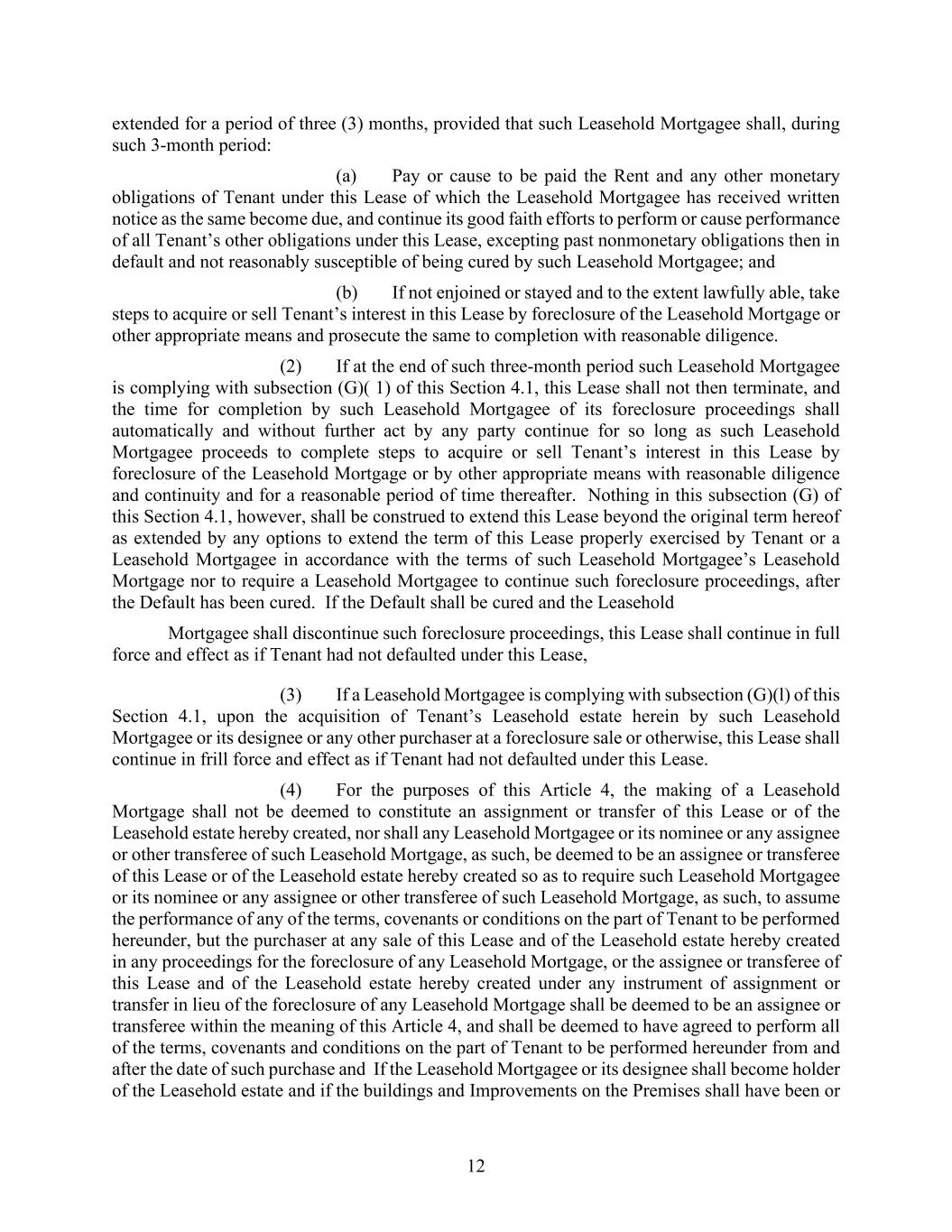 12 extended for a period of three (3) months, provided that such Leasehold Mortgagee shall, during such 3-month period: (a) Pay or cause to be paid the Rent and any other monetary obligations of Tenant under this Lease of which the Leasehold Mortgagee has received written notice as the same become due, and continue its good faith efforts to perform or cause performance of all Tenant’s other obligations under this Lease, excepting past nonmonetary obligations then in default and not reasonably susceptible of being cured by such Leasehold Mortgagee; and (b) If not enjoined or stayed and to the extent lawfully able, take steps to acquire or sell Tenant’s interest in this Lease by foreclosure of the Leasehold Mortgage or other appropriate means and prosecute the same to completion with reasonable diligence. (2) If at the end of such three-month period such Leasehold Mortgagee is complying with subsection (G)( 1) of this Section 4.1, this Lease shall not then terminate, and the time for completion by such Leasehold Mortgagee of its foreclosure proceedings shall automatically and without further act by any party continue for so long as such Leasehold Mortgagee proceeds to complete steps to acquire or sell Tenant’s interest in this Lease by foreclosure of the Leasehold Mortgage or by other appropriate means with reasonable diligence and continuity and for a reasonable period of time thereafter. Nothing in this subsection (G) of this Section 4.1, however, shall be construed to extend this Lease beyond the original term hereof as extended by any options to extend the term of this Lease properly exercised by Tenant or a Leasehold Mortgagee in accordance with the terms of such Leasehold Mortgagee’s Leasehold Mortgage nor to require a Leasehold Mortgagee to continue such foreclosure proceedings, after the Default has been cured. If the Default shall be cured and the Leasehold Mortgagee shall discontinue such foreclosure proceedings, this Lease shall continue in full force and effect as if Tenant had not defaulted under this Lease, (3) If a Leasehold Mortgagee is complying with subsection (G)(l) of this Section 4.1, upon the acquisition of Tenant’s Leasehold estate herein by such Leasehold Mortgagee or its designee or any other purchaser at a foreclosure sale or otherwise, this Lease shall continue in frill force and effect as if Tenant had not defaulted under this Lease. (4) For the purposes of this Article 4, the making of a Leasehold Mortgage shall not be deemed to constitute an assignment or transfer of this Lease or of the Leasehold estate hereby created, nor shall any Leasehold Mortgagee or its nominee or any assignee or other transferee of such Leasehold Mortgage, as such, be deemed to be an assignee or transferee of this Lease or of the Leasehold estate hereby created so as to require such Leasehold Mortgagee or its nominee or any assignee or other transferee of such Leasehold Mortgage, as such, to assume the performance of any of the terms, covenants or conditions on the part of Tenant to be performed hereunder, but the purchaser at any sale of this Lease and of the Leasehold estate hereby created in any proceedings for the foreclosure of any Leasehold Mortgage, or the assignee or transferee of this Lease and of the Leasehold estate hereby created under any instrument of assignment or transfer in lieu of the foreclosure of any Leasehold Mortgage shall be deemed to be an assignee or transferee within the meaning of this Article 4, and shall be deemed to have agreed to perform all of the terms, covenants and conditions on the part of Tenant to be performed hereunder from and after the date of such purchase and If the Leasehold Mortgagee or its designee shall become holder of the Leasehold estate and if the buildings and Improvements on the Premises shall have been or
