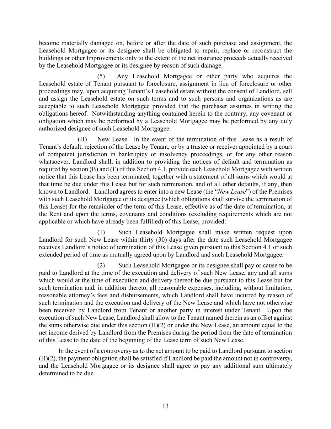 13 become materially damaged on, before or after the date of such purchase and assignment, the Leasehold Mortgagee or its designee shall be obligated to repair, replace or reconstruct the buildings or other Improvements only to the extent of the net insurance proceeds actually received by the Leasehold Mortgagee or its designee by reason of such damage. (5) Any Leasehold Mortgagee or other party who acquires the Leasehold estate of Tenant pursuant to foreclosure, assignment in lieu of foreclosure or other proceedings may, upon acquiring Tenant’s Leasehold estate without the consent of Landlord, sell and assign the Leasehold estate on such terms and to such persons and organizations as are acceptable to such Leasehold Mortgagee provided that the purchaser assumes in writing the obligations hereof. Notwithstanding anything contained herein to the contrary, any covenant or obligation which may be performed by a Leasehold Mortgagee may be performed by any duly authorized designee of such Leasehold Mortgagee. (H) New Lease. In the event of the termination of this Lease as a result of Tenant’s default, rejection of the Lease by Tenant, or by a trustee or receiver appointed by a court of competent jurisdiction in bankruptcy or insolvency proceedings, or for any other reason whatsoever, Landlord shall, in addition to providing the notices of default and termination as required by section (B) and (F) of this Section 4.1, provide each Leasehold Mortgagee with written notice that this Lease has been terminated, together with a statement of all sums which would at that time be due under this Lease but for such termination, and of all other defaults, if any, then known to Landlord. Landlord agrees to enter into a new Lease (the “New Lease”) of the Premises with such Leasehold Mortgagee or its designee (which obligations shall survive the termination of this Lease) for the remainder of the term of this Lease, effective as of the date of termination, at the Rent and upon the terms, covenants and conditions (excluding requirements which are not applicable or which have already been fulfilled) of this Lease, provided: (1) Such Leasehold Mortgagee shall make written request upon Landlord for such New Lease within thirty (30) days after the date such Leasehold Mortgagee receives Landlord’s notice of termination of this Lease given pursuant to this Section 4.1 or such extended period of time as mutually agreed upon by Landlord and such Leasehold Mortgagee. (2) Such Leasehold Mortgagee or its designee shall pay or cause to be paid to Landlord at the time of the execution and delivery of such New Lease, any and all sums which would at the time of execution and delivery thereof be due pursuant to this Lease but for such termination and, in addition thereto, all reasonable expenses, including, without limitation, reasonable attorney’s fees and disbursements, which Landlord shall have incurred by reason of such termination and the execution and delivery of the New Lease and which have not otherwise been received by Landlord from Tenant or another party in interest under Tenant. Upon the execution of such New Lease, Landlord shall allow to the Tenant named therein as an offset against the sums otherwise due under this section (H)(2) or under the New Lease, an amount equal to the net income derived by Landlord from the Premises during the period from the date of termination of this Lease to the date of the beginning of the Lease term of such New Lease. In the event of a controversy as to the net amount to be paid to Landlord pursuant to section (H)(2), the payment obligation shall be satisfied if Landlord be paid the amount not in controversy, and the Leasehold Mortgagee or its designee shall agree to pay any additional sum ultimately determined to be due.