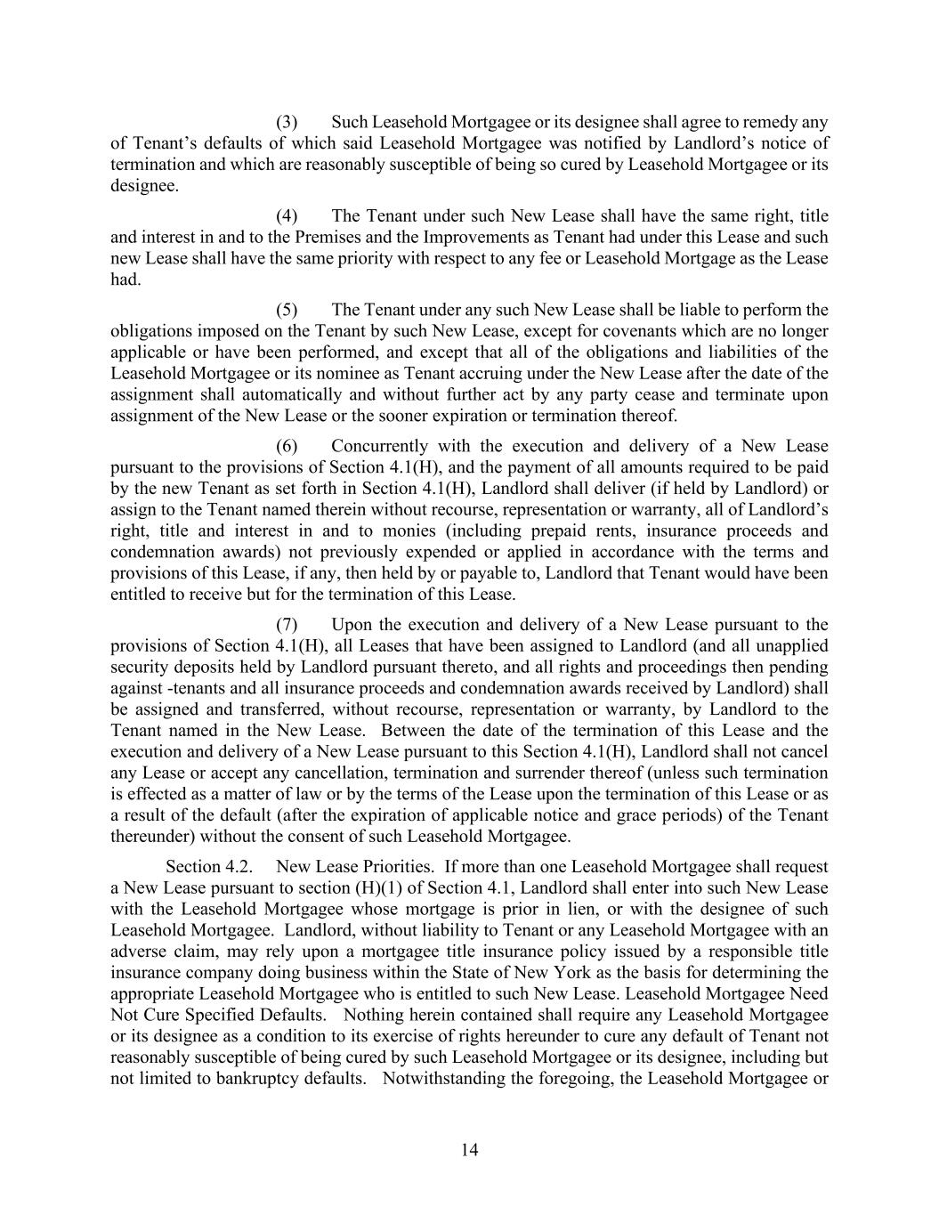 14 (3) Such Leasehold Mortgagee or its designee shall agree to remedy any of Tenant’s defaults of which said Leasehold Mortgagee was notified by Landlord’s notice of termination and which are reasonably susceptible of being so cured by Leasehold Mortgagee or its designee. (4) The Tenant under such New Lease shall have the same right, title and interest in and to the Premises and the Improvements as Tenant had under this Lease and such new Lease shall have the same priority with respect to any fee or Leasehold Mortgage as the Lease had. (5) The Tenant under any such New Lease shall be liable to perform the obligations imposed on the Tenant by such New Lease, except for covenants which are no longer applicable or have been performed, and except that all of the obligations and liabilities of the Leasehold Mortgagee or its nominee as Tenant accruing under the New Lease after the date of the assignment shall automatically and without further act by any party cease and terminate upon assignment of the New Lease or the sooner expiration or termination thereof. (6) Concurrently with the execution and delivery of a New Lease pursuant to the provisions of Section 4.1(H), and the payment of all amounts required to be paid by the new Tenant as set forth in Section 4.1(H), Landlord shall deliver (if held by Landlord) or assign to the Tenant named therein without recourse, representation or warranty, all of Landlord’s right, title and interest in and to monies (including prepaid rents, insurance proceeds and condemnation awards) not previously expended or applied in accordance with the terms and provisions of this Lease, if any, then held by or payable to, Landlord that Tenant would have been entitled to receive but for the termination of this Lease. (7) Upon the execution and delivery of a New Lease pursuant to the provisions of Section 4.1(H), all Leases that have been assigned to Landlord (and all unapplied security deposits held by Landlord pursuant thereto, and all rights and proceedings then pending against -tenants and all insurance proceeds and condemnation awards received by Landlord) shall be assigned and transferred, without recourse, representation or warranty, by Landlord to the Tenant named in the New Lease. Between the date of the termination of this Lease and the execution and delivery of a New Lease pursuant to this Section 4.1(H), Landlord shall not cancel any Lease or accept any cancellation, termination and surrender thereof (unless such termination is effected as a matter of law or by the terms of the Lease upon the termination of this Lease or as a result of the default (after the expiration of applicable notice and grace periods) of the Tenant thereunder) without the consent of such Leasehold Mortgagee. Section 4.2. New Lease Priorities. If more than one Leasehold Mortgagee shall request a New Lease pursuant to section (H)(1) of Section 4.1, Landlord shall enter into such New Lease with the Leasehold Mortgagee whose mortgage is prior in lien, or with the designee of such Leasehold Mortgagee. Landlord, without liability to Tenant or any Leasehold Mortgagee with an adverse claim, may rely upon a mortgagee title insurance policy issued by a responsible title insurance company doing business within the State of New York as the basis for determining the appropriate Leasehold Mortgagee who is entitled to such New Lease. Leasehold Mortgagee Need Not Cure Specified Defaults. Nothing herein contained shall require any Leasehold Mortgagee or its designee as a condition to its exercise of rights hereunder to cure any default of Tenant not reasonably susceptible of being cured by such Leasehold Mortgagee or its designee, including but not limited to bankruptcy defaults. Notwithstanding the foregoing, the Leasehold Mortgagee or