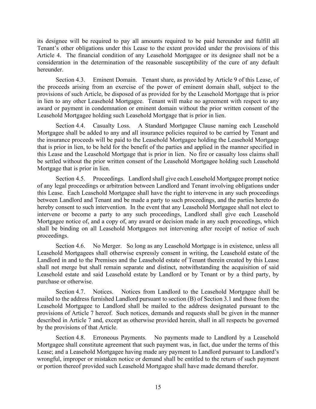 15 its designee will be required to pay all amounts required to be paid hereunder and fulfill all Tenant’s other obligations under this Lease to the extent provided under the provisions of this Article 4. The financial condition of any Leasehold Mortgagee or its designee shall not be a consideration in the determination of the reasonable susceptibility of the cure of any default hereunder. Section 4.3. Eminent Domain. Tenant share, as provided by Article 9 of this Lease, of the proceeds arising from an exercise of the power of eminent domain shall, subject to the provisions of such Article, be disposed of as provided for by the Leasehold Mortgage that is prior in lien to any other Leasehold Mortgagee. Tenant will make no agreement with respect to any award or payment in condemnation or eminent domain without the prior written consent of the Leasehold Mortgagee holding such Leasehold Mortgage that is prior in lien. Section 4.4. Casualty Loss. A Standard Mortgagee Clause naming each Leasehold Mortgagee shall be added to any and all insurance policies required to be carried by Tenant and the insurance proceeds will be paid to the Leasehold Mortgagee holding the Leasehold Mortgage that is prior in lien, to be held for the benefit of the parties and applied in the manner specified in this Lease and the Leasehold Mortgage that is prior in lien. No fire or casualty loss claims shall be settled without the prior written consent of the Leasehold Mortgagee holding such Leasehold Mortgage that is prior in lien. Section 4.5. Proceedings. Landlord shall give each Leasehold Mortgagee prompt notice of any legal proceedings or arbitration between Landlord and Tenant involving obligations under this Lease. Each Leasehold Mortgagee shall have the right to intervene in any such proceedings between Landlord and Tenant and be made a party to such proceedings, and the parties hereto do hereby consent to such intervention. In the event that any Leasehold Mortgagee shall not elect to intervene or become a party to any such proceedings, Landlord shall give each Leasehold Mortgagee notice of, and a copy of, any award or decision made in any such proceedings, which shall be binding on all Leasehold Mortgagees not intervening after receipt of notice of such proceedings. Section 4.6. No Merger. So long as any Leasehold Mortgage is in existence, unless all Leasehold Mortgagees shall otherwise expressly consent in writing, the Leasehold estate of the Landlord in and to the Premises and the Leasehold estate of Tenant therein created by this Lease shall not merge but shall remain separate and distinct, notwithstanding the acquisition of said Leasehold estate and said Leasehold estate by Landlord or by Tenant or by a third party, by purchase or otherwise. Section 4.7. Notices. Notices from Landlord to the Leasehold Mortgagee shall be mailed to the address furnished Landlord pursuant to section (B) of Section 3.1 and those from the Leasehold Mortgagee to Landlord shall be mailed to the address designated pursuant to the provisions of Article 7 hereof. Such notices, demands and requests shall be given in the manner described in Article 7 and, except as otherwise provided herein, shall in all respects be governed by the provisions of that Article. Section 4.8. Erroneous Payments. No payments made to Landlord by a Leasehold Mortgagee shall constitute agreement that such payment was, in fact, due under the terms of this Lease; and a Leasehold Mortgagee having made any payment to Landlord pursuant to Landlord’s wrongful, improper or mistaken notice or demand shall be entitled to the return of such payment or portion thereof provided such Leasehold Mortgagee shall have made demand therefor.