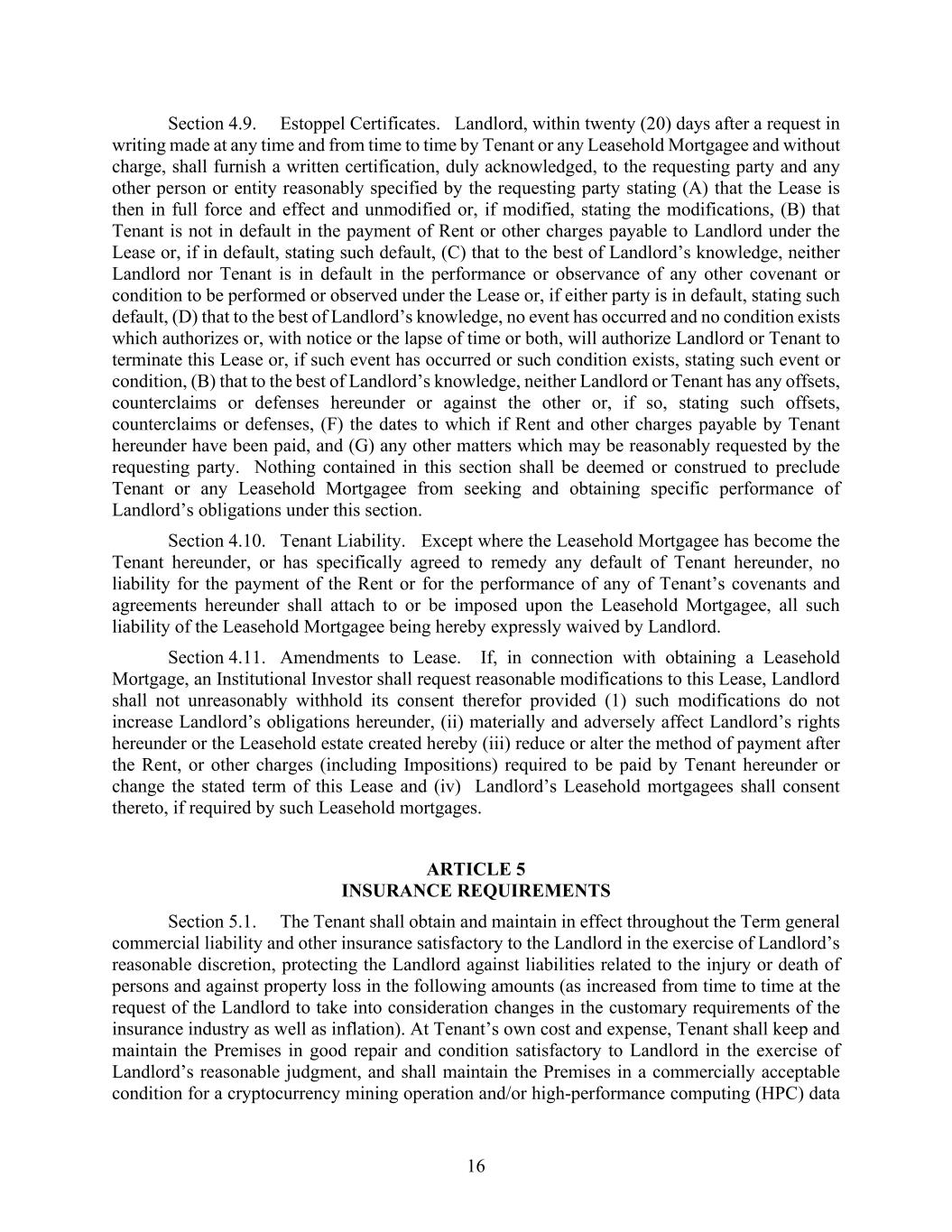16 Section 4.9. Estoppel Certificates. Landlord, within twenty (20) days after a request in writing made at any time and from time to time by Tenant or any Leasehold Mortgagee and without charge, shall furnish a written certification, duly acknowledged, to the requesting party and any other person or entity reasonably specified by the requesting party stating (A) that the Lease is then in full force and effect and unmodified or, if modified, stating the modifications, (B) that Tenant is not in default in the payment of Rent or other charges payable to Landlord under the Lease or, if in default, stating such default, (C) that to the best of Landlord’s knowledge, neither Landlord nor Tenant is in default in the performance or observance of any other covenant or condition to be performed or observed under the Lease or, if either party is in default, stating such default, (D) that to the best of Landlord’s knowledge, no event has occurred and no condition exists which authorizes or, with notice or the lapse of time or both, will authorize Landlord or Tenant to terminate this Lease or, if such event has occurred or such condition exists, stating such event or condition, (B) that to the best of Landlord’s knowledge, neither Landlord or Tenant has any offsets, counterclaims or defenses hereunder or against the other or, if so, stating such offsets, counterclaims or defenses, (F) the dates to which if Rent and other charges payable by Tenant hereunder have been paid, and (G) any other matters which may be reasonably requested by the requesting party. Nothing contained in this section shall be deemed or construed to preclude Tenant or any Leasehold Mortgagee from seeking and obtaining specific performance of Landlord’s obligations under this section. Section 4.10. Tenant Liability. Except where the Leasehold Mortgagee has become the Tenant hereunder, or has specifically agreed to remedy any default of Tenant hereunder, no liability for the payment of the Rent or for the performance of any of Tenant’s covenants and agreements hereunder shall attach to or be imposed upon the Leasehold Mortgagee, all such liability of the Leasehold Mortgagee being hereby expressly waived by Landlord. Section 4.11. Amendments to Lease. If, in connection with obtaining a Leasehold Mortgage, an Institutional Investor shall request reasonable modifications to this Lease, Landlord shall not unreasonably withhold its consent therefor provided (1) such modifications do not increase Landlord’s obligations hereunder, (ii) materially and adversely affect Landlord’s rights hereunder or the Leasehold estate created hereby (iii) reduce or alter the method of payment after the Rent, or other charges (including Impositions) required to be paid by Tenant hereunder or change the stated term of this Lease and (iv) Landlord’s Leasehold mortgagees shall consent thereto, if required by such Leasehold mortgages. ARTICLE 5 INSURANCE REQUIREMENTS Section 5.1. The Tenant shall obtain and maintain in effect throughout the Term general commercial liability and other insurance satisfactory to the Landlord in the exercise of Landlord’s reasonable discretion, protecting the Landlord against liabilities related to the injury or death of persons and against property loss in the following amounts (as increased from time to time at the request of the Landlord to take into consideration changes in the customary requirements of the insurance industry as well as inflation). At Tenant’s own cost and expense, Tenant shall keep and maintain the Premises in good repair and condition satisfactory to Landlord in the exercise of Landlord’s reasonable judgment, and shall maintain the Premises in a commercially acceptable condition for a cryptocurrency mining operation and/or high-performance computing (HPC) data