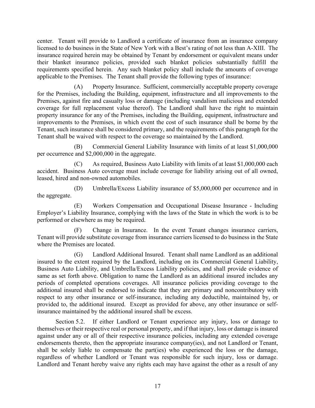 17 center. Tenant will provide to Landlord a certificate of insurance from an insurance company licensed to do business in the State of New York with a Best’s rating of not less than A-XIII. The insurance required herein may be obtained by Tenant by endorsement or equivalent means under their blanket insurance policies, provided such blanket policies substantially fulfill the requirements specified herein. Any such blanket policy shall include the amounts of coverage applicable to the Premises. The Tenant shall provide the following types of insurance: (A) Property Insurance. Sufficient, commercially acceptable property coverage for the Premises, including the Building, equipment, infrastructure and all improvements to the Premises, against fire and casualty loss or damage (including vandalism malicious and extended coverage for full replacement value thereof). The Landlord shall have the right to maintain property insurance for any of the Premises, including the Building, equipment, infrastructure and improvements to the Premises, in which event the cost of such insurance shall be borne by the Tenant, such insurance shall be considered primary, and the requirements of this paragraph for the Tenant shall be waived with respect to the coverage so maintained by the Landlord. (B) Commercial General Liability Insurance with limits of at least $1,000,000 per occurrence and $2,000,000 in the aggregate. (C) As required, Business Auto Liability with limits of at least $1,000,000 each accident. Business Auto coverage must include coverage for liability arising out of all owned, leased, hired and non-owned automobiles. (D) Umbrella/Excess Liability insurance of $5,000,000 per occurrence and in the aggregate. (E) Workers Compensation and Occupational Disease Insurance - Including Employer’s Liability Insurance, complying with the laws of the State in which the work is to be performed or elsewhere as may be required. (F) Change in Insurance. In the event Tenant changes insurance carriers, Tenant will provide substitute coverage from insurance carriers licensed to do business in the State where the Premises are located. (G) Landlord Additional Insured. Tenant shall name Landlord as an additional insured to the extent required by the Landlord, including on its Commercial General Liability, Business Auto Liability, and Umbrella/Excess Liability policies, and shall provide evidence of same as set forth above. Obligation to name the Landlord as an additional insured includes any periods of completed operations coverages. All insurance policies providing coverage to the additional insured shall be endorsed to indicate that they are primary and noncontributory with respect to any other insurance or self-insurance, including any deductible, maintained by, or provided to, the additional insured. Except as provided for above, any other insurance or self- insurance maintained by the additional insured shall be excess. Section 5.2. If either Landlord or Tenant experience any injury, loss or damage to themselves or their respective real or personal property, and if that injury, loss or damage is insured against under any or all of their respective insurance policies, including any extended coverage endorsements thereto, then the appropriate insurance company(ies), and not Landlord or Tenant, shall be solely liable to compensate the part(ies) who experienced the loss or the damage, regardless of whether Landlord or Tenant was responsible for such injury, loss or damage. Landlord and Tenant hereby waive any rights each may have against the other as a result of any