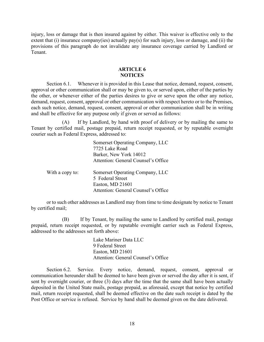 18 injury, loss or damage that is then insured against by either. This waiver is effective only to the extent that (i) insurance company(ies) actually pay(s) for such injury, loss or damage, and (ii) the provisions of this paragraph do not invalidate any insurance coverage carried by Landlord or Tenant. ARTICLE 6 NOTICES Section 6.1. Whenever it is provided in this Lease that notice, demand, request, consent, approval or other communication shall or may be given to, or served upon, either of the parties by the other, or whenever either of the parties desires to give or serve upon the other any notice, demand, request, consent, approval or other communication with respect hereto or to the Premises, each such notice, demand, request, consent, approval or other communication shall be in writing and shall be effective for any purpose only if given or served as follows: (A) If by Landlord, by hand with proof of delivery or by mailing the same to Tenant by certified mail, postage prepaid, return receipt requested, or by reputable overnight courier such as Federal Express, addressed to: Somerset Operating Company, LLC 7725 Lake Road Barker, New York 14012 Attention: General Counsel’s Office With a copy to: Somerset Operating Company, LLC 5 Federal Street Easton, MD 21601 Attention: General Counsel’s Office or to such other addresses as Landlord may from time to time designate by notice to Tenant by certified mail; (B) If by Tenant, by mailing the same to Landlord by certified mail, postage prepaid, return receipt requested, or by reputable overnight carrier such as Federal Express, addressed to the addresses set forth above: Lake Mariner Data LLC 9 Federal Street Easton, MD 21601 Attention: General Counsel’s Office Section 6.2. Service. Every notice, demand, request, consent, approval or communication hereunder shall be deemed to have been given or served the day after it is sent, if sent by overnight courier, or three (3) days after the time that the same shall have been actually deposited in the United State mails, postage prepaid, as aforesaid, except that notice by certified mail, return receipt requested, shall be deemed effective on the date such receipt is dated by the Post Office or service is refused. Service by hand shall be deemed given on the date delivered.