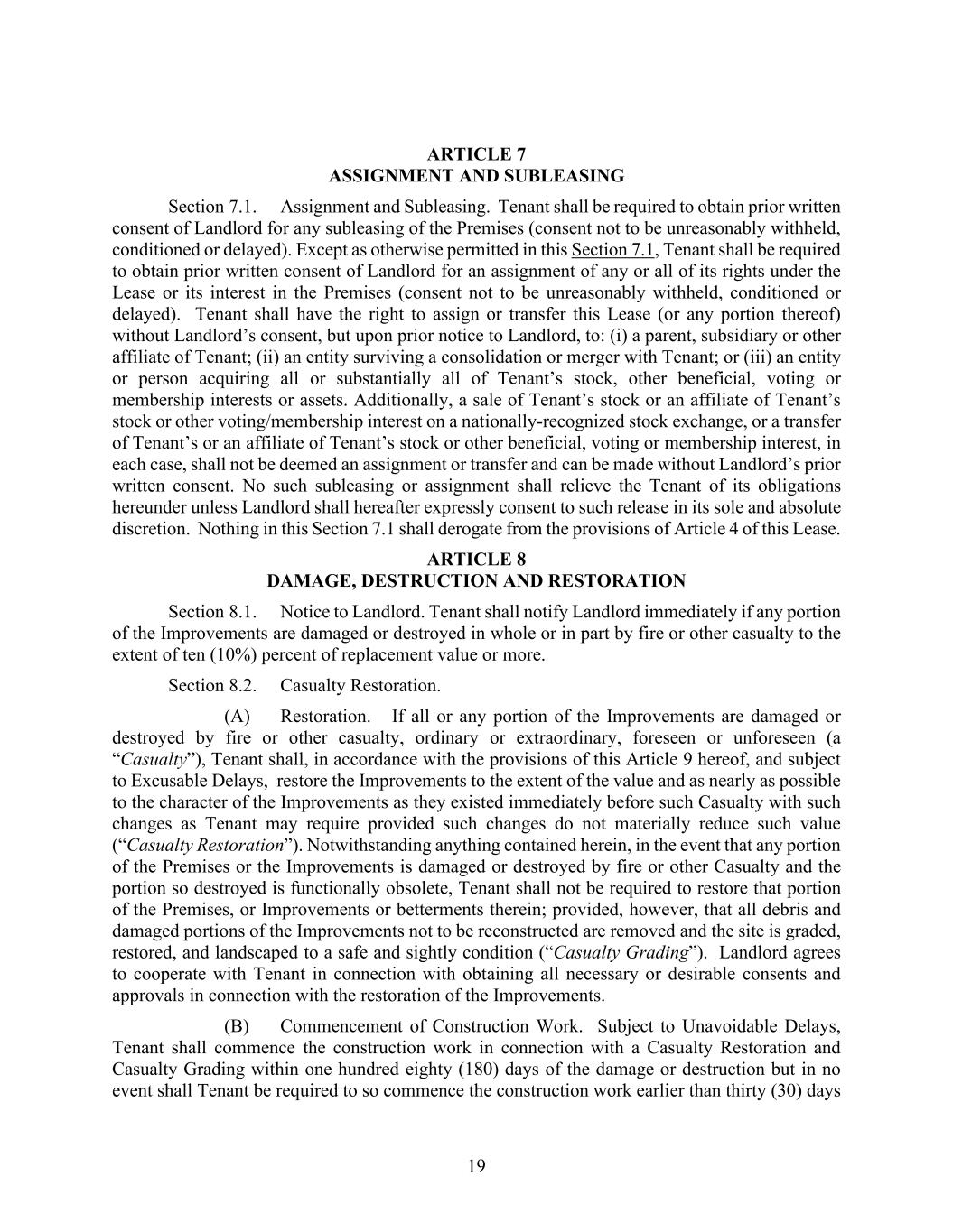 19 ARTICLE 7 ASSIGNMENT AND SUBLEASING Section 7.1. Assignment and Subleasing. Tenant shall be required to obtain prior written consent of Landlord for any subleasing of the Premises (consent not to be unreasonably withheld, conditioned or delayed). Except as otherwise permitted in this Section 7.1, Tenant shall be required to obtain prior written consent of Landlord for an assignment of any or all of its rights under the Lease or its interest in the Premises (consent not to be unreasonably withheld, conditioned or delayed). Tenant shall have the right to assign or transfer this Lease (or any portion thereof) without Landlord’s consent, but upon prior notice to Landlord, to: (i) a parent, subsidiary or other affiliate of Tenant; (ii) an entity surviving a consolidation or merger with Tenant; or (iii) an entity or person acquiring all or substantially all of Tenant’s stock, other beneficial, voting or membership interests or assets. Additionally, a sale of Tenant’s stock or an affiliate of Tenant’s stock or other voting/membership interest on a nationally-recognized stock exchange, or a transfer of Tenant’s or an affiliate of Tenant’s stock or other beneficial, voting or membership interest, in each case, shall not be deemed an assignment or transfer and can be made without Landlord’s prior written consent. No such subleasing or assignment shall relieve the Tenant of its obligations hereunder unless Landlord shall hereafter expressly consent to such release in its sole and absolute discretion. Nothing in this Section 7.1 shall derogate from the provisions of Article 4 of this Lease. ARTICLE 8 DAMAGE, DESTRUCTION AND RESTORATION Section 8.1. Notice to Landlord. Tenant shall notify Landlord immediately if any portion of the Improvements are damaged or destroyed in whole or in part by fire or other casualty to the extent of ten (10%) percent of replacement value or more. Section 8.2. Casualty Restoration. (A) Restoration. If all or any portion of the Improvements are damaged or destroyed by fire or other casualty, ordinary or extraordinary, foreseen or unforeseen (a “Casualty”), Tenant shall, in accordance with the provisions of this Article 9 hereof, and subject to Excusable Delays, restore the Improvements to the extent of the value and as nearly as possible to the character of the Improvements as they existed immediately before such Casualty with such changes as Tenant may require provided such changes do not materially reduce such value (“Casualty Restoration”). Notwithstanding anything contained herein, in the event that any portion of the Premises or the Improvements is damaged or destroyed by fire or other Casualty and the portion so destroyed is functionally obsolete, Tenant shall not be required to restore that portion of the Premises, or Improvements or betterments therein; provided, however, that all debris and damaged portions of the Improvements not to be reconstructed are removed and the site is graded, restored, and landscaped to a safe and sightly condition (“Casualty Grading”). Landlord agrees to cooperate with Tenant in connection with obtaining all necessary or desirable consents and approvals in connection with the restoration of the Improvements. (B) Commencement of Construction Work. Subject to Unavoidable Delays, Tenant shall commence the construction work in connection with a Casualty Restoration and Casualty Grading within one hundred eighty (180) days of the damage or destruction but in no event shall Tenant be required to so commence the construction work earlier than thirty (30) days