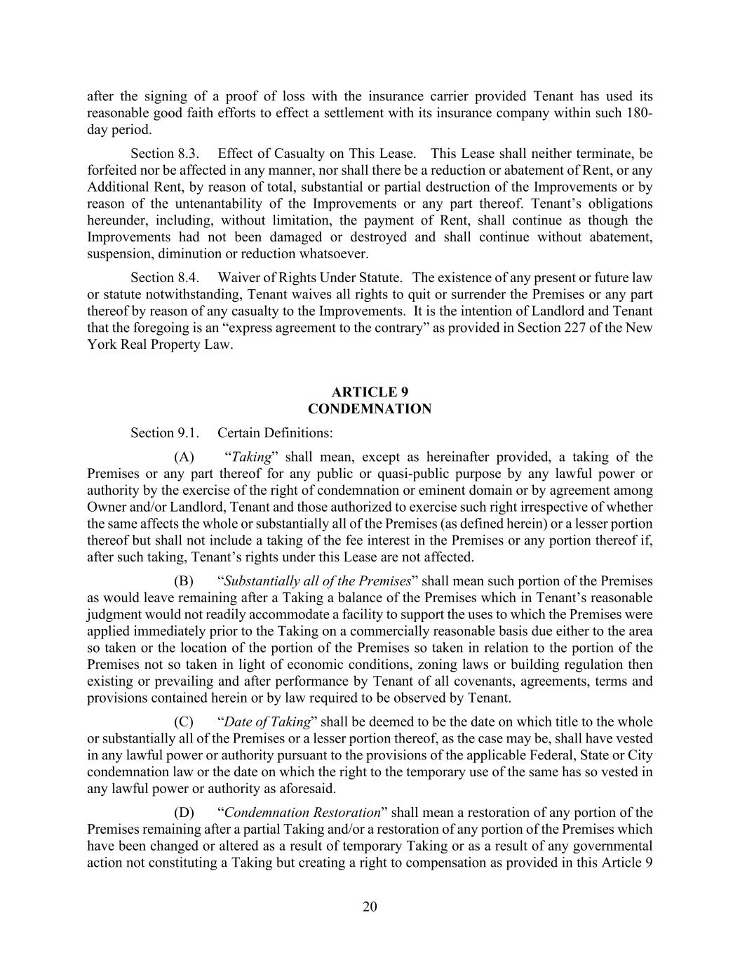 20 after the signing of a proof of loss with the insurance carrier provided Tenant has used its reasonable good faith efforts to effect a settlement with its insurance company within such 180- day period. Section 8.3. Effect of Casualty on This Lease. This Lease shall neither terminate, be forfeited nor be affected in any manner, nor shall there be a reduction or abatement of Rent, or any Additional Rent, by reason of total, substantial or partial destruction of the Improvements or by reason of the untenantability of the Improvements or any part thereof. Tenant’s obligations hereunder, including, without limitation, the payment of Rent, shall continue as though the Improvements had not been damaged or destroyed and shall continue without abatement, suspension, diminution or reduction whatsoever. Section 8.4. Waiver of Rights Under Statute. The existence of any present or future law or statute notwithstanding, Tenant waives all rights to quit or surrender the Premises or any part thereof by reason of any casualty to the Improvements. It is the intention of Landlord and Tenant that the foregoing is an “express agreement to the contrary” as provided in Section 227 of the New York Real Property Law. ARTICLE 9 CONDEMNATION Section 9.1. Certain Definitions: (A) “Taking” shall mean, except as hereinafter provided, a taking of the Premises or any part thereof for any public or quasi-public purpose by any lawful power or authority by the exercise of the right of condemnation or eminent domain or by agreement among Owner and/or Landlord, Tenant and those authorized to exercise such right irrespective of whether the same affects the whole or substantially all of the Premises (as defined herein) or a lesser portion thereof but shall not include a taking of the fee interest in the Premises or any portion thereof if, after such taking, Tenant’s rights under this Lease are not affected. (B) “Substantially all of the Premises” shall mean such portion of the Premises as would leave remaining after a Taking a balance of the Premises which in Tenant’s reasonable judgment would not readily accommodate a facility to support the uses to which the Premises were applied immediately prior to the Taking on a commercially reasonable basis due either to the area so taken or the location of the portion of the Premises so taken in relation to the portion of the Premises not so taken in light of economic conditions, zoning laws or building regulation then existing or prevailing and after performance by Tenant of all covenants, agreements, terms and provisions contained herein or by law required to be observed by Tenant. (C) “Date of Taking” shall be deemed to be the date on which title to the whole or substantially all of the Premises or a lesser portion thereof, as the case may be, shall have vested in any lawful power or authority pursuant to the provisions of the applicable Federal, State or City condemnation law or the date on which the right to the temporary use of the same has so vested in any lawful power or authority as aforesaid. (D) “Condemnation Restoration” shall mean a restoration of any portion of the Premises remaining after a partial Taking and/or a restoration of any portion of the Premises which have been changed or altered as a result of temporary Taking or as a result of any governmental action not constituting a Taking but creating a right to compensation as provided in this Article 9