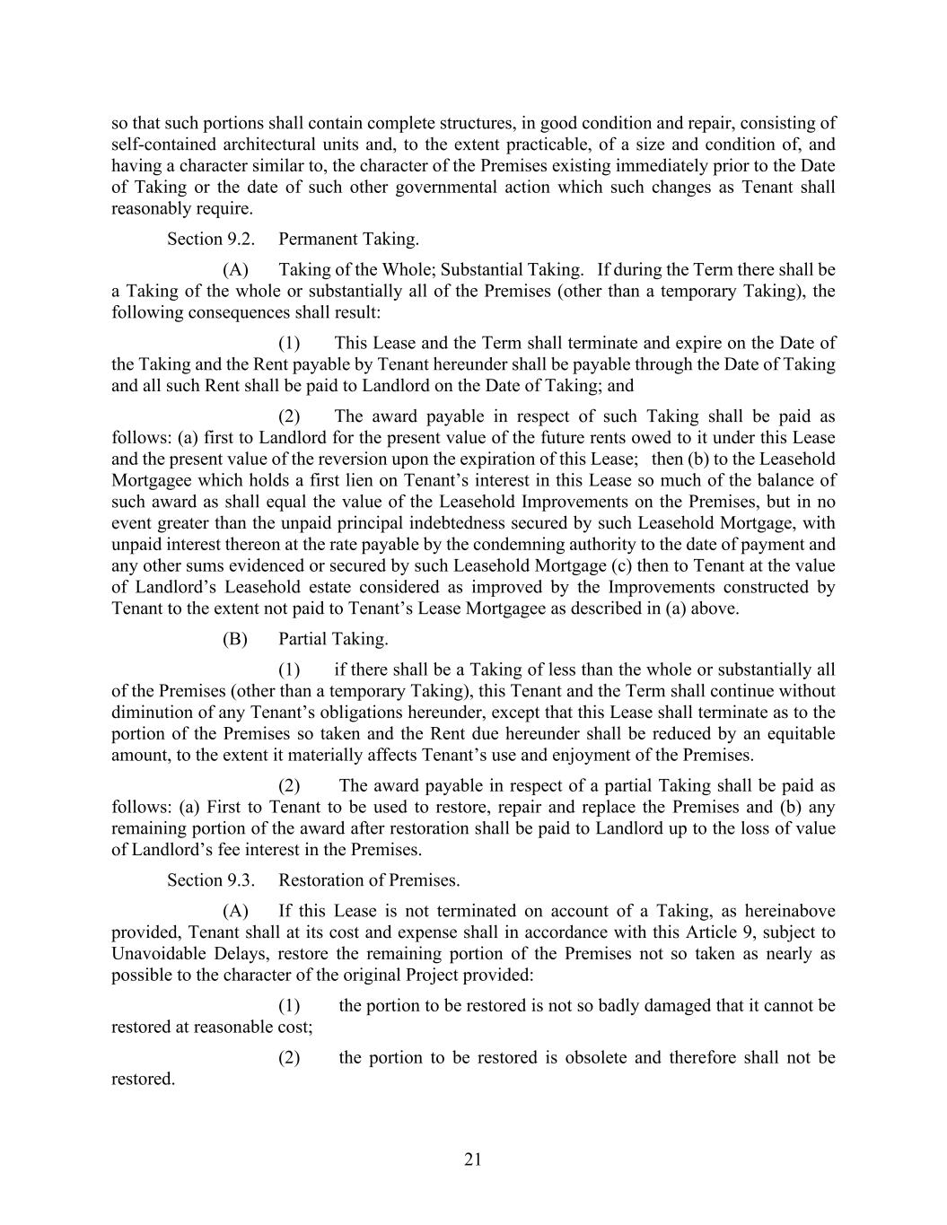 21 so that such portions shall contain complete structures, in good condition and repair, consisting of self-contained architectural units and, to the extent practicable, of a size and condition of, and having a character similar to, the character of the Premises existing immediately prior to the Date of Taking or the date of such other governmental action which such changes as Tenant shall reasonably require. Section 9.2. Permanent Taking. (A) Taking of the Whole; Substantial Taking. If during the Term there shall be a Taking of the whole or substantially all of the Premises (other than a temporary Taking), the following consequences shall result: (1) This Lease and the Term shall terminate and expire on the Date of the Taking and the Rent payable by Tenant hereunder shall be payable through the Date of Taking and all such Rent shall be paid to Landlord on the Date of Taking; and (2) The award payable in respect of such Taking shall be paid as follows: (a) first to Landlord for the present value of the future rents owed to it under this Lease and the present value of the reversion upon the expiration of this Lease; then (b) to the Leasehold Mortgagee which holds a first lien on Tenant’s interest in this Lease so much of the balance of such award as shall equal the value of the Leasehold Improvements on the Premises, but in no event greater than the unpaid principal indebtedness secured by such Leasehold Mortgage, with unpaid interest thereon at the rate payable by the condemning authority to the date of payment and any other sums evidenced or secured by such Leasehold Mortgage (c) then to Tenant at the value of Landlord’s Leasehold estate considered as improved by the Improvements constructed by Tenant to the extent not paid to Tenant’s Lease Mortgagee as described in (a) above. (B) Partial Taking. (1) if there shall be a Taking of less than the whole or substantially all of the Premises (other than a temporary Taking), this Tenant and the Term shall continue without diminution of any Tenant’s obligations hereunder, except that this Lease shall terminate as to the portion of the Premises so taken and the Rent due hereunder shall be reduced by an equitable amount, to the extent it materially affects Tenant’s use and enjoyment of the Premises. (2) The award payable in respect of a partial Taking shall be paid as follows: (a) First to Tenant to be used to restore, repair and replace the Premises and (b) any remaining portion of the award after restoration shall be paid to Landlord up to the loss of value of Landlord’s fee interest in the Premises. Section 9.3. Restoration of Premises. (A) If this Lease is not terminated on account of a Taking, as hereinabove provided, Tenant shall at its cost and expense shall in accordance with this Article 9, subject to Unavoidable Delays, restore the remaining portion of the Premises not so taken as nearly as possible to the character of the original Project provided: (1) the portion to be restored is not so badly damaged that it cannot be restored at reasonable cost; (2) the portion to be restored is obsolete and therefore shall not be restored.