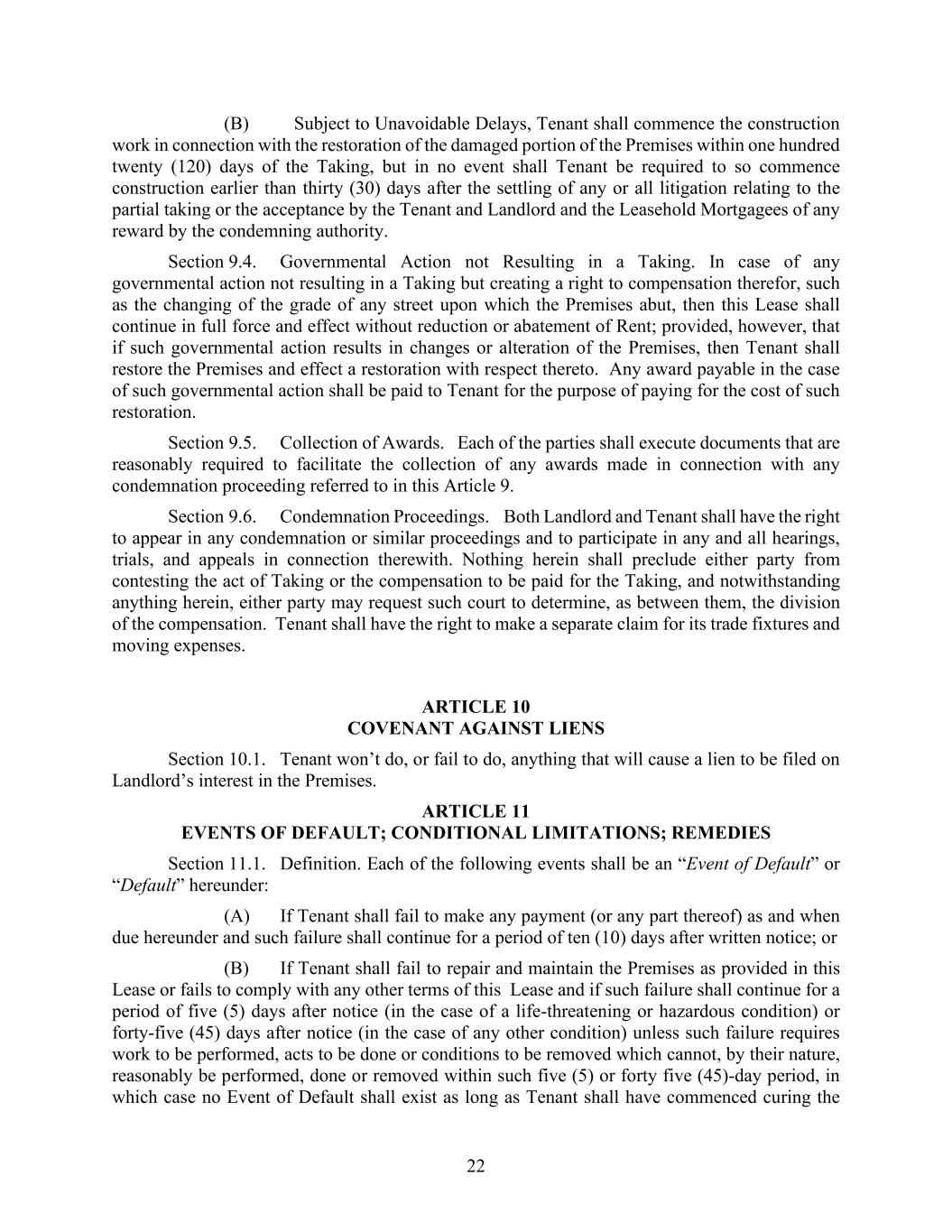 22 (B) Subject to Unavoidable Delays, Tenant shall commence the construction work in connection with the restoration of the damaged portion of the Premises within one hundred twenty (120) days of the Taking, but in no event shall Tenant be required to so commence construction earlier than thirty (30) days after the settling of any or all litigation relating to the partial taking or the acceptance by the Tenant and Landlord and the Leasehold Mortgagees of any reward by the condemning authority. Section 9.4. Governmental Action not Resulting in a Taking. In case of any governmental action not resulting in a Taking but creating a right to compensation therefor, such as the changing of the grade of any street upon which the Premises abut, then this Lease shall continue in full force and effect without reduction or abatement of Rent; provided, however, that if such governmental action results in changes or alteration of the Premises, then Tenant shall restore the Premises and effect a restoration with respect thereto. Any award payable in the case of such governmental action shall be paid to Tenant for the purpose of paying for the cost of such restoration. Section 9.5. Collection of Awards. Each of the parties shall execute documents that are reasonably required to facilitate the collection of any awards made in connection with any condemnation proceeding referred to in this Article 9. Section 9.6. Condemnation Proceedings. Both Landlord and Tenant shall have the right to appear in any condemnation or similar proceedings and to participate in any and all hearings, trials, and appeals in connection therewith. Nothing herein shall preclude either party from contesting the act of Taking or the compensation to be paid for the Taking, and notwithstanding anything herein, either party may request such court to determine, as between them, the division of the compensation. Tenant shall have the right to make a separate claim for its trade fixtures and moving expenses. ARTICLE 10 COVENANT AGAINST LIENS Section 10.1. Tenant won’t do, or fail to do, anything that will cause a lien to be filed on Landlord’s interest in the Premises. ARTICLE 11 EVENTS OF DEFAULT; CONDITIONAL LIMITATIONS; REMEDIES Section 11.1. Definition. Each of the following events shall be an “Event of Default” or “Default” hereunder: (A) If Tenant shall fail to make any payment (or any part thereof) as and when due hereunder and such failure shall continue for a period of ten (10) days after written notice; or (B) If Tenant shall fail to repair and maintain the Premises as provided in this Lease or fails to comply with any other terms of this Lease and if such failure shall continue for a period of five (5) days after notice (in the case of a life-threatening or hazardous condition) or forty-five (45) days after notice (in the case of any other condition) unless such failure requires work to be performed, acts to be done or conditions to be removed which cannot, by their nature, reasonably be performed, done or removed within such five (5) or forty five (45)-day period, in which case no Event of Default shall exist as long as Tenant shall have commenced curing the