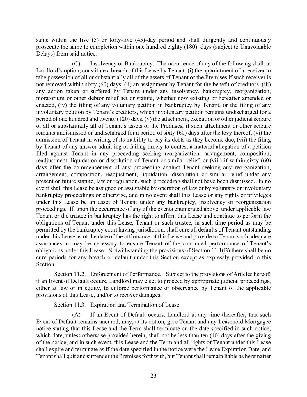 23 same within the five (5) or forty-five (45)-day period and shall diligently and continuously prosecute the same to completion within one hundred eighty (180) days (subject to Unavoidable Delays) from said notice. (C) Insolvency or Bankruptcy. The occurrence of any of the following shall, at Landlord’s option, constitute a breach of this Lease by Tenant: (i) the appointment of a receiver to take possession of all or substantially all of the assets of Tenant or the Premises if such receiver is not removed within sixty (60) days, (ii) an assignment by Tenant for the benefit of creditors, (iii) any action taken or suffered by Tenant under any insolvency, bankruptcy, reorganization, moratorium or other debtor relief act or statute, whether now existing or hereafter amended or enacted, (iv) the filing of any voluntary petition in bankruptcy by Tenant, or the filing of any involuntary petition by Tenant’s creditors, which involuntary petition remains undischarged for a period of one hundred and twenty (120) days, (v) the attachment, execution or other judicial seizure of all or substantially all of Tenant’s assets or the Premises, if such attachment or other seizure remains undismissed or undischarged for a period of sixty (60) days after the levy thereof, (vi) the admission of Tenant in writing of its inability to pay its debts as they become due, (vii) the filing by Tenant of any answer admitting or failing timely to contest a material allegation of a petition filed against Tenant in any proceeding seeking reorganization, arrangement, composition, readjustment, liquidation or dissolution of Tenant or similar relief, or (viii) if within sixty (60) days after the commencement of any proceeding against Tenant seeking any reorganization, arrangement, composition, readjustment, liquidation, dissolution or similar relief under any present or future statute, law or regulation, such proceeding shall not have been dismissed. In no event shall this Lease be assigned or assignable by operation of law or by voluntary or involuntary bankruptcy proceedings or otherwise, and in no event shall this Lease or any rights or privileges under this Lease be an asset of Tenant under any bankruptcy, insolvency or reorganization proceedings. If, upon the occurrence of any of the events enumerated above, under applicable law Tenant or the trustee in bankruptcy has the right to affirm this Lease and continue to perform the obligations of Tenant under this Lease, Tenant or such trustee, in such time period as may be permitted by the bankruptcy court having jurisdiction, shall cure all defaults of Tenant outstanding under this Lease as of the date of the affirmance of this Lease and provide to Tenant such adequate assurances as may be necessary to ensure Tenant of the continued performance of Tenant’s obligations under this Lease. Notwithstanding the provisions of Section 11.1(B) there shall be no cure periods for any breach or default under this Section except as expressly provided in this Section. Section 11.2. Enforcement of Performance. Subject to the provisions of Articles hereof; if an Event of Default occurs, Landlord may elect to proceed by appropriate judicial proceedings, either at law or in equity, to enforce performance or observance by Tenant of the applicable provisions of this Lease, and/or to recover damages. Section 11.3. Expiration and Termination of Lease. (A) If an Event of Default occurs, Landlord at any time thereafter, that such Event of Default remains uncured, may, at its option, give Tenant and any Leasehold Mortgagee notice stating that this Lease and the Term shall terminate on the date specified in such notice, which date, unless otherwise provided herein, shall not be less than ten (10) days after the giving of the notice, and in such event, this Lease and the Term and all rights of Tenant under this Lease shall expire and terminate as if the date specified in the notice were the Lease Expiration Date, and Tenant shall quit and surrender the Premises forthwith, but Tenant shall remain liable as hereinafter