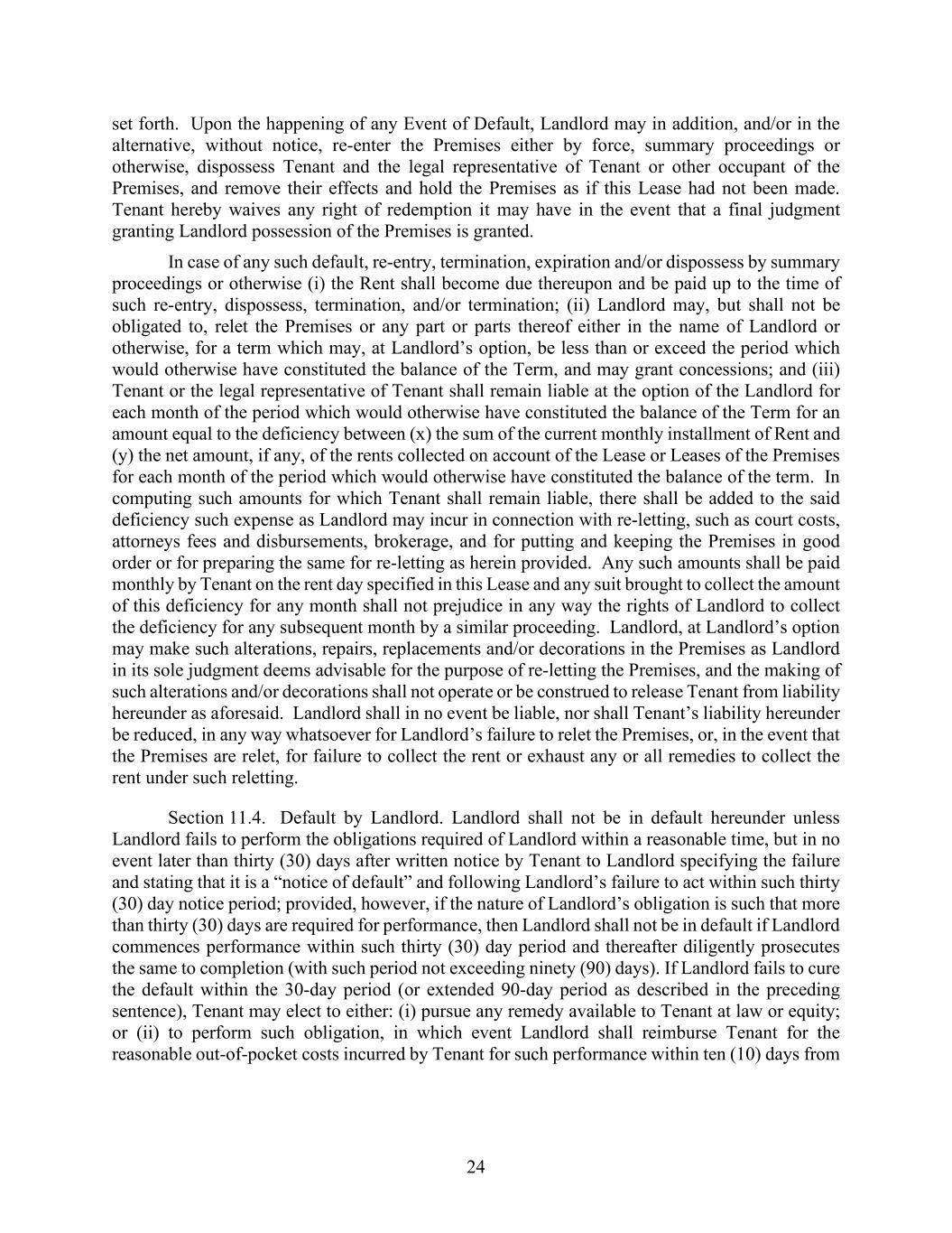 24 set forth. Upon the happening of any Event of Default, Landlord may in addition, and/or in the alternative, without notice, re-enter the Premises either by force, summary proceedings or otherwise, dispossess Tenant and the legal representative of Tenant or other occupant of the Premises, and remove their effects and hold the Premises as if this Lease had not been made. Tenant hereby waives any right of redemption it may have in the event that a final judgment granting Landlord possession of the Premises is granted. In case of any such default, re-entry, termination, expiration and/or dispossess by summary proceedings or otherwise (i) the Rent shall become due thereupon and be paid up to the time of such re-entry, dispossess, termination, and/or termination; (ii) Landlord may, but shall not be obligated to, relet the Premises or any part or parts thereof either in the name of Landlord or otherwise, for a term which may, at Landlord’s option, be less than or exceed the period which would otherwise have constituted the balance of the Term, and may grant concessions; and (iii) Tenant or the legal representative of Tenant shall remain liable at the option of the Landlord for each month of the period which would otherwise have constituted the balance of the Term for an amount equal to the deficiency between (x) the sum of the current monthly installment of Rent and (y) the net amount, if any, of the rents collected on account of the Lease or Leases of the Premises for each month of the period which would otherwise have constituted the balance of the term. In computing such amounts for which Tenant shall remain liable, there shall be added to the said deficiency such expense as Landlord may incur in connection with re-letting, such as court costs, attorneys fees and disbursements, brokerage, and for putting and keeping the Premises in good order or for preparing the same for re-letting as herein provided. Any such amounts shall be paid monthly by Tenant on the rent day specified in this Lease and any suit brought to collect the amount of this deficiency for any month shall not prejudice in any way the rights of Landlord to collect the deficiency for any subsequent month by a similar proceeding. Landlord, at Landlord’s option may make such alterations, repairs, replacements and/or decorations in the Premises as Landlord in its sole judgment deems advisable for the purpose of re-letting the Premises, and the making of such alterations and/or decorations shall not operate or be construed to release Tenant from liability hereunder as aforesaid. Landlord shall in no event be liable, nor shall Tenant’s liability hereunder be reduced, in any way whatsoever for Landlord’s failure to relet the Premises, or, in the event that the Premises are relet, for failure to collect the rent or exhaust any or all remedies to collect the rent under such reletting. Section 11.4. Default by Landlord. Landlord shall not be in default hereunder unless Landlord fails to perform the obligations required of Landlord within a reasonable time, but in no event later than thirty (30) days after written notice by Tenant to Landlord specifying the failure and stating that it is a “notice of default” and following Landlord’s failure to act within such thirty (30) day notice period; provided, however, if the nature of Landlord’s obligation is such that more than thirty (30) days are required for performance, then Landlord shall not be in default if Landlord commences performance within such thirty (30) day period and thereafter diligently prosecutes the same to completion (with such period not exceeding ninety (90) days). If Landlord fails to cure the default within the 30-day period (or extended 90-day period as described in the preceding sentence), Tenant may elect to either: (i) pursue any remedy available to Tenant at law or equity; or (ii) to perform such obligation, in which event Landlord shall reimburse Tenant for the reasonable out-of-pocket costs incurred by Tenant for such performance within ten (10) days from