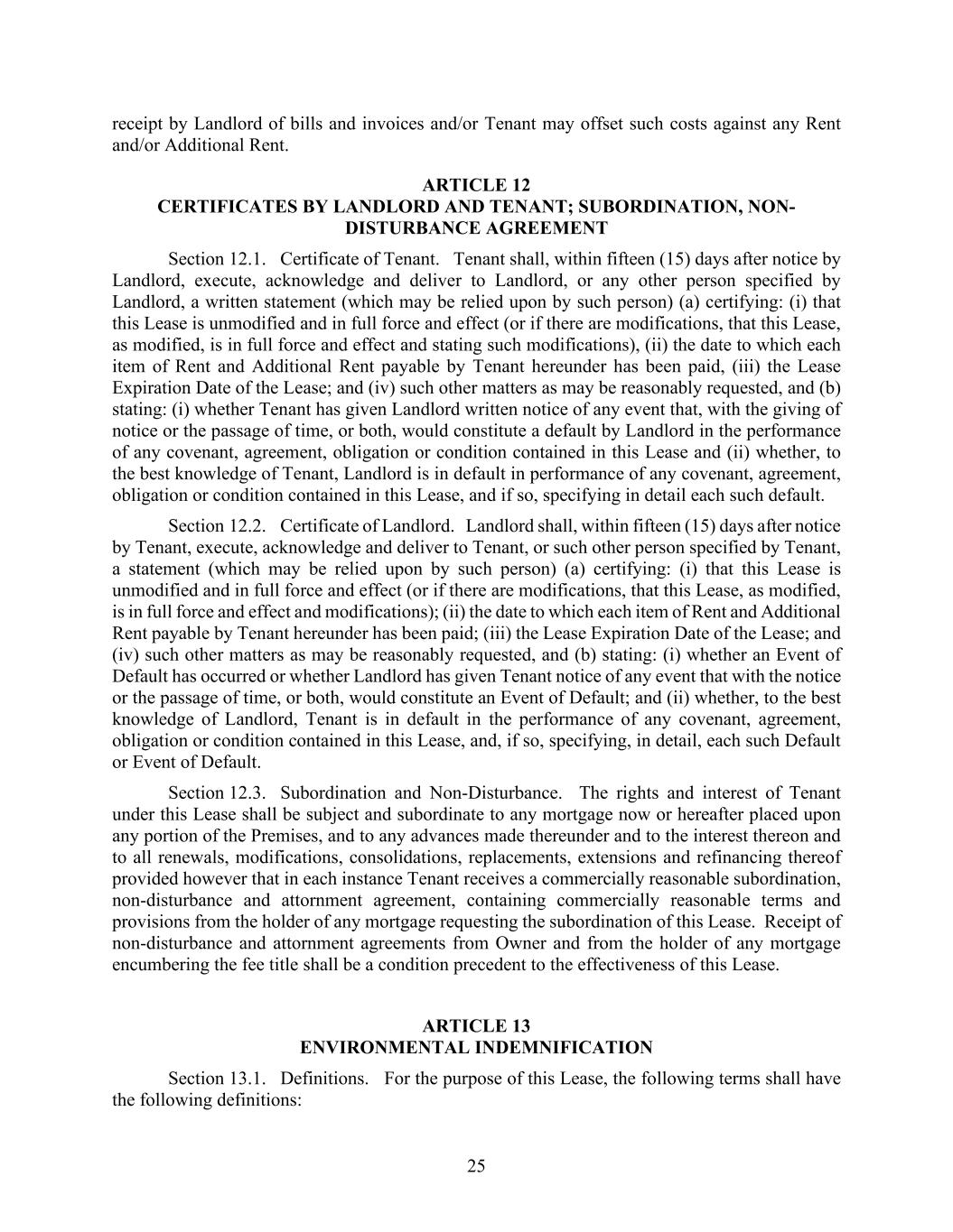 25 receipt by Landlord of bills and invoices and/or Tenant may offset such costs against any Rent and/or Additional Rent. ARTICLE 12 CERTIFICATES BY LANDLORD AND TENANT; SUBORDINATION, NON- DISTURBANCE AGREEMENT Section 12.1. Certificate of Tenant. Tenant shall, within fifteen (15) days after notice by Landlord, execute, acknowledge and deliver to Landlord, or any other person specified by Landlord, a written statement (which may be relied upon by such person) (a) certifying: (i) that this Lease is unmodified and in full force and effect (or if there are modifications, that this Lease, as modified, is in full force and effect and stating such modifications), (ii) the date to which each item of Rent and Additional Rent payable by Tenant hereunder has been paid, (iii) the Lease Expiration Date of the Lease; and (iv) such other matters as may be reasonably requested, and (b) stating: (i) whether Tenant has given Landlord written notice of any event that, with the giving of notice or the passage of time, or both, would constitute a default by Landlord in the performance of any covenant, agreement, obligation or condition contained in this Lease and (ii) whether, to the best knowledge of Tenant, Landlord is in default in performance of any covenant, agreement, obligation or condition contained in this Lease, and if so, specifying in detail each such default. Section 12.2. Certificate of Landlord. Landlord shall, within fifteen (15) days after notice by Tenant, execute, acknowledge and deliver to Tenant, or such other person specified by Tenant, a statement (which may be relied upon by such person) (a) certifying: (i) that this Lease is unmodified and in full force and effect (or if there are modifications, that this Lease, as modified, is in full force and effect and modifications); (ii) the date to which each item of Rent and Additional Rent payable by Tenant hereunder has been paid; (iii) the Lease Expiration Date of the Lease; and (iv) such other matters as may be reasonably requested, and (b) stating: (i) whether an Event of Default has occurred or whether Landlord has given Tenant notice of any event that with the notice or the passage of time, or both, would constitute an Event of Default; and (ii) whether, to the best knowledge of Landlord, Tenant is in default in the performance of any covenant, agreement, obligation or condition contained in this Lease, and, if so, specifying, in detail, each such Default or Event of Default. Section 12.3. Subordination and Non-Disturbance. The rights and interest of Tenant under this Lease shall be subject and subordinate to any mortgage now or hereafter placed upon any portion of the Premises, and to any advances made thereunder and to the interest thereon and to all renewals, modifications, consolidations, replacements, extensions and refinancing thereof provided however that in each instance Tenant receives a commercially reasonable subordination, non-disturbance and attornment agreement, containing commercially reasonable terms and provisions from the holder of any mortgage requesting the subordination of this Lease. Receipt of non-disturbance and attornment agreements from Owner and from the holder of any mortgage encumbering the fee title shall be a condition precedent to the effectiveness of this Lease. ARTICLE 13 ENVIRONMENTAL INDEMNIFICATION Section 13.1. Definitions. For the purpose of this Lease, the following terms shall have the following definitions: