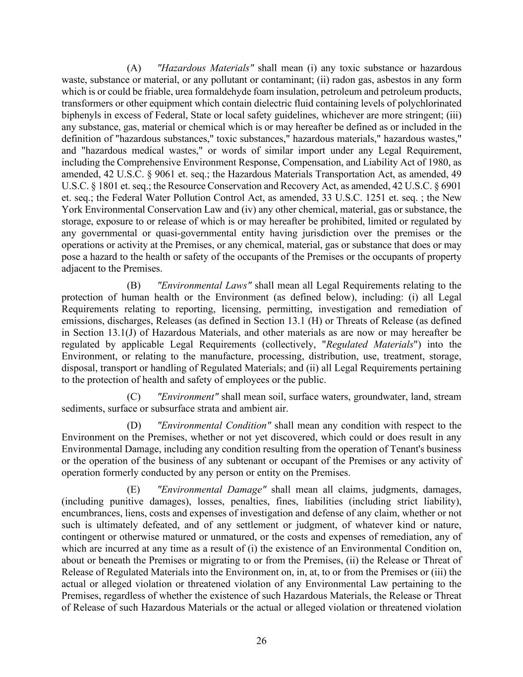 26 (A) "Hazardous Materials" shall mean (i) any toxic substance or hazardous waste, substance or material, or any pollutant or contaminant; (ii) radon gas, asbestos in any form which is or could be friable, urea formaldehyde foam insulation, petroleum and petroleum products, transformers or other equipment which contain dielectric fluid containing levels of polychlorinated biphenyls in excess of Federal, State or local safety guidelines, whichever are more stringent; (iii) any substance, gas, material or chemical which is or may hereafter be defined as or included in the definition of "hazardous substances," toxic substances," hazardous materials," hazardous wastes," and "hazardous medical wastes," or words of similar import under any Legal Requirement, including the Comprehensive Environment Response, Compensation, and Liability Act of 1980, as amended, 42 U.S.C. § 9061 et. seq.; the Hazardous Materials Transportation Act, as amended, 49 U.S.C. § 1801 et. seq.; the Resource Conservation and Recovery Act, as amended, 42 U.S.C. § 6901 et. seq.; the Federal Water Pollution Control Act, as amended, 33 U.S.C. 1251 et. seq. ; the New York Environmental Conservation Law and (iv) any other chemical, material, gas or substance, the storage, exposure to or release of which is or may hereafter be prohibited, limited or regulated by any governmental or quasi-governmental entity having jurisdiction over the premises or the operations or activity at the Premises, or any chemical, material, gas or substance that does or may pose a hazard to the health or safety of the occupants of the Premises or the occupants of property adjacent to the Premises. (B) "Environmental Laws" shall mean all Legal Requirements relating to the protection of human health or the Environment (as defined below), including: (i) all Legal Requirements relating to reporting, licensing, permitting, investigation and remediation of emissions, discharges, Releases (as defined in Section 13.1 (H) or Threats of Release (as defined in Section 13.1(J) of Hazardous Materials, and other materials as are now or may hereafter be regulated by applicable Legal Requirements (collectively, "Regulated Materials") into the Environment, or relating to the manufacture, processing, distribution, use, treatment, storage, disposal, transport or handling of Regulated Materials; and (ii) all Legal Requirements pertaining to the protection of health and safety of employees or the public. (C) "Environment" shall mean soil, surface waters, groundwater, land, stream sediments, surface or subsurface strata and ambient air. (D) "Environmental Condition" shall mean any condition with respect to the Environment on the Premises, whether or not yet discovered, which could or does result in any Environmental Damage, including any condition resulting from the operation of Tenant's business or the operation of the business of any subtenant or occupant of the Premises or any activity of operation formerly conducted by any person or entity on the Premises. (E) "Environmental Damage" shall mean all claims, judgments, damages, (including punitive damages), losses, penalties, fines, liabilities (including strict liability), encumbrances, liens, costs and expenses of investigation and defense of any claim, whether or not such is ultimately defeated, and of any settlement or judgment, of whatever kind or nature, contingent or otherwise matured or unmatured, or the costs and expenses of remediation, any of which are incurred at any time as a result of (i) the existence of an Environmental Condition on, about or beneath the Premises or migrating to or from the Premises, (ii) the Release or Threat of Release of Regulated Materials into the Environment on, in, at, to or from the Premises or (iii) the actual or alleged violation or threatened violation of any Environmental Law pertaining to the Premises, regardless of whether the existence of such Hazardous Materials, the Release or Threat of Release of such Hazardous Materials or the actual or alleged violation or threatened violation