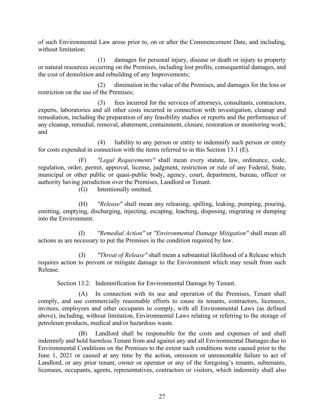 27 of such Environmental Law arose prior to, on or after the Commencement Date, and including, without limitation: (1) damages for personal injury, disease or death or injury to property or natural resources occurring on the Premises, including lost profits, consequential damages, and the cost of demolition and rebuilding of any Improvements; (2) diminution in the value of the Premises, and damages for the loss or restriction on the use of the Premises; (3) fees incurred for the services of attorneys, consultants, contractors, experts, laboratories and all other costs incurred in connection with investigation, cleanup and remediation, including the preparation of any feasibility studies or reports and the performance of any cleanup, remedial, removal, abatement, containment, closure, restoration or monitoring work; and (4) liability to any person or entity to indemnify such person or entity for costs expended in connection with the items referred to in this Section 13.1 (E). (F) "Legal Requirements" shall mean every statute, law, ordinance, code, regulation, order, permit, approval, license, judgment, restriction or rule of any Federal, State, municipal or other public or quasi-public body, agency, court, department, bureau, officer or authority having jurisdiction over the Premises, Landlord or Tenant. (G) Intentionally omitted. (H) "Release" shall mean any releasing, spilling, leaking, pumping, pouring, emitting, emptying, discharging, injecting, escaping, leaching, disposing, migrating or dumping into the Environment. (I) "Remedial Action" or "Environmental Damage Mitigation" shall mean all actions as are necessary to put the Premises in the condition required by law. (J) "Threat of Release" shall mean a substantial likelihood of a Release which requires action to prevent or mitigate damage to the Environment which may result from such Release. Section 13.2. Indemnification for Environmental Damage by Tenant. (A) In connection with its use and operation of the Premises, Tenant shall comply, and use commercially reasonable efforts to cause its tenants, contractors, licensees, invitees, employees and other occupants to comply, with all Environmental Laws (as defined above), including, without limitation, Environmental Laws relating or referring to the storage of petroleum products, medical and/or hazardous waste. (B) Landlord shall be responsible for the costs and expenses of and shall indemnify and hold harmless Tenant from and against any and all Environmental Damages due to Environmental Conditions on the Premises to the extent such conditions were caused prior to the June 1, 2021 or caused at any time by the action, omission or unreasonable failure to act of Landlord, or any prior tenant, owner or operator or any of the foregoing’s tenants, subtenants, licensees, occupants, agents, representatives, contractors or visitors, which indemnity shall also