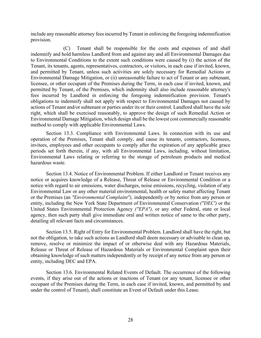 28 include any reasonable attorney fees incurred by Tenant in enforcing the foregoing indemnification provision. (C) Tenant shall be responsible for the costs and expenses of and shall indemnify and hold harmless Landlord from and against any and all Environmental Damages due to Environmental Conditions to the extent such conditions were caused by (i) the action of the Tenant, its tenants, agents, representatives, contractors, or visitors, in each case if invited, known, and permitted by Tenant, unless such activities are solely necessary for Remedial Actions or Environmental Damage Mitigation, or (ii) unreasonable failure to act of Tenant or any subtenant, licensee, or other occupant of the Premises during the Term, in each case if invited, known, and permitted by Tenant, of the Premises, which indemnity shall also include reasonable attorney's fees incurred by Landlord in enforcing the foregoing indemnification provision. Tenant's obligations to indemnify shall not apply with respect to Environmental Damages not caused by actions of Tenant and/or subtenant or parties under its or their control. Landlord shall have the sole right, which shall be exercised reasonably, to approve the design of such Remedial Action or Environmental Damage Mitigation, which design shall be the lowest cost commercially reasonable method to comply with applicable Environmental Laws. Section 13.3. Compliance with Environmental Laws. In connection with its use and operation of the Premises, Tenant shall comply, and cause its tenants, contractors, licensees, invitees, employees and other occupants to comply after the expiration of any applicable grace periods set forth therein, if any, with all Environmental Laws, including, without limitation, Environmental Laws relating or referring to the storage of petroleum products and medical hazardous waste. Section 13.4. Notice of Environmental Problem. If either Landlord or Tenant receives any notice or acquires knowledge of a Release, Threat of Release or Environmental Condition or a notice with regard to air emissions, water discharges, noise emissions, recycling, violation of any Environmental Law or any other material environmental, health or safety matter affecting Tenant or the Premises (an "Environmental Complaint"), independently or by notice from any person or entity, including the New York State Department of Environmental Conservation ("DEC') or the United States Environmental Protection Agency ("EPA"), or any other Federal, state or local agency, then such party shall give immediate oral and written notice of same to the other party, detailing all relevant facts and circumstances. Section 13.5. Right of Entry for Environmental Problem. Landlord shall have the right, but not the obligation, to take such actions as Landlord shall deem necessary or advisable to clean up, remove, resolve or minimize the impact of or otherwise deal with any Hazardous Materials, Release or Threat of Release of Hazardous Materials or Environmental Complaint upon their obtaining knowledge of such matters independently or by receipt of any notice from any person or entity, including DEC and EPA. Section 13.6. Environmental Related Events of Default. The occurrence of the following events, if they arise out of the actions or inactions of Tenant (or any tenant, licensee or other occupant of the Premises during the Term, in each case if invited, known, and permitted by and under the control of Tenant), shall constitute an Event of Default under this Lease.