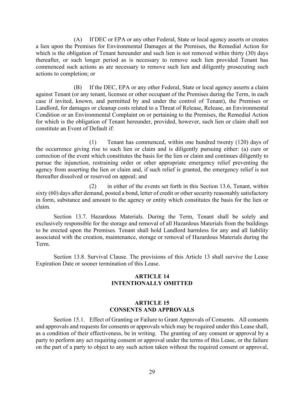 29 (A) If DEC or EPA or any other Federal, State or local agency asserts or creates a lien upon the Premises for Environmental Damages at the Premises, the Remedial Action for which is the obligation of Tenant hereunder and such lien is not removed within thirty (30) days thereafter, or such longer period as is necessary to remove such lien provided Tenant has commenced such actions as are necessary to remove such lien and diligently prosecuting such actions to completion; or (B) If the DEC, EPA or any other Federal, State or local agency asserts a claim against Tenant (or any tenant, licensee or other occupant of the Premises during the Term, in each case if invited, known, and permitted by and under the control of Tenant), the Premises or Landlord, for damages or cleanup costs related to a Threat of Release, Release, an Environmental Condition or an Environmental Complaint on or pertaining to the Premises, the Remedial Action for which is the obligation of Tenant hereunder, provided, however, such lien or claim shall not constitute an Event of Default if: (1) Tenant has commenced, within one hundred twenty (120) days of the occurrence giving rise to such lien or claim and is diligently pursuing either: (a) cure or correction of the event which constitutes the basis for the lien or claim and continues diligently to pursue the injunction, restraining order or other appropriate emergency relief preventing the agency from asserting the lien or claim and, if such relief is granted, the emergency relief is not thereafter dissolved or reserved on appeal; and (2) in either of the events set forth in this Section 13.6, Tenant, within sixty (60) days after demand, posted a bond, letter of credit or other security reasonably satisfactory in form, substance and amount to the agency or entity which constitutes the basis for the lien or claim. Section 13.7. Hazardous Materials. During the Term, Tenant shall be solely and exclusively responsible for the storage and removal of all Hazardous Materials from the buildings to be erected upon the Premises. Tenant shall hold Landlord harmless for any and all liability associated with the creation, maintenance, storage or removal of Hazardous Materials during the Term. Section 13.8. Survival Clause. The provisions of this Article 13 shall survive the Lease Expiration Date or sooner termination of this Lease. ARTICLE 14 INTENTIONALLY OMITTED ARTICLE 15 CONSENTS AND APPROVALS Section 15.1. Effect of Granting or Failure to Grant Approvals of Consents. All consents and approvals and requests for consents or approvals which may be required under this Lease shall, as a condition of their effectiveness, be in writing. The granting of any consent or approval by a party to perform any act requiring consent or approval under the terms of this Lease, or the failure on the part of a party to object to any such action taken without the required consent or approval,