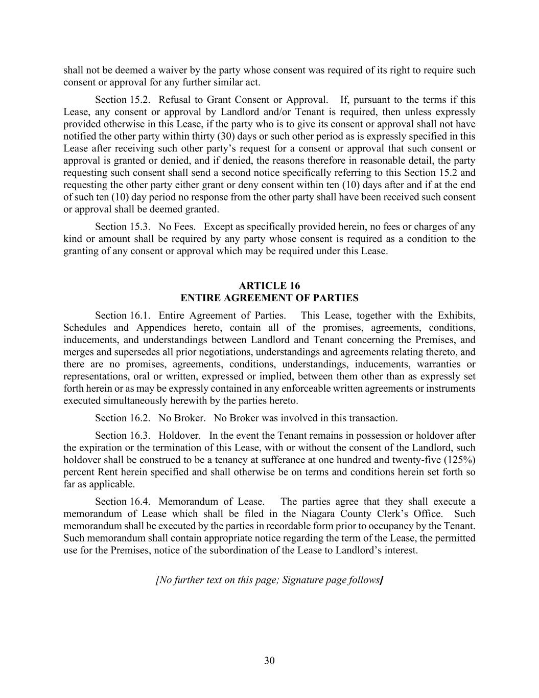 30 shall not be deemed a waiver by the party whose consent was required of its right to require such consent or approval for any further similar act. Section 15.2. Refusal to Grant Consent or Approval. If, pursuant to the terms if this Lease, any consent or approval by Landlord and/or Tenant is required, then unless expressly provided otherwise in this Lease, if the party who is to give its consent or approval shall not have notified the other party within thirty (30) days or such other period as is expressly specified in this Lease after receiving such other party’s request for a consent or approval that such consent or approval is granted or denied, and if denied, the reasons therefore in reasonable detail, the party requesting such consent shall send a second notice specifically referring to this Section 15.2 and requesting the other party either grant or deny consent within ten (10) days after and if at the end of such ten (10) day period no response from the other party shall have been received such consent or approval shall be deemed granted. Section 15.3. No Fees. Except as specifically provided herein, no fees or charges of any kind or amount shall be required by any party whose consent is required as a condition to the granting of any consent or approval which may be required under this Lease. ARTICLE 16 ENTIRE AGREEMENT OF PARTIES Section 16.1. Entire Agreement of Parties. This Lease, together with the Exhibits, Schedules and Appendices hereto, contain all of the promises, agreements, conditions, inducements, and understandings between Landlord and Tenant concerning the Premises, and merges and supersedes all prior negotiations, understandings and agreements relating thereto, and there are no promises, agreements, conditions, understandings, inducements, warranties or representations, oral or written, expressed or implied, between them other than as expressly set forth herein or as may be expressly contained in any enforceable written agreements or instruments executed simultaneously herewith by the parties hereto. Section 16.2. No Broker. No Broker was involved in this transaction. Section 16.3. Holdover. In the event the Tenant remains in possession or holdover after the expiration or the termination of this Lease, with or without the consent of the Landlord, such holdover shall be construed to be a tenancy at sufferance at one hundred and twenty-five (125%) percent Rent herein specified and shall otherwise be on terms and conditions herein set forth so far as applicable. Section 16.4. Memorandum of Lease. The parties agree that they shall execute a memorandum of Lease which shall be filed in the Niagara County Clerk’s Office. Such memorandum shall be executed by the parties in recordable form prior to occupancy by the Tenant. Such memorandum shall contain appropriate notice regarding the term of the Lease, the permitted use for the Premises, notice of the subordination of the Lease to Landlord’s interest. [No further text on this page; Signature page follows]