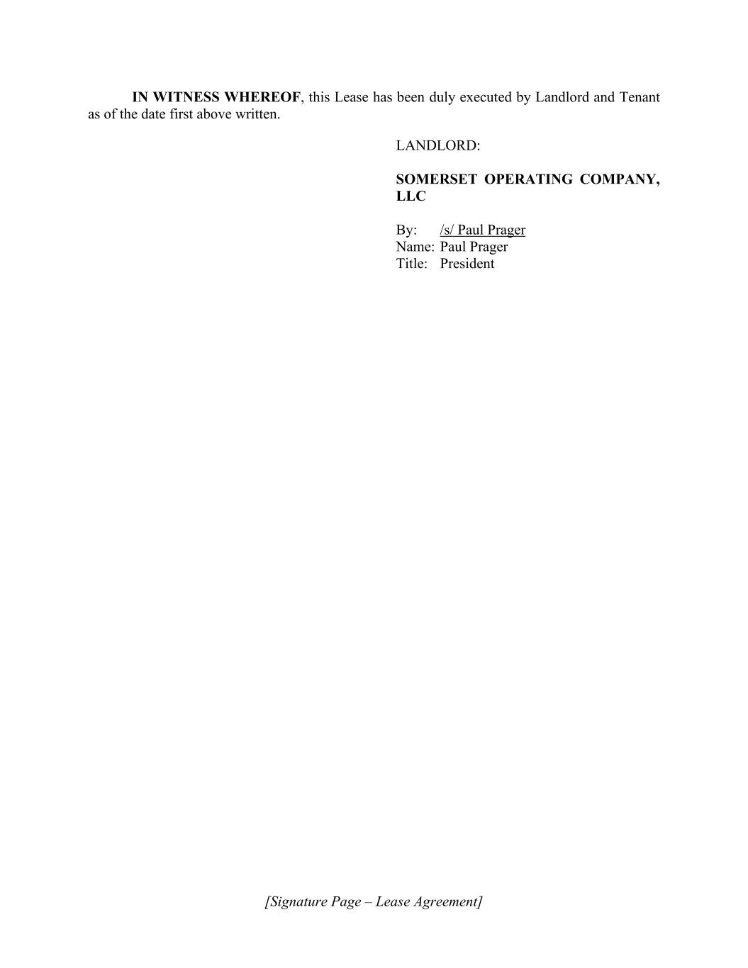 [Signature Page – Lease Agreement] IN WITNESS WHEREOF, this Lease has been duly executed by Landlord and Tenant as of the date first above written. LANDLORD: SOMERSET OPERATING COMPANY, LLC By: /s/ Paul Prager Name: Paul Prager Title: President