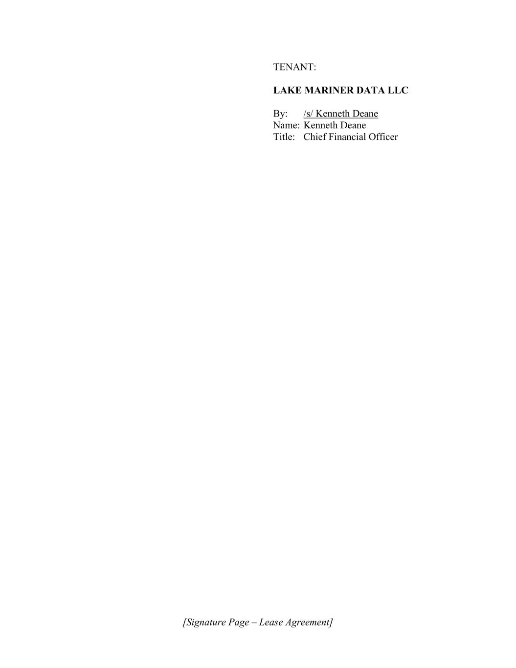 [Signature Page – Lease Agreement] TENANT: LAKE MARINER DATA LLC By: /s/ Kenneth Deane Name: Kenneth Deane Title: Chief Financial Officer