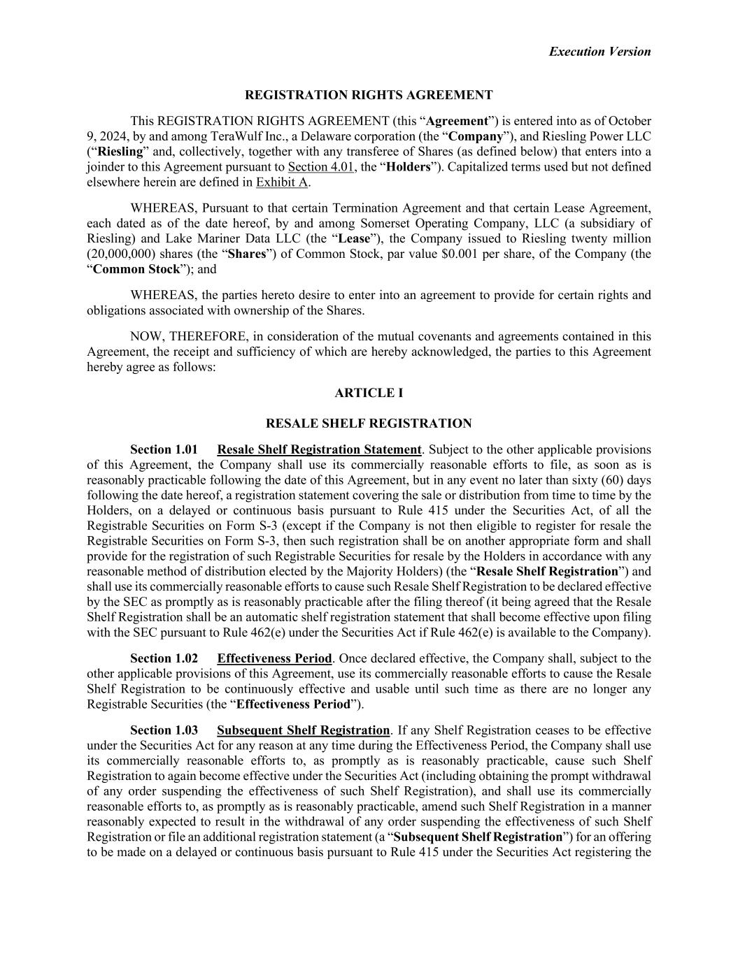Execution Version REGISTRATION RIGHTS AGREEMENT This REGISTRATION RIGHTS AGREEMENT (this “Agreement”) is entered into as of October 9, 2024, by and among TeraWulf Inc., a Delaware corporation (the “Company”), and Riesling Power LLC (“Riesling” and, collectively, together with any transferee of Shares (as defined below) that enters into a joinder to this Agreement pursuant to Section 4.01, the “Holders”). Capitalized terms used but not defined elsewhere herein are defined in Exhibit A. WHEREAS, Pursuant to that certain Termination Agreement and that certain Lease Agreement, each dated as of the date hereof, by and among Somerset Operating Company, LLC (a subsidiary of Riesling) and Lake Mariner Data LLC (the “Lease”), the Company issued to Riesling twenty million (20,000,000) shares (the “Shares”) of Common Stock, par value $0.001 per share, of the Company (the “Common Stock”); and WHEREAS, the parties hereto desire to enter into an agreement to provide for certain rights and obligations associated with ownership of the Shares. NOW, THEREFORE, in consideration of the mutual covenants and agreements contained in this Agreement, the receipt and sufficiency of which are hereby acknowledged, the parties to this Agreement hereby agree as follows: ARTICLE I RESALE SHELF REGISTRATION Section 1.01 Resale Shelf Registration Statement. Subject to the other applicable provisions of this Agreement, the Company shall use its commercially reasonable efforts to file, as soon as is reasonably practicable following the date of this Agreement, but in any event no later than sixty (60) days following the date hereof, a registration statement covering the sale or distribution from time to time by the Holders, on a delayed or continuous basis pursuant to Rule 415 under the Securities Act, of all the Registrable Securities on Form S-3 (except if the Company is not then eligible to register for resale the Registrable Securities on Form S-3, then such registration shall be on another appropriate form and shall provide for the registration of such Registrable Securities for resale by the Holders in accordance with any reasonable method of distribution elected by the Majority Holders) (the “Resale Shelf Registration”) and shall use its commercially reasonable efforts to cause such Resale Shelf Registration to be declared effective by the SEC as promptly as is reasonably practicable after the filing thereof (it being agreed that the Resale Shelf Registration shall be an automatic shelf registration statement that shall become effective upon filing with the SEC pursuant to Rule 462(e) under the Securities Act if Rule 462(e) is available to the Company). Section 1.02 Effectiveness Period. Once declared effective, the Company shall, subject to the other applicable provisions of this Agreement, use its commercially reasonable efforts to cause the Resale Shelf Registration to be continuously effective and usable until such time as there are no longer any Registrable Securities (the “Effectiveness Period”). Section 1.03 Subsequent Shelf Registration. If any Shelf Registration ceases to be effective under the Securities Act for any reason at any time during the Effectiveness Period, the Company shall use its commercially reasonable efforts to, as promptly as is reasonably practicable, cause such Shelf Registration to again become effective under the Securities Act (including obtaining the prompt withdrawal of any order suspending the effectiveness of such Shelf Registration), and shall use its commercially reasonable efforts to, as promptly as is reasonably practicable, amend such Shelf Registration in a manner reasonably expected to result in the withdrawal of any order suspending the effectiveness of such Shelf Registration or file an additional registration statement (a “Subsequent Shelf Registration”) for an offering to be made on a delayed or continuous basis pursuant to Rule 415 under the Securities Act registering the