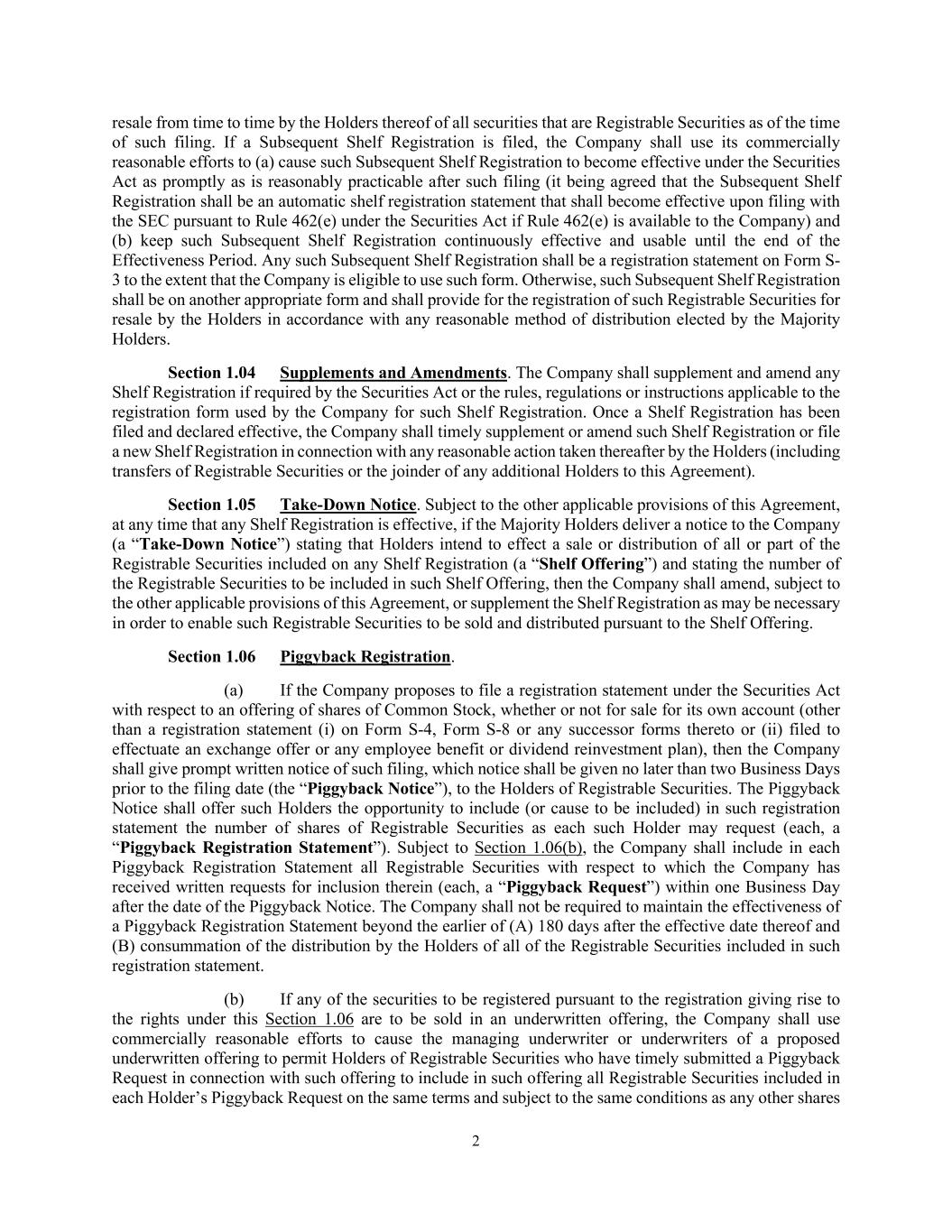 2 resale from time to time by the Holders thereof of all securities that are Registrable Securities as of the time of such filing. If a Subsequent Shelf Registration is filed, the Company shall use its commercially reasonable efforts to (a) cause such Subsequent Shelf Registration to become effective under the Securities Act as promptly as is reasonably practicable after such filing (it being agreed that the Subsequent Shelf Registration shall be an automatic shelf registration statement that shall become effective upon filing with the SEC pursuant to Rule 462(e) under the Securities Act if Rule 462(e) is available to the Company) and (b) keep such Subsequent Shelf Registration continuously effective and usable until the end of the Effectiveness Period. Any such Subsequent Shelf Registration shall be a registration statement on Form S- 3 to the extent that the Company is eligible to use such form. Otherwise, such Subsequent Shelf Registration shall be on another appropriate form and shall provide for the registration of such Registrable Securities for resale by the Holders in accordance with any reasonable method of distribution elected by the Majority Holders. Section 1.04 Supplements and Amendments. The Company shall supplement and amend any Shelf Registration if required by the Securities Act or the rules, regulations or instructions applicable to the registration form used by the Company for such Shelf Registration. Once a Shelf Registration has been filed and declared effective, the Company shall timely supplement or amend such Shelf Registration or file a new Shelf Registration in connection with any reasonable action taken thereafter by the Holders (including transfers of Registrable Securities or the joinder of any additional Holders to this Agreement). Section 1.05 Take-Down Notice. Subject to the other applicable provisions of this Agreement, at any time that any Shelf Registration is effective, if the Majority Holders deliver a notice to the Company (a “Take-Down Notice”) stating that Holders intend to effect a sale or distribution of all or part of the Registrable Securities included on any Shelf Registration (a “Shelf Offering”) and stating the number of the Registrable Securities to be included in such Shelf Offering, then the Company shall amend, subject to the other applicable provisions of this Agreement, or supplement the Shelf Registration as may be necessary in order to enable such Registrable Securities to be sold and distributed pursuant to the Shelf Offering. Section 1.06 Piggyback Registration. (a) If the Company proposes to file a registration statement under the Securities Act with respect to an offering of shares of Common Stock, whether or not for sale for its own account (other than a registration statement (i) on Form S-4, Form S-8 or any successor forms thereto or (ii) filed to effectuate an exchange offer or any employee benefit or dividend reinvestment plan), then the Company shall give prompt written notice of such filing, which notice shall be given no later than two Business Days prior to the filing date (the “Piggyback Notice”), to the Holders of Registrable Securities. The Piggyback Notice shall offer such Holders the opportunity to include (or cause to be included) in such registration statement the number of shares of Registrable Securities as each such Holder may request (each, a “Piggyback Registration Statement”). Subject to Section 1.06(b), the Company shall include in each Piggyback Registration Statement all Registrable Securities with respect to which the Company has received written requests for inclusion therein (each, a “Piggyback Request”) within one Business Day after the date of the Piggyback Notice. The Company shall not be required to maintain the effectiveness of a Piggyback Registration Statement beyond the earlier of (A) 180 days after the effective date thereof and (B) consummation of the distribution by the Holders of all of the Registrable Securities included in such registration statement. (b) If any of the securities to be registered pursuant to the registration giving rise to the rights under this Section 1.06 are to be sold in an underwritten offering, the Company shall use commercially reasonable efforts to cause the managing underwriter or underwriters of a proposed underwritten offering to permit Holders of Registrable Securities who have timely submitted a Piggyback Request in connection with such offering to include in such offering all Registrable Securities included in each Holder’s Piggyback Request on the same terms and subject to the same conditions as any other shares