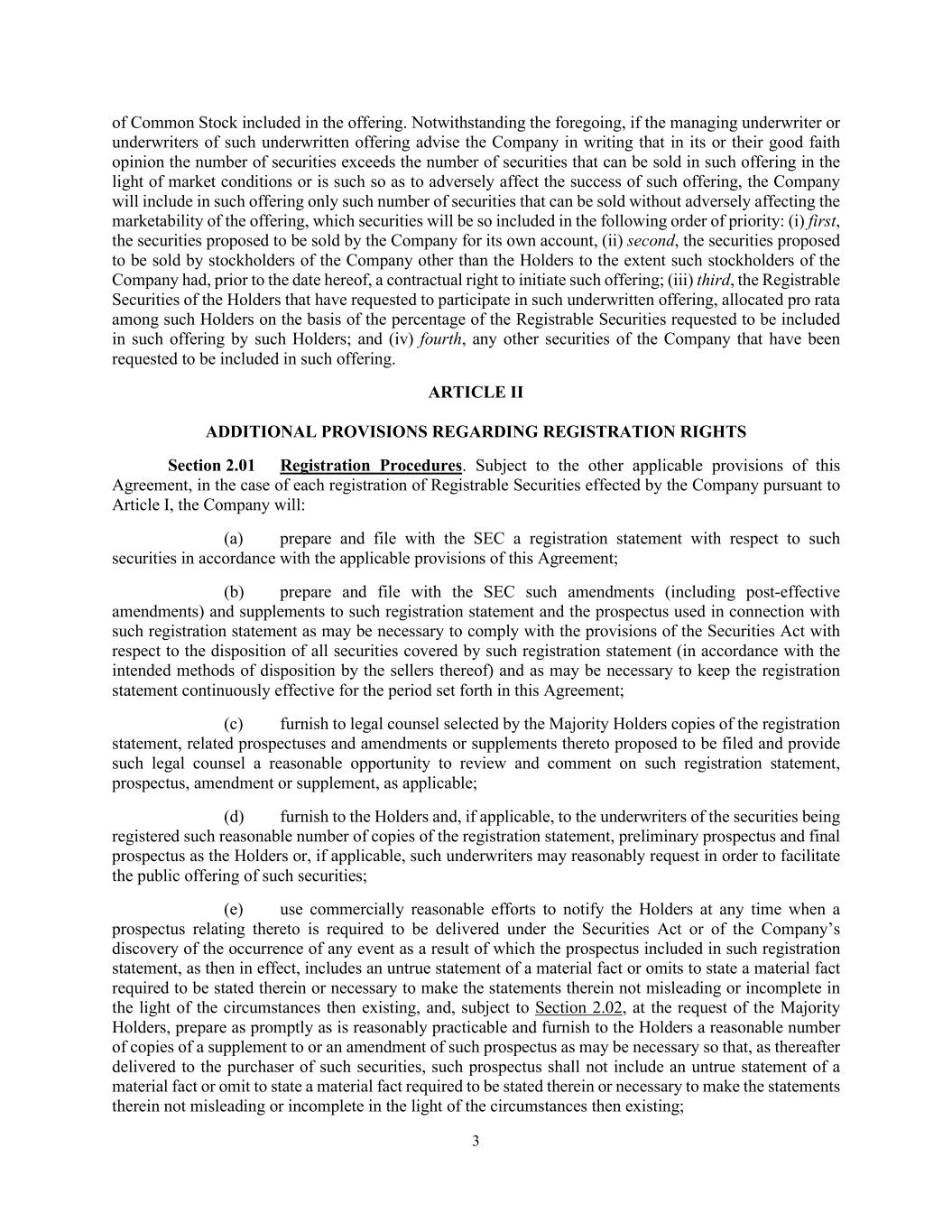 3 of Common Stock included in the offering. Notwithstanding the foregoing, if the managing underwriter or underwriters of such underwritten offering advise the Company in writing that in its or their good faith opinion the number of securities exceeds the number of securities that can be sold in such offering in the light of market conditions or is such so as to adversely affect the success of such offering, the Company will include in such offering only such number of securities that can be sold without adversely affecting the marketability of the offering, which securities will be so included in the following order of priority: (i) first, the securities proposed to be sold by the Company for its own account, (ii) second, the securities proposed to be sold by stockholders of the Company other than the Holders to the extent such stockholders of the Company had, prior to the date hereof, a contractual right to initiate such offering; (iii) third, the Registrable Securities of the Holders that have requested to participate in such underwritten offering, allocated pro rata among such Holders on the basis of the percentage of the Registrable Securities requested to be included in such offering by such Holders; and (iv) fourth, any other securities of the Company that have been requested to be included in such offering. ARTICLE II ADDITIONAL PROVISIONS REGARDING REGISTRATION RIGHTS Section 2.01 Registration Procedures. Subject to the other applicable provisions of this Agreement, in the case of each registration of Registrable Securities effected by the Company pursuant to Article I, the Company will: (a) prepare and file with the SEC a registration statement with respect to such securities in accordance with the applicable provisions of this Agreement; (b) prepare and file with the SEC such amendments (including post-effective amendments) and supplements to such registration statement and the prospectus used in connection with such registration statement as may be necessary to comply with the provisions of the Securities Act with respect to the disposition of all securities covered by such registration statement (in accordance with the intended methods of disposition by the sellers thereof) and as may be necessary to keep the registration statement continuously effective for the period set forth in this Agreement; (c) furnish to legal counsel selected by the Majority Holders copies of the registration statement, related prospectuses and amendments or supplements thereto proposed to be filed and provide such legal counsel a reasonable opportunity to review and comment on such registration statement, prospectus, amendment or supplement, as applicable; (d) furnish to the Holders and, if applicable, to the underwriters of the securities being registered such reasonable number of copies of the registration statement, preliminary prospectus and final prospectus as the Holders or, if applicable, such underwriters may reasonably request in order to facilitate the public offering of such securities; (e) use commercially reasonable efforts to notify the Holders at any time when a prospectus relating thereto is required to be delivered under the Securities Act or of the Company’s discovery of the occurrence of any event as a result of which the prospectus included in such registration statement, as then in effect, includes an untrue statement of a material fact or omits to state a material fact required to be stated therein or necessary to make the statements therein not misleading or incomplete in the light of the circumstances then existing, and, subject to Section 2.02, at the request of the Majority Holders, prepare as promptly as is reasonably practicable and furnish to the Holders a reasonable number of copies of a supplement to or an amendment of such prospectus as may be necessary so that, as thereafter delivered to the purchaser of such securities, such prospectus shall not include an untrue statement of a material fact or omit to state a material fact required to be stated therein or necessary to make the statements therein not misleading or incomplete in the light of the circumstances then existing;