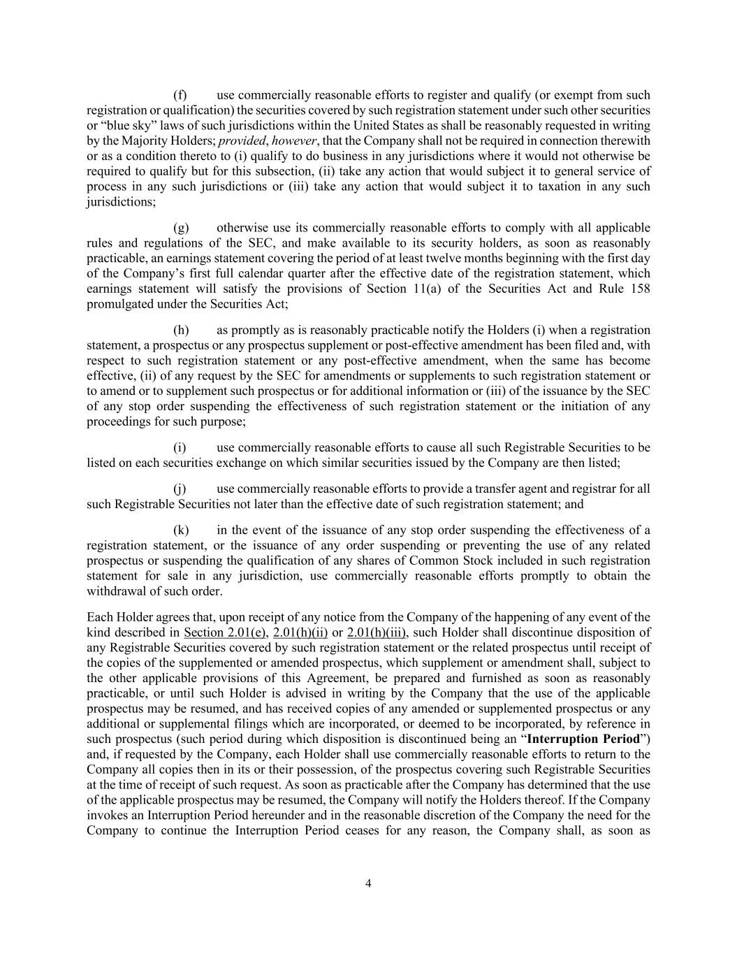 4 (f) use commercially reasonable efforts to register and qualify (or exempt from such registration or qualification) the securities covered by such registration statement under such other securities or “blue sky” laws of such jurisdictions within the United States as shall be reasonably requested in writing by the Majority Holders; provided, however, that the Company shall not be required in connection therewith or as a condition thereto to (i) qualify to do business in any jurisdictions where it would not otherwise be required to qualify but for this subsection, (ii) take any action that would subject it to general service of process in any such jurisdictions or (iii) take any action that would subject it to taxation in any such jurisdictions; (g) otherwise use its commercially reasonable efforts to comply with all applicable rules and regulations of the SEC, and make available to its security holders, as soon as reasonably practicable, an earnings statement covering the period of at least twelve months beginning with the first day of the Company’s first full calendar quarter after the effective date of the registration statement, which earnings statement will satisfy the provisions of Section 11(a) of the Securities Act and Rule 158 promulgated under the Securities Act; (h) as promptly as is reasonably practicable notify the Holders (i) when a registration statement, a prospectus or any prospectus supplement or post-effective amendment has been filed and, with respect to such registration statement or any post-effective amendment, when the same has become effective, (ii) of any request by the SEC for amendments or supplements to such registration statement or to amend or to supplement such prospectus or for additional information or (iii) of the issuance by the SEC of any stop order suspending the effectiveness of such registration statement or the initiation of any proceedings for such purpose; (i) use commercially reasonable efforts to cause all such Registrable Securities to be listed on each securities exchange on which similar securities issued by the Company are then listed; (j) use commercially reasonable efforts to provide a transfer agent and registrar for all such Registrable Securities not later than the effective date of such registration statement; and (k) in the event of the issuance of any stop order suspending the effectiveness of a registration statement, or the issuance of any order suspending or preventing the use of any related prospectus or suspending the qualification of any shares of Common Stock included in such registration statement for sale in any jurisdiction, use commercially reasonable efforts promptly to obtain the withdrawal of such order. Each Holder agrees that, upon receipt of any notice from the Company of the happening of any event of the kind described in Section 2.01(e), 2.01(h)(ii) or 2.01(h)(iii), such Holder shall discontinue disposition of any Registrable Securities covered by such registration statement or the related prospectus until receipt of the copies of the supplemented or amended prospectus, which supplement or amendment shall, subject to the other applicable provisions of this Agreement, be prepared and furnished as soon as reasonably practicable, or until such Holder is advised in writing by the Company that the use of the applicable prospectus may be resumed, and has received copies of any amended or supplemented prospectus or any additional or supplemental filings which are incorporated, or deemed to be incorporated, by reference in such prospectus (such period during which disposition is discontinued being an “Interruption Period”) and, if requested by the Company, each Holder shall use commercially reasonable efforts to return to the Company all copies then in its or their possession, of the prospectus covering such Registrable Securities at the time of receipt of such request. As soon as practicable after the Company has determined that the use of the applicable prospectus may be resumed, the Company will notify the Holders thereof. If the Company invokes an Interruption Period hereunder and in the reasonable discretion of the Company the need for the Company to continue the Interruption Period ceases for any reason, the Company shall, as soon as