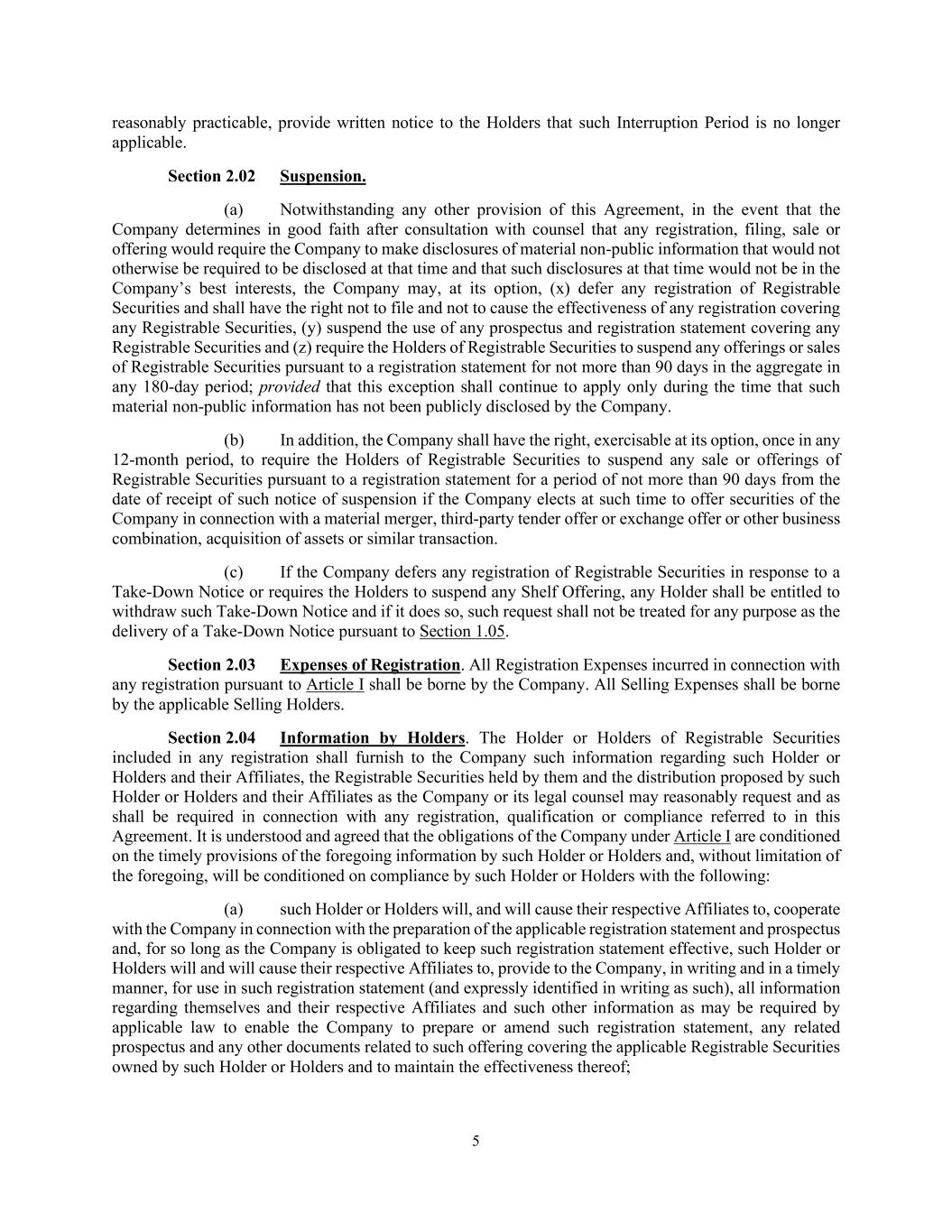 5 reasonably practicable, provide written notice to the Holders that such Interruption Period is no longer applicable. Section 2.02 Suspension. (a) Notwithstanding any other provision of this Agreement, in the event that the Company determines in good faith after consultation with counsel that any registration, filing, sale or offering would require the Company to make disclosures of material non-public information that would not otherwise be required to be disclosed at that time and that such disclosures at that time would not be in the Company’s best interests, the Company may, at its option, (x) defer any registration of Registrable Securities and shall have the right not to file and not to cause the effectiveness of any registration covering any Registrable Securities, (y) suspend the use of any prospectus and registration statement covering any Registrable Securities and (z) require the Holders of Registrable Securities to suspend any offerings or sales of Registrable Securities pursuant to a registration statement for not more than 90 days in the aggregate in any 180-day period; provided that this exception shall continue to apply only during the time that such material non-public information has not been publicly disclosed by the Company. (b) In addition, the Company shall have the right, exercisable at its option, once in any 12-month period, to require the Holders of Registrable Securities to suspend any sale or offerings of Registrable Securities pursuant to a registration statement for a period of not more than 90 days from the date of receipt of such notice of suspension if the Company elects at such time to offer securities of the Company in connection with a material merger, third-party tender offer or exchange offer or other business combination, acquisition of assets or similar transaction. (c) If the Company defers any registration of Registrable Securities in response to a Take-Down Notice or requires the Holders to suspend any Shelf Offering, any Holder shall be entitled to withdraw such Take-Down Notice and if it does so, such request shall not be treated for any purpose as the delivery of a Take-Down Notice pursuant to Section 1.05. Section 2.03 Expenses of Registration. All Registration Expenses incurred in connection with any registration pursuant to Article I shall be borne by the Company. All Selling Expenses shall be borne by the applicable Selling Holders. Section 2.04 Information by Holders. The Holder or Holders of Registrable Securities included in any registration shall furnish to the Company such information regarding such Holder or Holders and their Affiliates, the Registrable Securities held by them and the distribution proposed by such Holder or Holders and their Affiliates as the Company or its legal counsel may reasonably request and as shall be required in connection with any registration, qualification or compliance referred to in this Agreement. It is understood and agreed that the obligations of the Company under Article I are conditioned on the timely provisions of the foregoing information by such Holder or Holders and, without limitation of the foregoing, will be conditioned on compliance by such Holder or Holders with the following: (a) such Holder or Holders will, and will cause their respective Affiliates to, cooperate with the Company in connection with the preparation of the applicable registration statement and prospectus and, for so long as the Company is obligated to keep such registration statement effective, such Holder or Holders will and will cause their respective Affiliates to, provide to the Company, in writing and in a timely manner, for use in such registration statement (and expressly identified in writing as such), all information regarding themselves and their respective Affiliates and such other information as may be required by applicable law to enable the Company to prepare or amend such registration statement, any related prospectus and any other documents related to such offering covering the applicable Registrable Securities owned by such Holder or Holders and to maintain the effectiveness thereof;