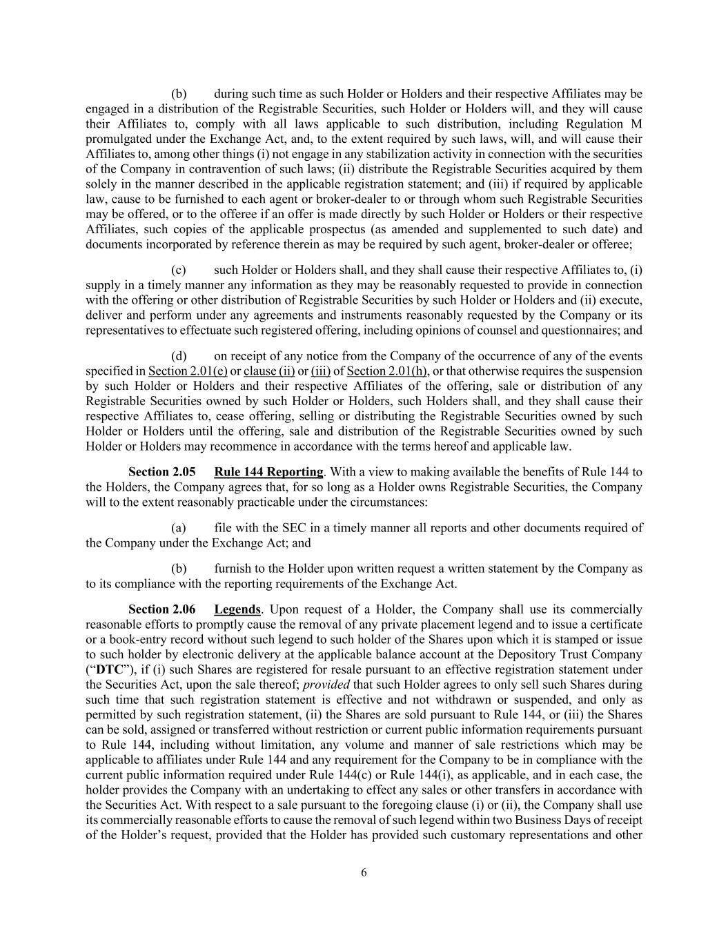 6 (b) during such time as such Holder or Holders and their respective Affiliates may be engaged in a distribution of the Registrable Securities, such Holder or Holders will, and they will cause their Affiliates to, comply with all laws applicable to such distribution, including Regulation M promulgated under the Exchange Act, and, to the extent required by such laws, will, and will cause their Affiliates to, among other things (i) not engage in any stabilization activity in connection with the securities of the Company in contravention of such laws; (ii) distribute the Registrable Securities acquired by them solely in the manner described in the applicable registration statement; and (iii) if required by applicable law, cause to be furnished to each agent or broker-dealer to or through whom such Registrable Securities may be offered, or to the offeree if an offer is made directly by such Holder or Holders or their respective Affiliates, such copies of the applicable prospectus (as amended and supplemented to such date) and documents incorporated by reference therein as may be required by such agent, broker-dealer or offeree; (c) such Holder or Holders shall, and they shall cause their respective Affiliates to, (i) supply in a timely manner any information as they may be reasonably requested to provide in connection with the offering or other distribution of Registrable Securities by such Holder or Holders and (ii) execute, deliver and perform under any agreements and instruments reasonably requested by the Company or its representatives to effectuate such registered offering, including opinions of counsel and questionnaires; and (d) on receipt of any notice from the Company of the occurrence of any of the events specified in Section 2.01(e) or clause (ii) or (iii) of Section 2.01(h), or that otherwise requires the suspension by such Holder or Holders and their respective Affiliates of the offering, sale or distribution of any Registrable Securities owned by such Holder or Holders, such Holders shall, and they shall cause their respective Affiliates to, cease offering, selling or distributing the Registrable Securities owned by such Holder or Holders until the offering, sale and distribution of the Registrable Securities owned by such Holder or Holders may recommence in accordance with the terms hereof and applicable law. Section 2.05 Rule 144 Reporting. With a view to making available the benefits of Rule 144 to the Holders, the Company agrees that, for so long as a Holder owns Registrable Securities, the Company will to the extent reasonably practicable under the circumstances: (a) file with the SEC in a timely manner all reports and other documents required of the Company under the Exchange Act; and (b) furnish to the Holder upon written request a written statement by the Company as to its compliance with the reporting requirements of the Exchange Act. Section 2.06 Legends. Upon request of a Holder, the Company shall use its commercially reasonable efforts to promptly cause the removal of any private placement legend and to issue a certificate or a book-entry record without such legend to such holder of the Shares upon which it is stamped or issue to such holder by electronic delivery at the applicable balance account at the Depository Trust Company (“DTC”), if (i) such Shares are registered for resale pursuant to an effective registration statement under the Securities Act, upon the sale thereof; provided that such Holder agrees to only sell such Shares during such time that such registration statement is effective and not withdrawn or suspended, and only as permitted by such registration statement, (ii) the Shares are sold pursuant to Rule 144, or (iii) the Shares can be sold, assigned or transferred without restriction or current public information requirements pursuant to Rule 144, including without limitation, any volume and manner of sale restrictions which may be applicable to affiliates under Rule 144 and any requirement for the Company to be in compliance with the current public information required under Rule 144(c) or Rule 144(i), as applicable, and in each case, the holder provides the Company with an undertaking to effect any sales or other transfers in accordance with the Securities Act. With respect to a sale pursuant to the foregoing clause (i) or (ii), the Company shall use its commercially reasonable efforts to cause the removal of such legend within two Business Days of receipt of the Holder’s request, provided that the Holder has provided such customary representations and other